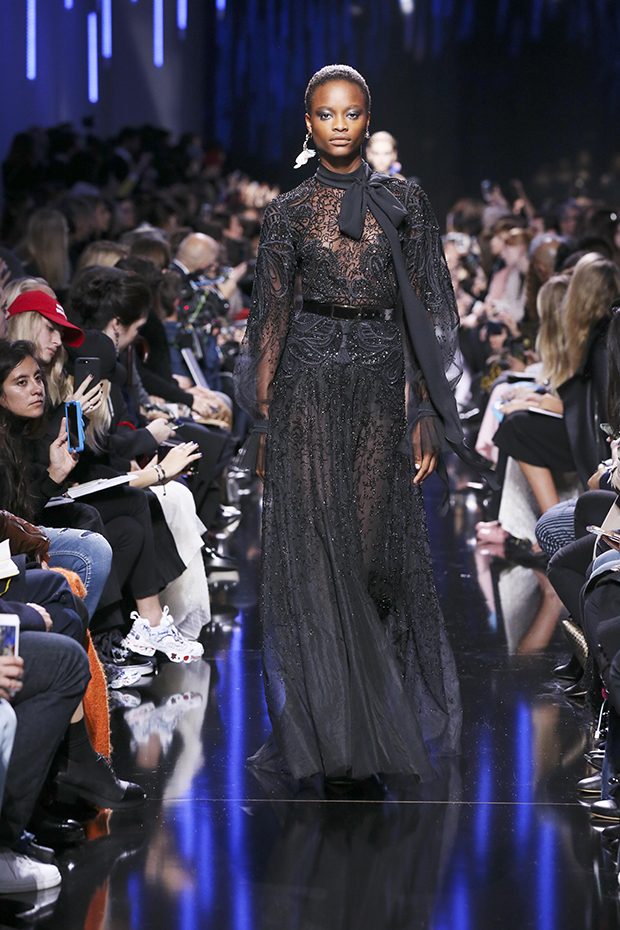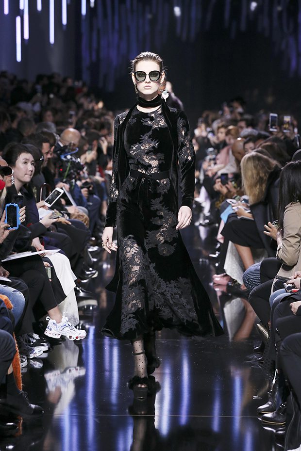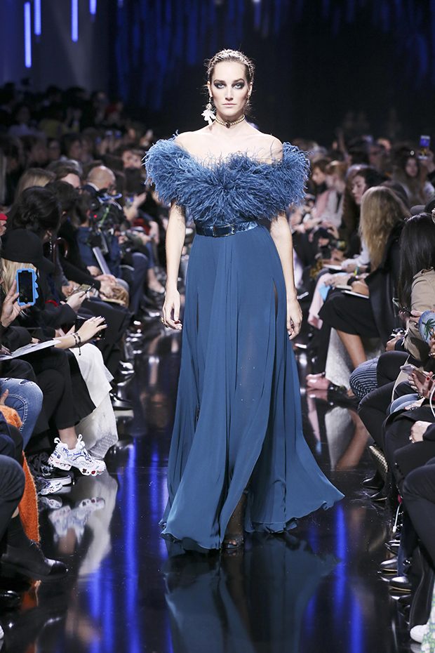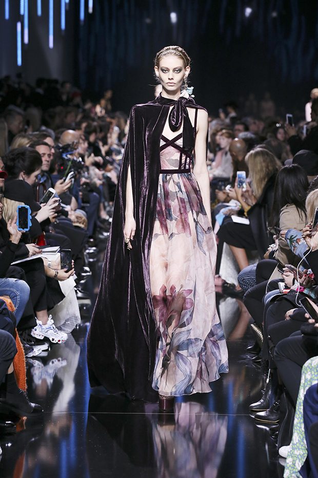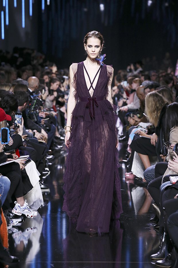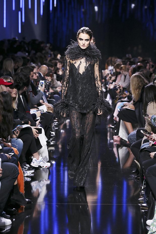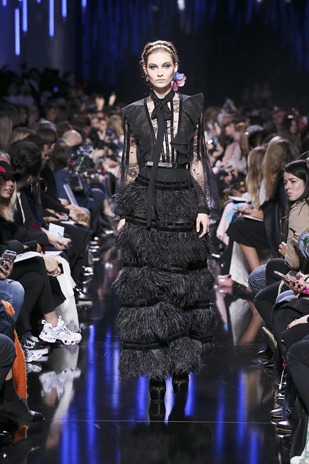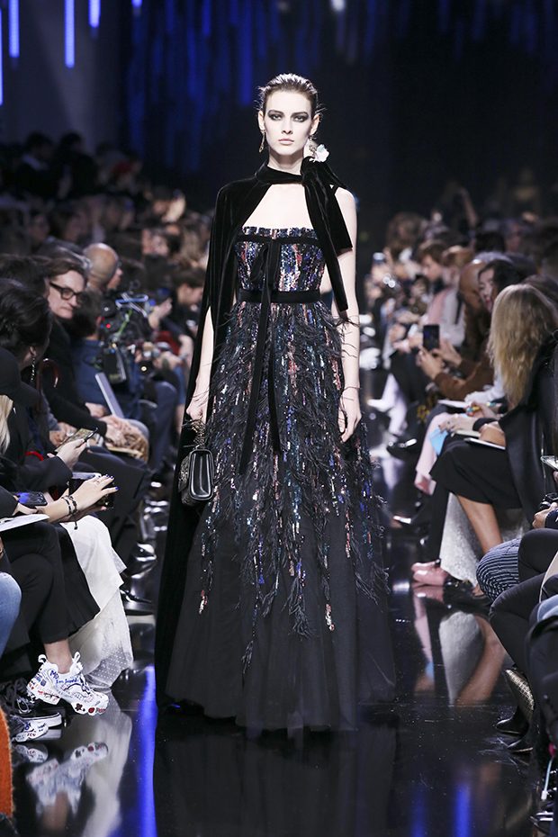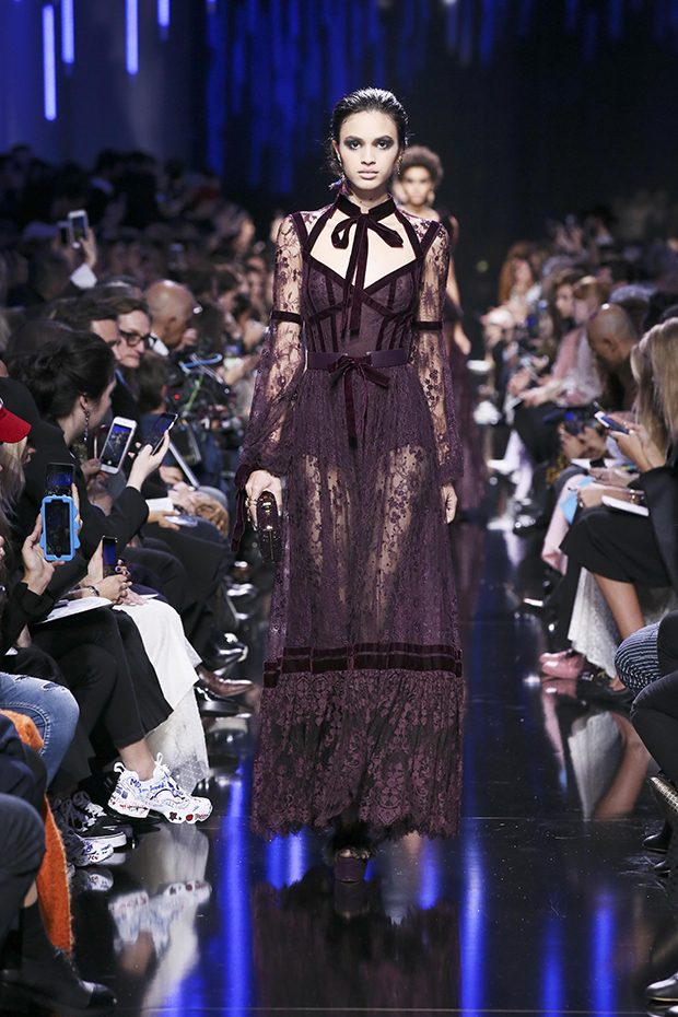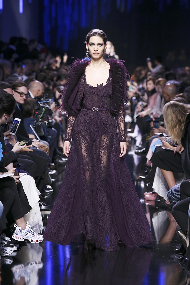 An ethereal lightness uplifts form, mood, and movement amidst a seasonal return to dark romanticism. Fabrics such as tulle, organza and silk chiffon add an intoxicating delicacy to the collection while lace, feathers and embroidered velvet add a textural, sensual blend of innocence and melancholy. Light layering abounds. A shadow of mystery stretches across the collection with diaphanous silhouettes for day and night. – from Elie Saab