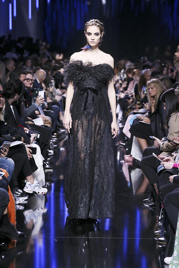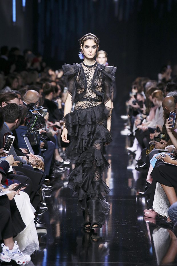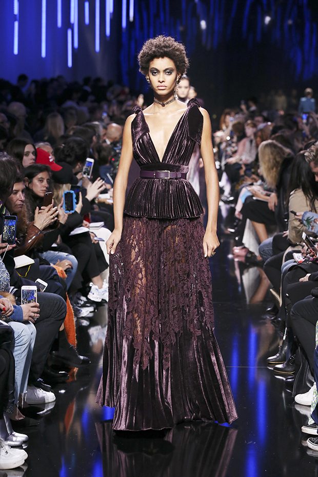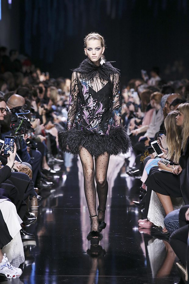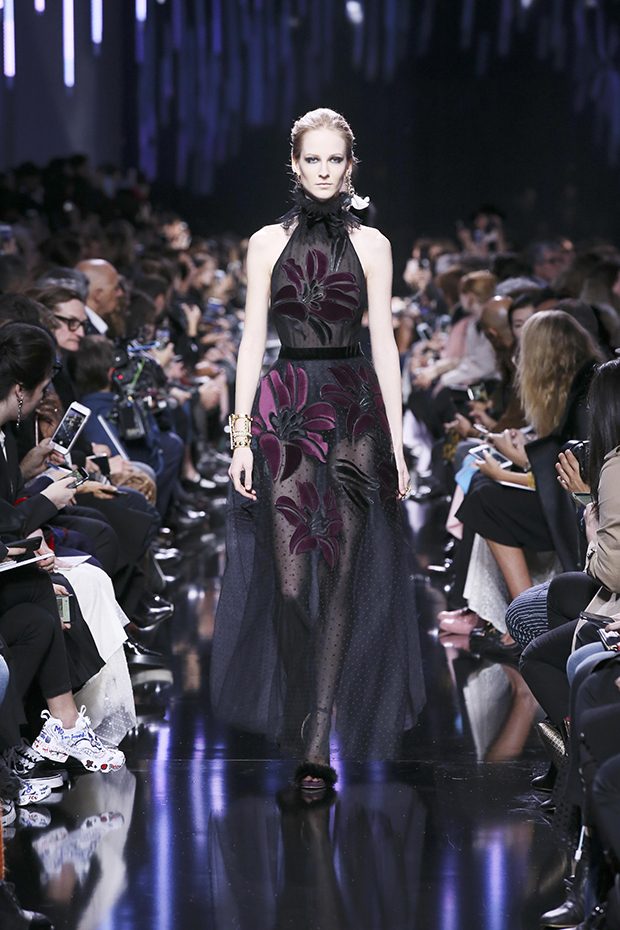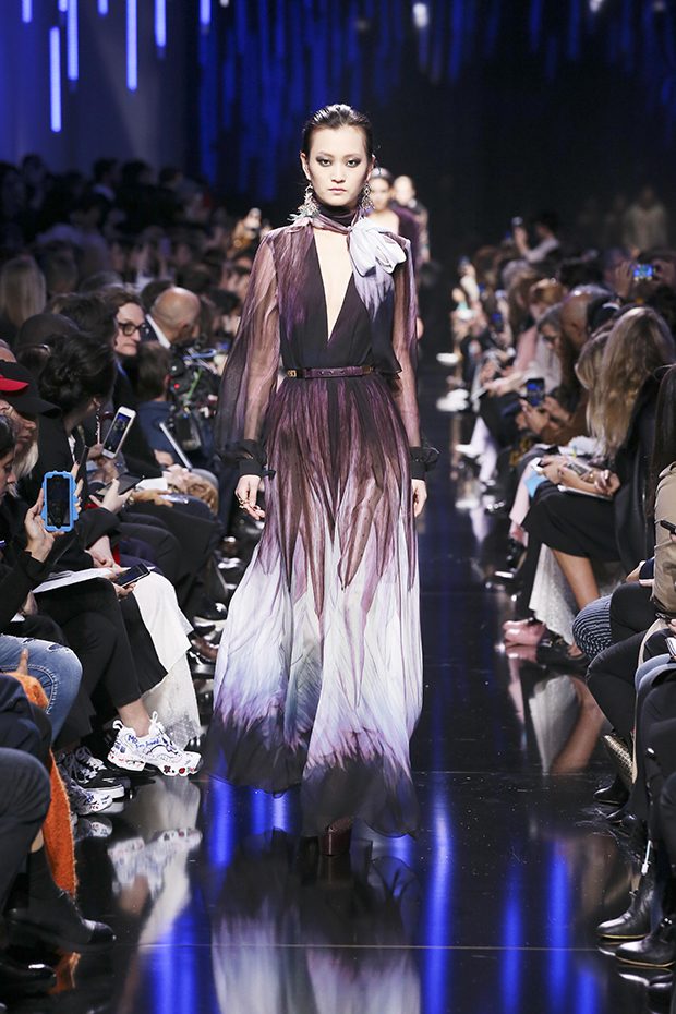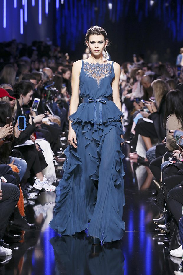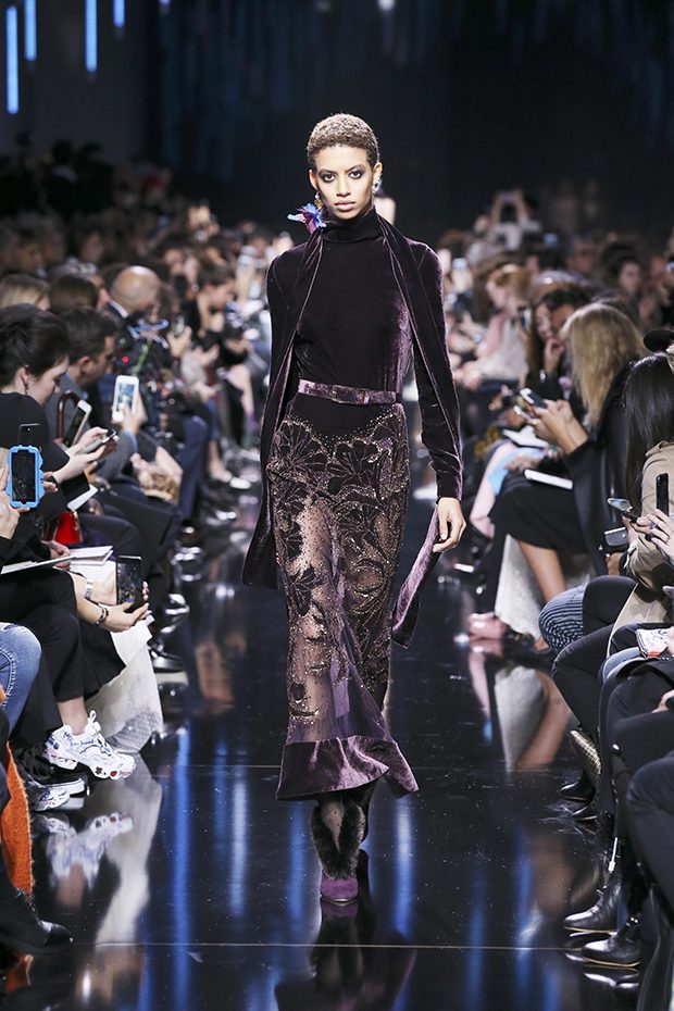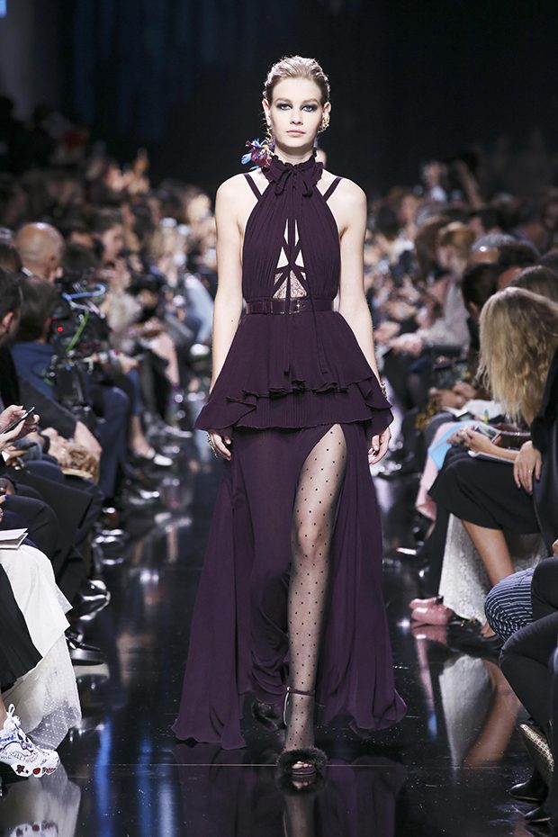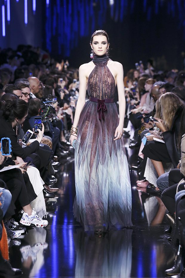 An ethereal lightness uplifts form, mood, and movement amidst a seasonal return to dark romanticism. Fabrics such as tulle, organza and silk chiffon add an intoxicating delicacy to the collection while lace, feathers and embroidered velvet add a textural, sensual blend of innocence and melancholy. Light layering abounds. A shadow of mystery stretches across the collection with diaphanous silhouettes for day and night. – from Elie Saab
