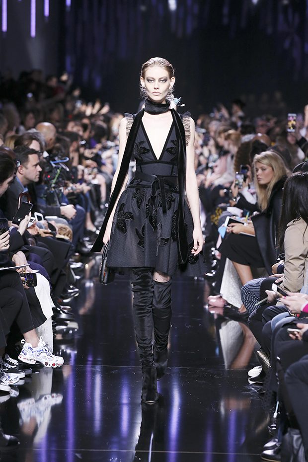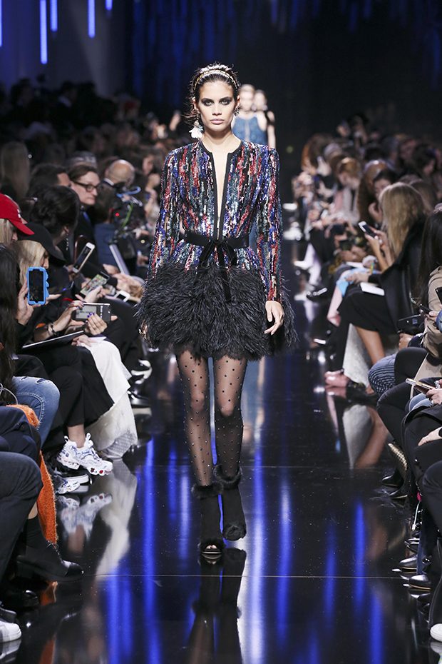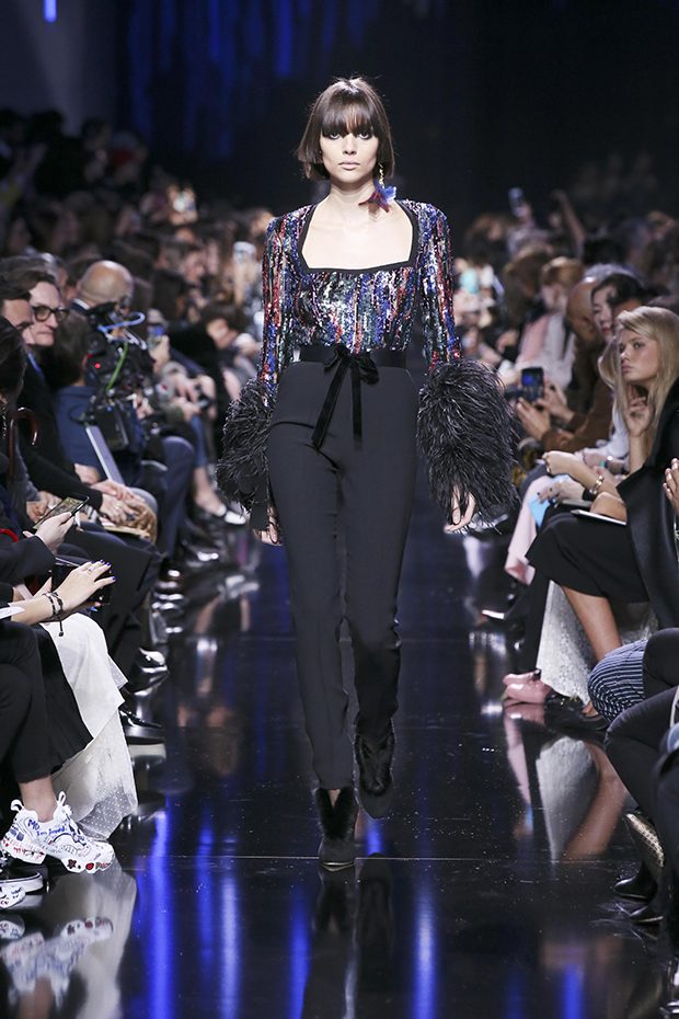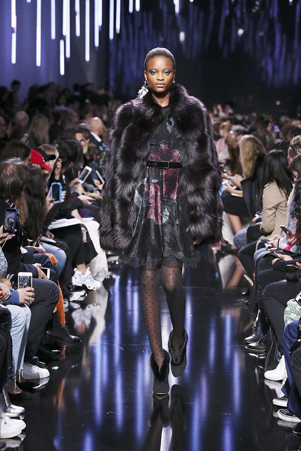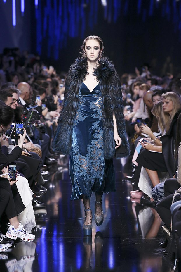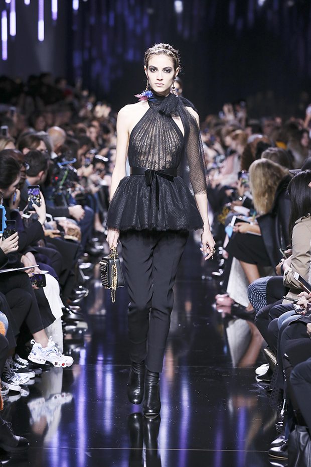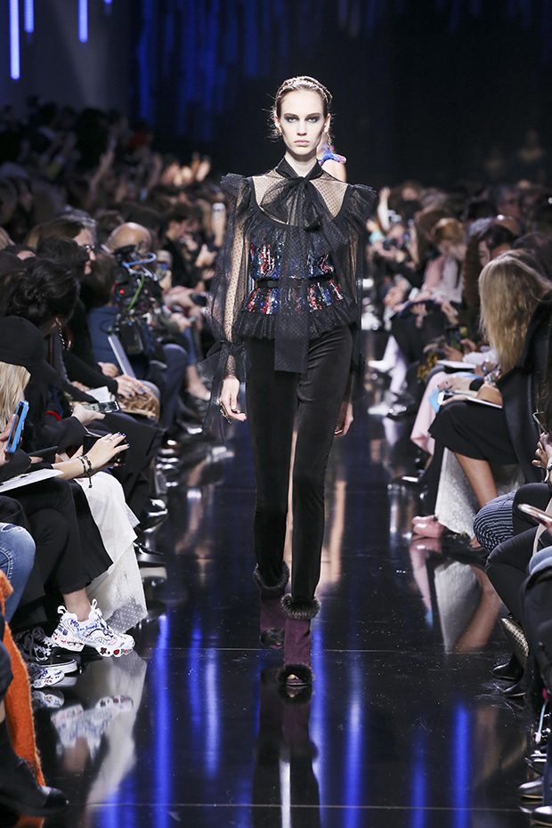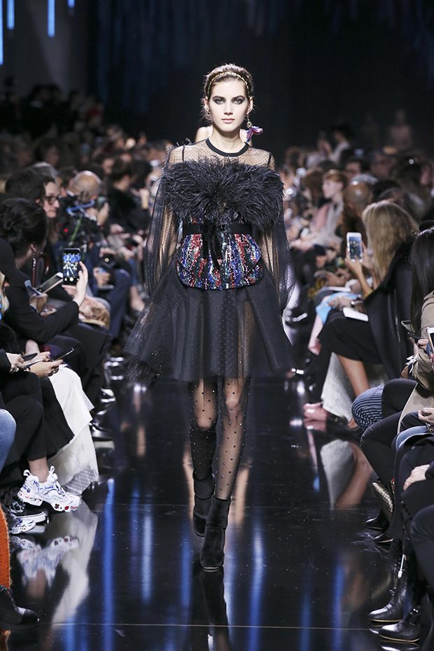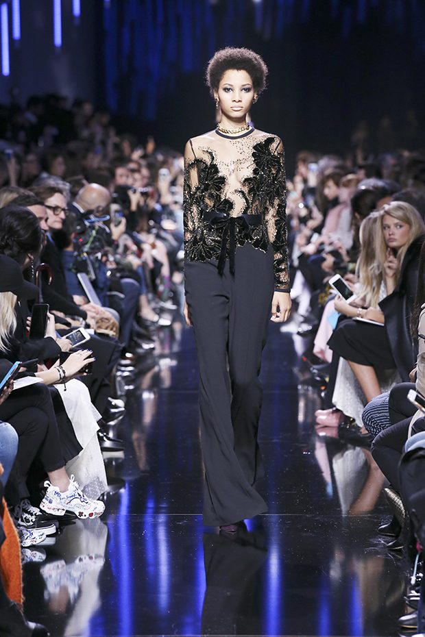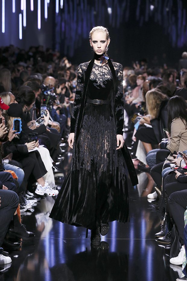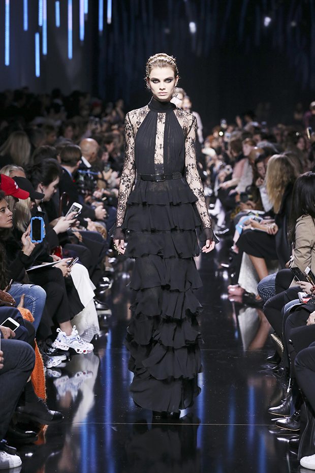 An ethereal lightness uplifts form, mood, and movement amidst a seasonal return to dark romanticism. Fabrics such as tulle, organza and silk chiffon add an intoxicating delicacy to the collection while lace, feathers and embroidered velvet add a textural, sensual blend of innocence and melancholy. Light layering abounds. A shadow of mystery stretches across the collection with diaphanous silhouettes for day and night. – from Elie Saab