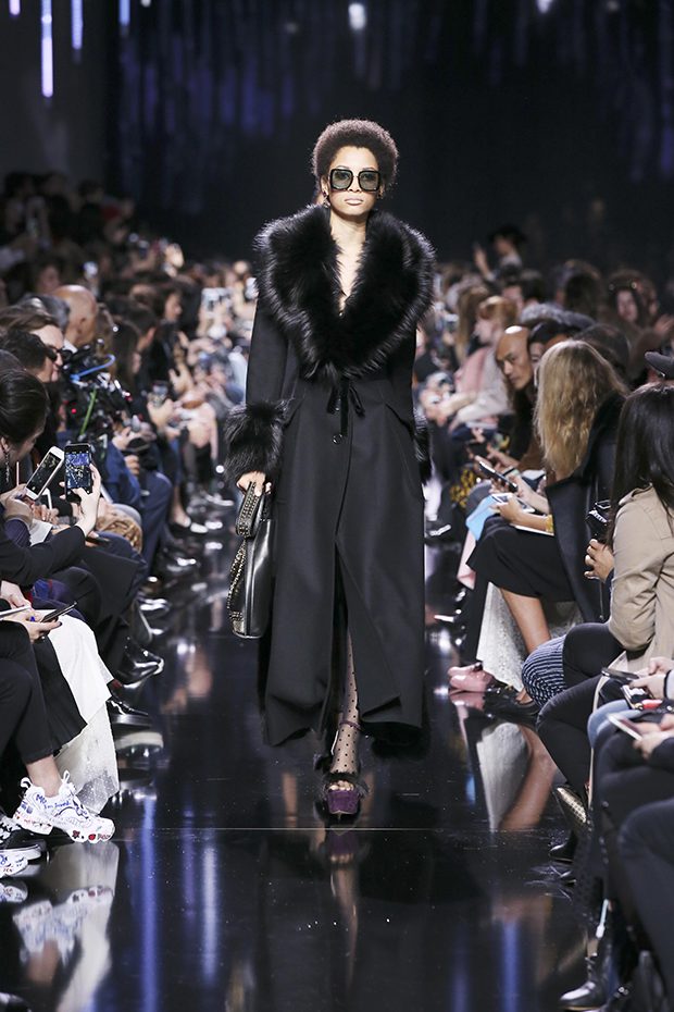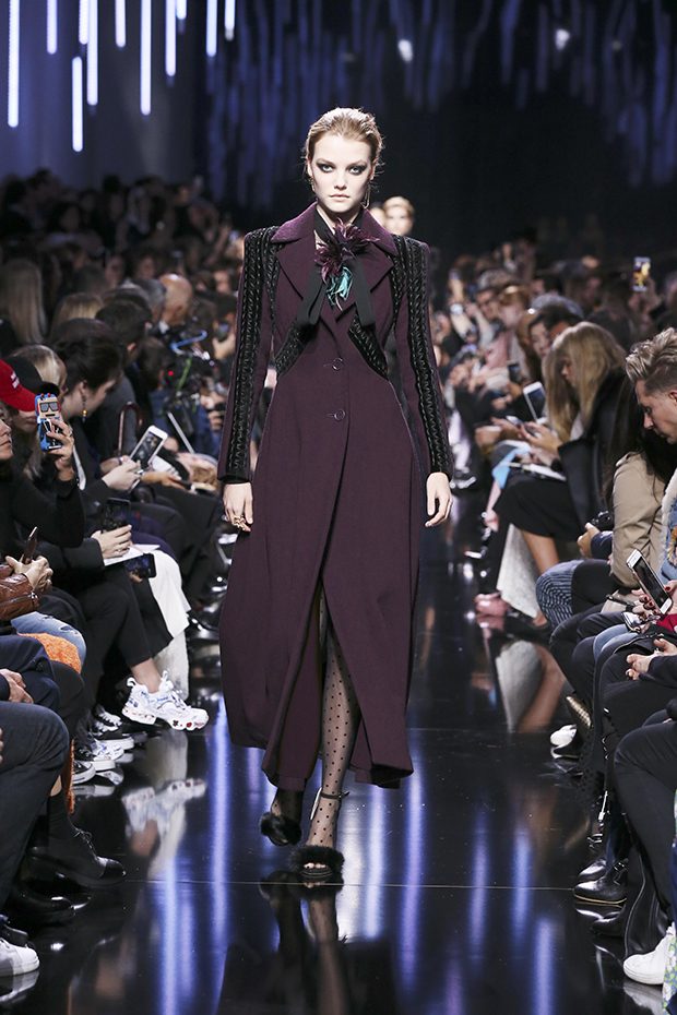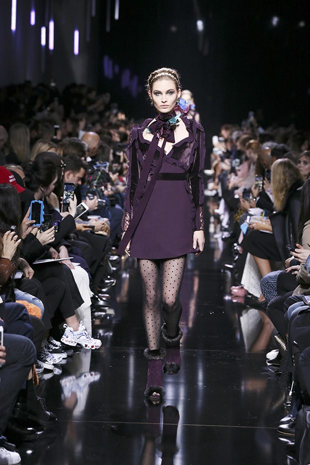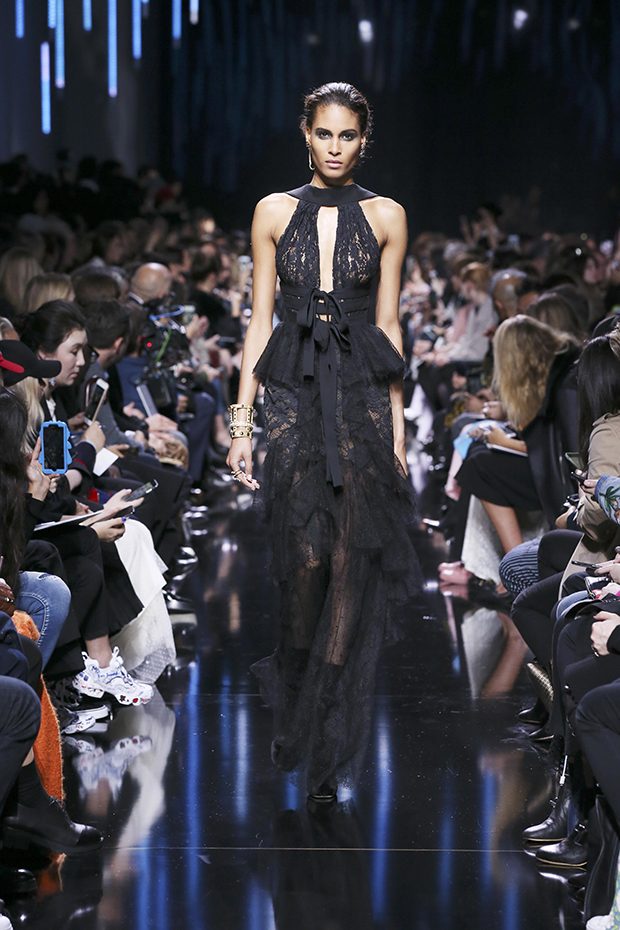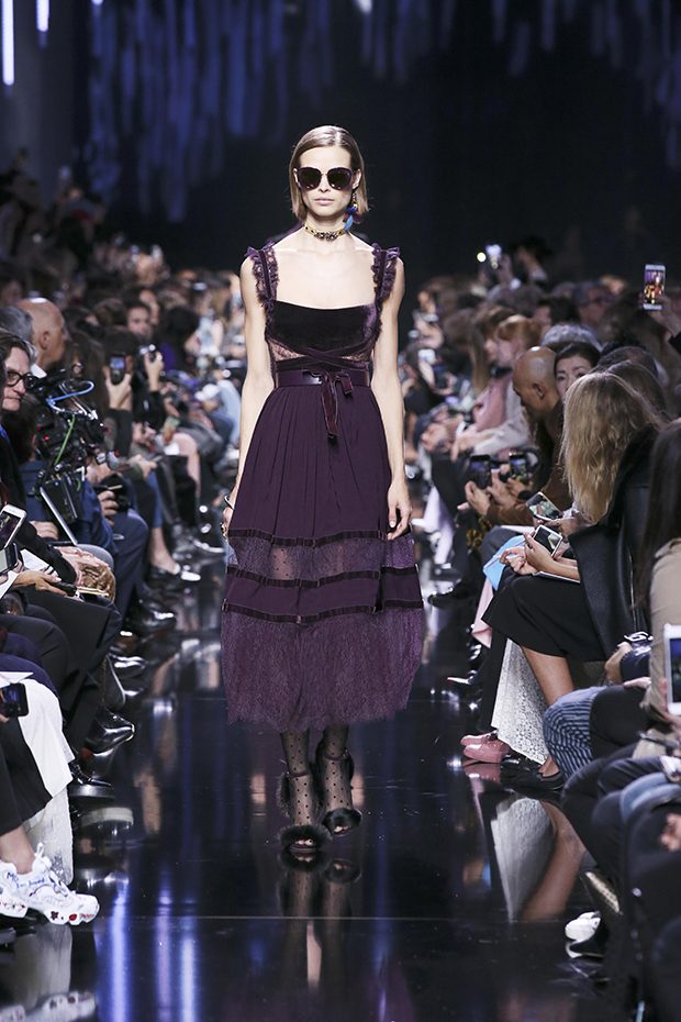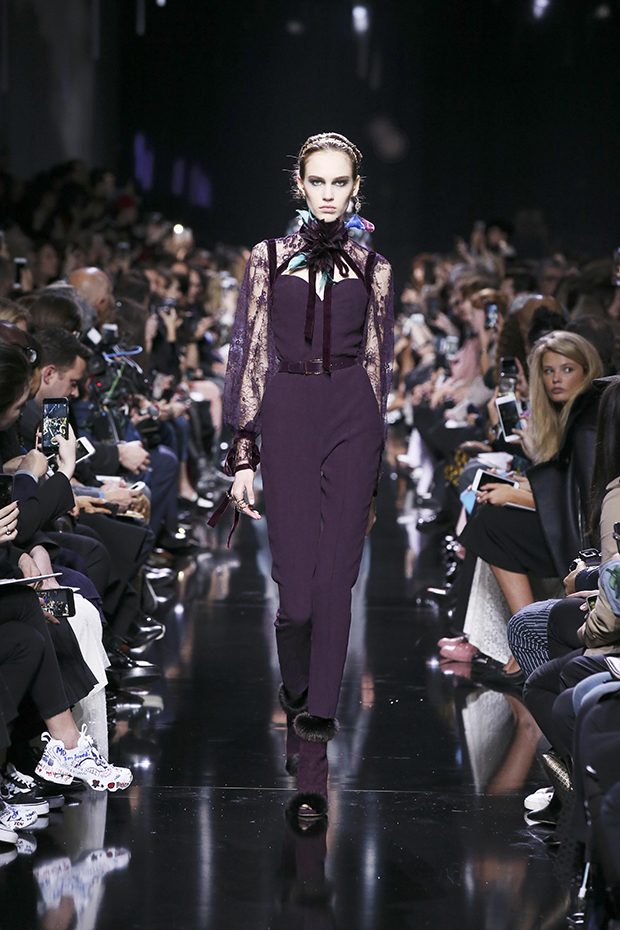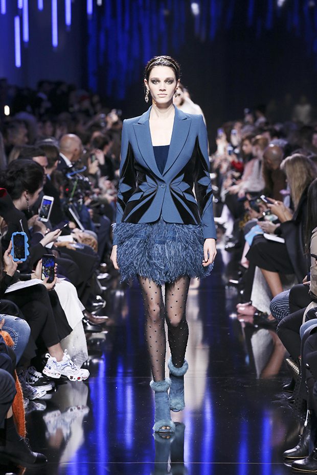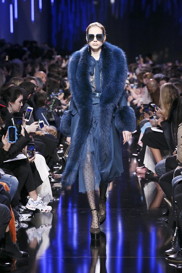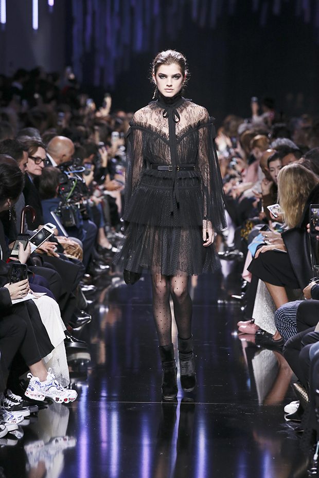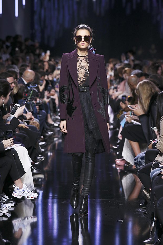 An ethereal lightness uplifts form, mood, and movement amidst a seasonal return to dark romanticism. Fabrics such as tulle, organza and silk chiffon add an intoxicating delicacy to the collection while lace, feathers and embroidered velvet add a textural, sensual blend of innocence and melancholy. Light layering abounds. A shadow of mystery stretches across the collection with diaphanous silhouettes for day and night. – from Elie Saab