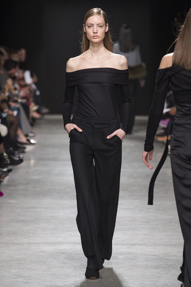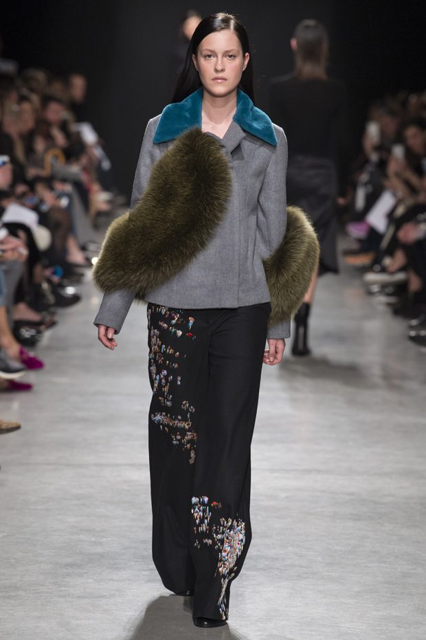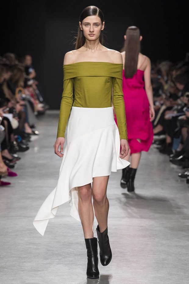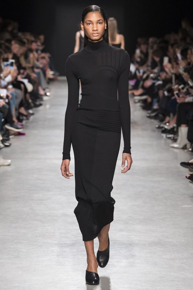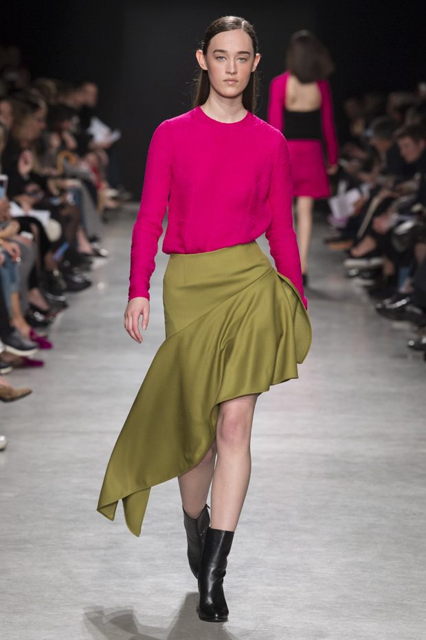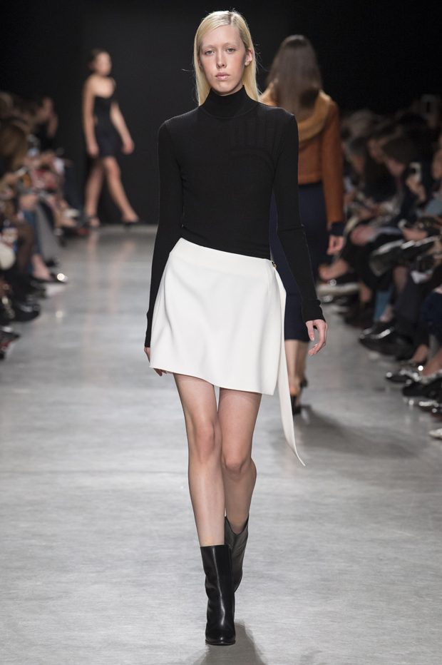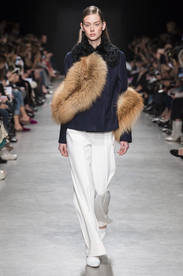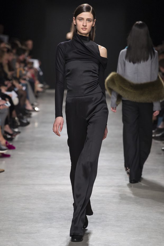 The Winter 2017 collection of the Maison began by going back through the archives, and two photographs: one by Patrick Bertrand of the Guy Laroche Haute Couture collection 1971 titled « Nuit Noire en crêpe »; and another by W. Marshall for the Guy Laroche Haute Couture collection 1972 entitled “Fourrier prend couleurs”. These photographs depicted a woman in a seductive long black crepe dress and another in a fur coat respectively. The collection delves into its Seventies archives, when its clothes were in equal parts alluring and luxurious, and most importantly, dedicated to celebrating the female form. The designs are sharp without being minimalistic: they are precise, meticulously cut, and streamlined to revisit timeless essentials with a modern twist. – from Guy Laroche