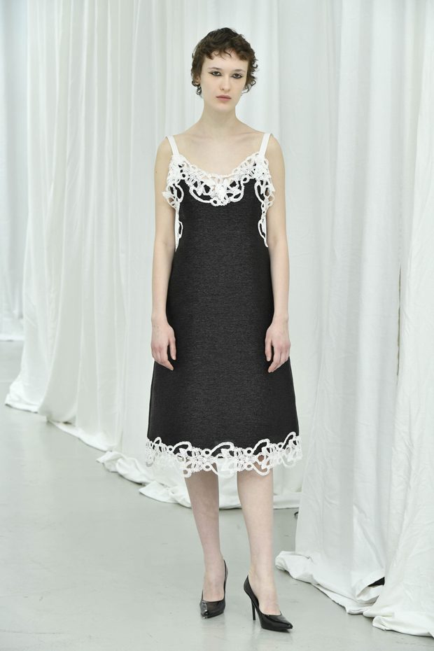 Pushing the envelope of femininity and embellishment in a modern way, Jourden goes baroque for this Fall Winter 2017 season. But as exuberant as some of the fabrics, volumes and clothes are, the collection – plumped with fancy, fun combinations – stays rooted in reality. Swirling lacy motifs embroidered on tulle create a dazzling impact on white or cobalt blue dresses and skirts, with sculptural volumes coming from bold undulating ruffles. Delicate and artsy lace trims trace the hems and necklines of structured slip dresses and minis in classic or jeweled tones. A rich psychedelic vibe pulses in the bold metallic paisley fabrics used on quilted robe coats, dresses and skirts cinched with a metallic lace frill, with volumes created from the use of two slightly different lengths at theback and front. A metallic shimmer animates the horizontal corduroy texture of cocktail dresses and skirts combined with laminated lace, or the iridescent surface of the signature Jourden jean jacket shape worn with micro shorts or cropped pants trimmed with oversized crochet lace. – from Jourden