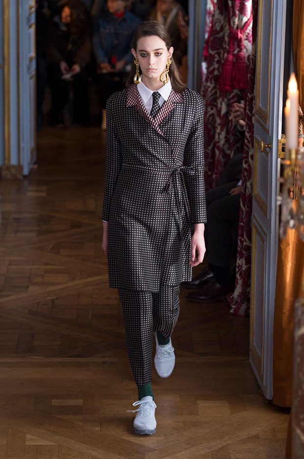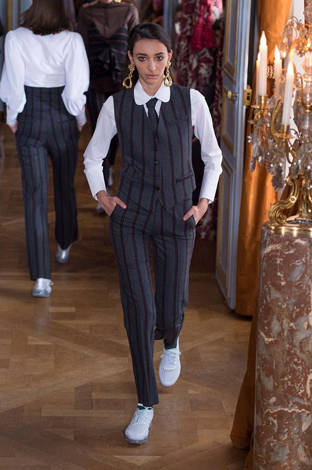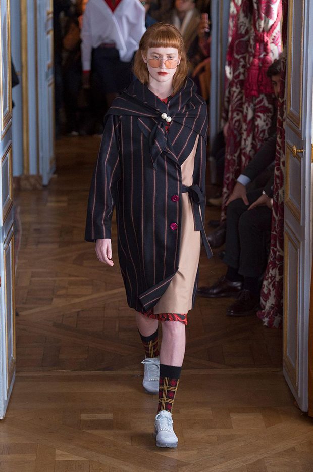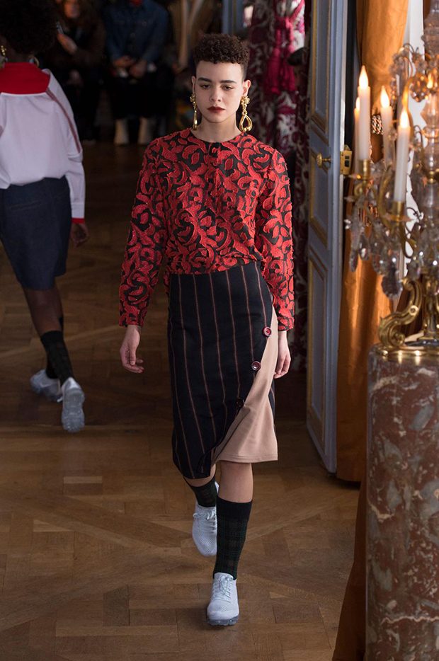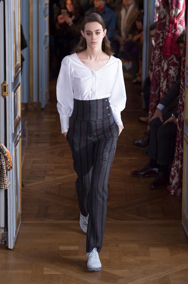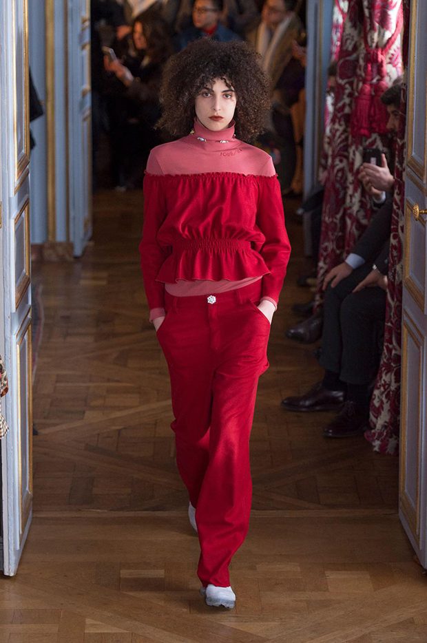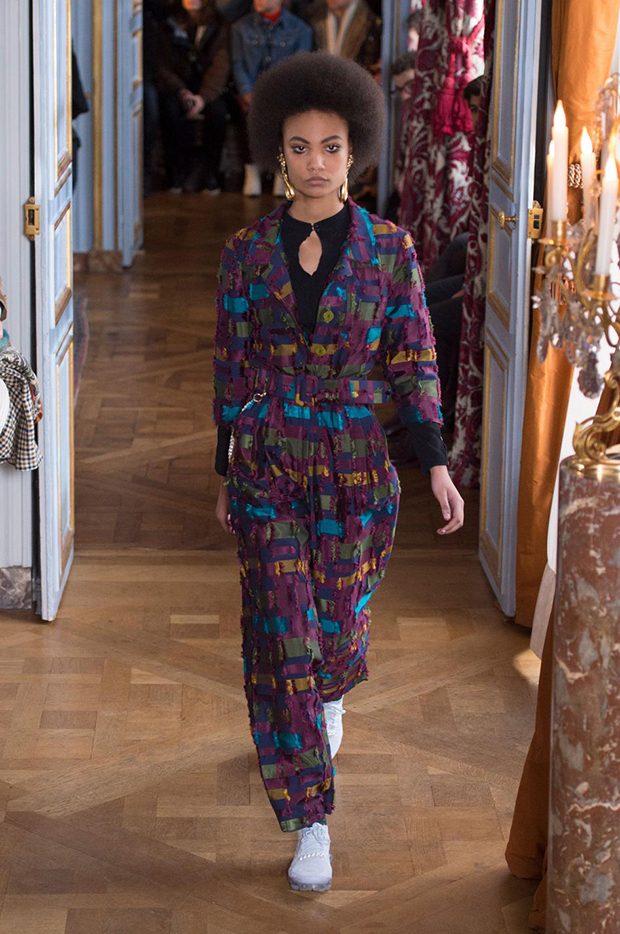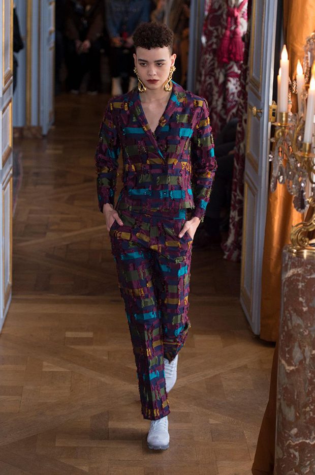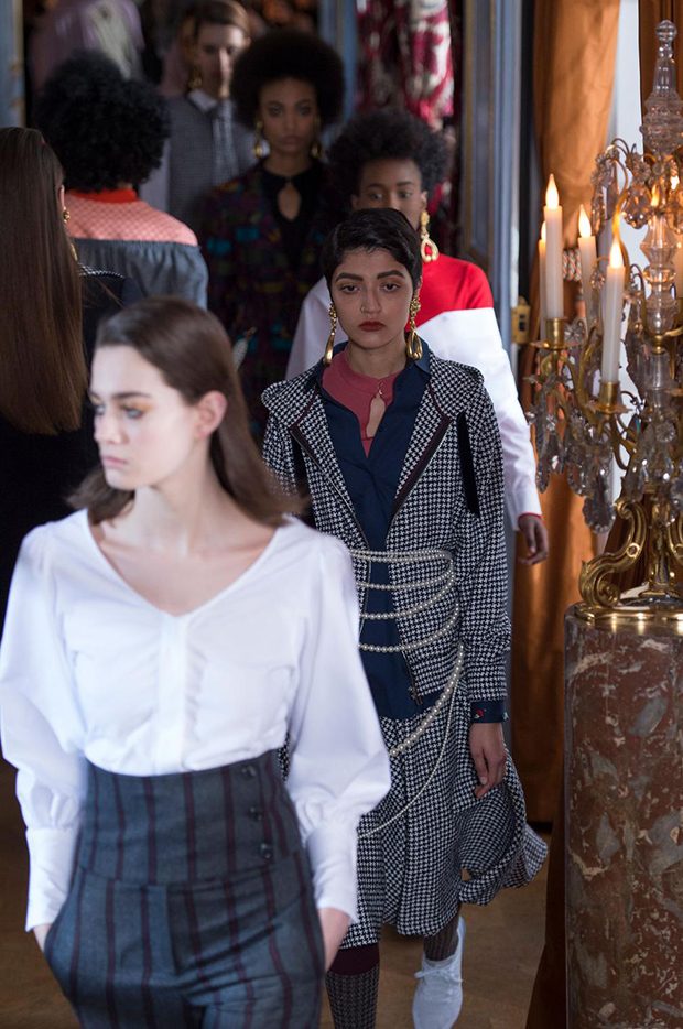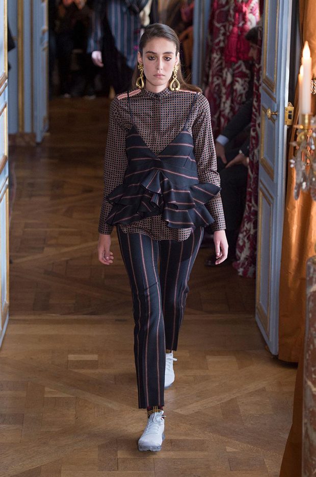 JOUR/NE presented Autumn Winter 2017/18 collection during the Paris Fashion Week. Inspired by Wes Anderson’s Darjeeling Limited, the collection combines tailoring with the male wardrobe, featuring three-piece suits, high waisted trousers, patchwork fabric.