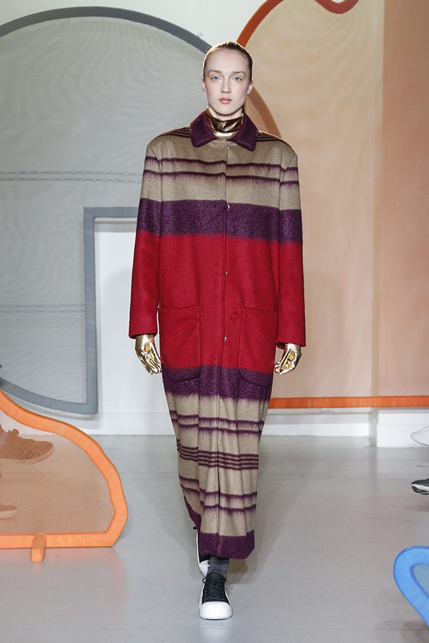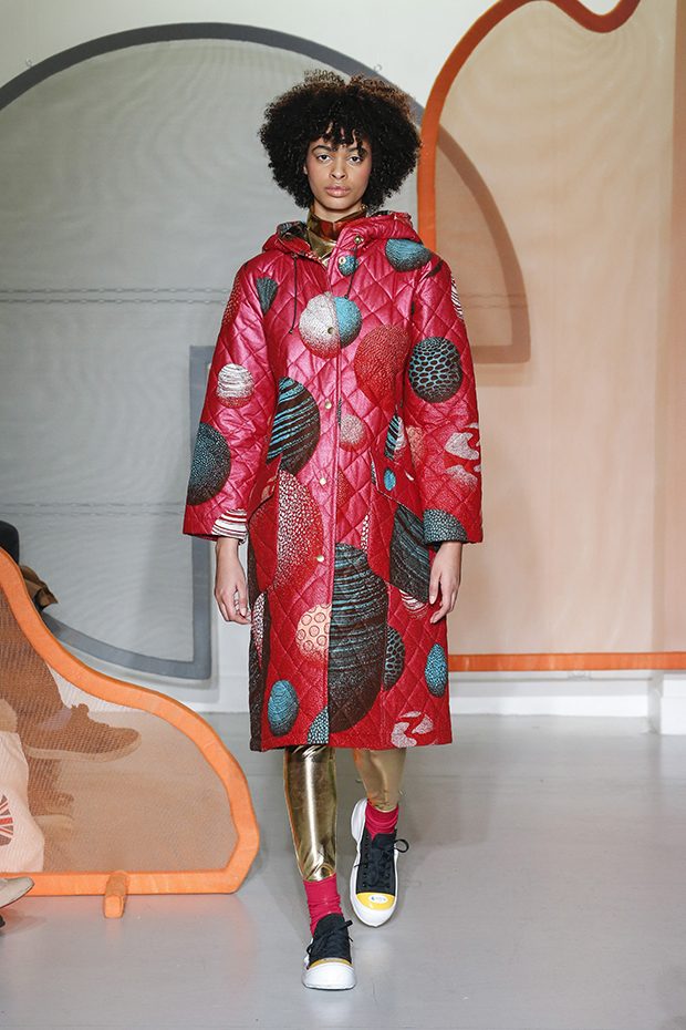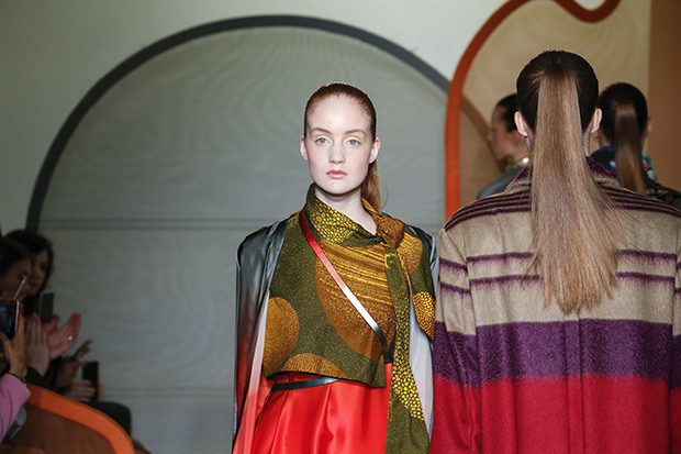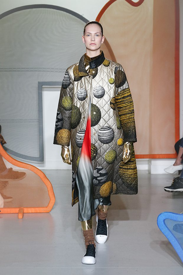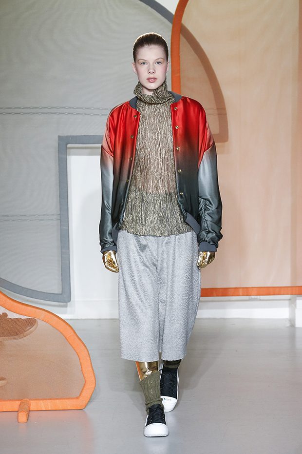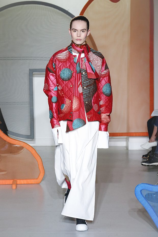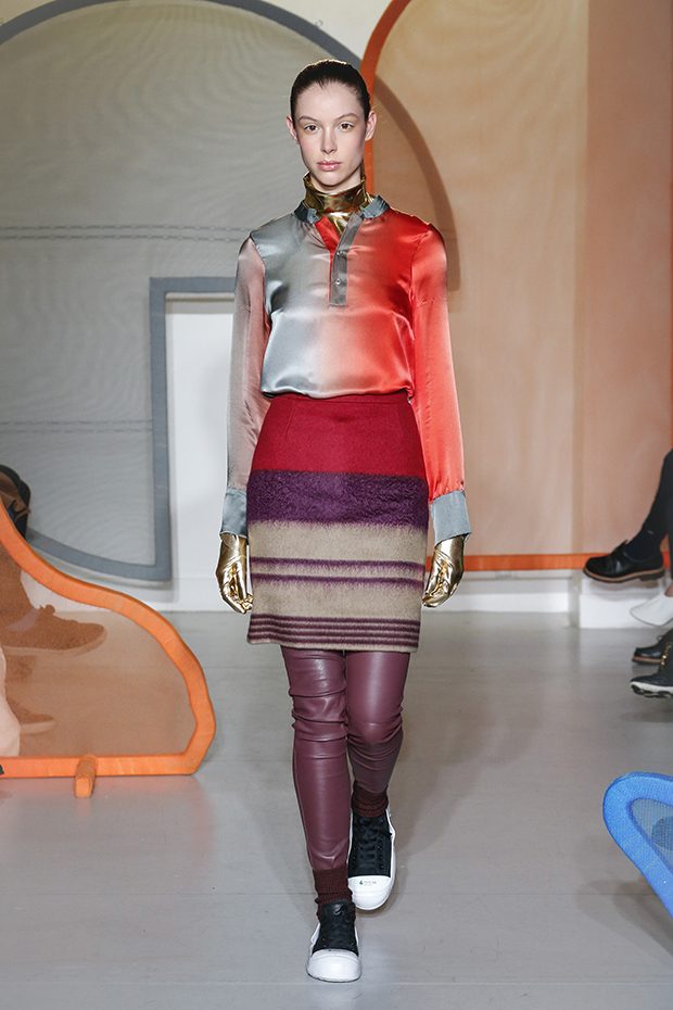 By prioritizing human unity and freedom, Frowijn’s fall-winter 2017 collection is an outdoor rather than sporty proposal, while still attaching herself to the sophisticated prints she has always gone for. Throughout her collection there were shades of grey and red, yellow and blue, colors that Eikelenboom often used. References to colors of India were also considered, in order to show a new possible world or a new perspective for a referential metropolis today. Frowijn created gradient prints for silk and wool fabrics that show the transition the world is in at the moment as well as working with Dutch VLISCO-wax patterns. – from Liselore Frowijn
