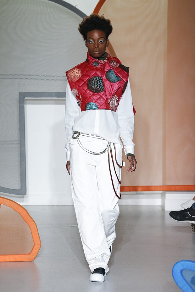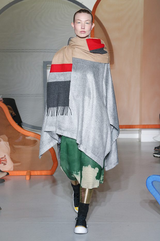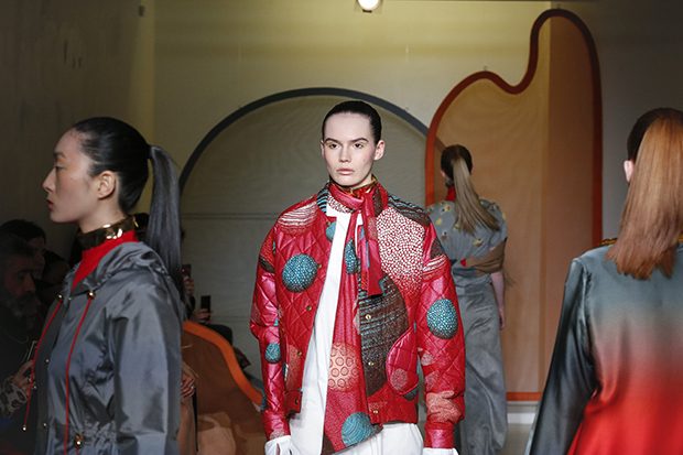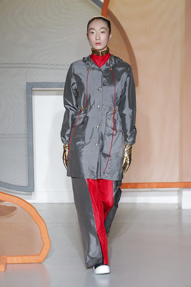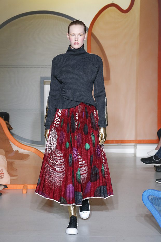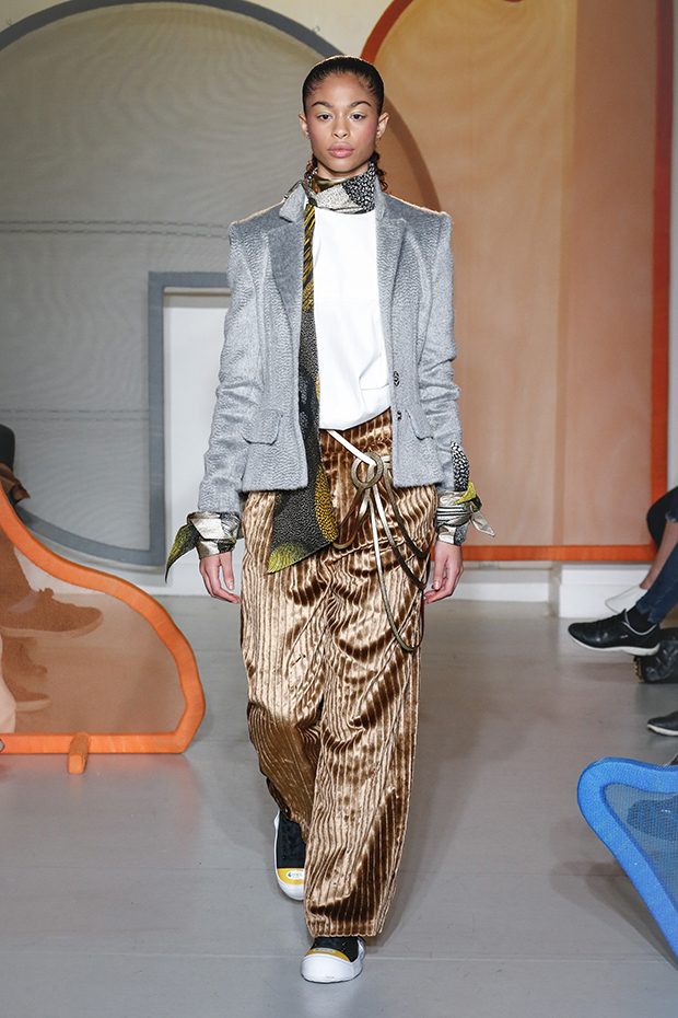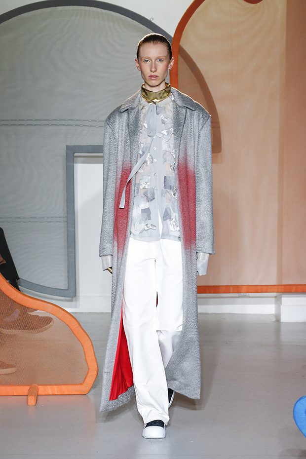 By prioritizing human unity and freedom, Frowijn’s fall-winter 2017 collection is an outdoor rather than sporty proposal, while still attaching herself to the sophisticated prints she has always gone for. Throughout her collection there were shades of grey and red, yellow and blue, colors that Eikelenboom often used. References to colors of India were also considered, in order to show a new possible world or a new perspective for a referential metropolis today. Frowijn created gradient prints for silk and wool fabrics that show the transition the world is in at the moment as well as working with Dutch VLISCO-wax patterns. – from Liselore Frowijn