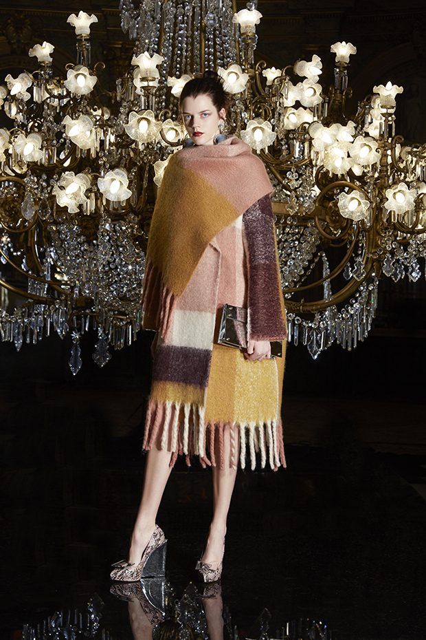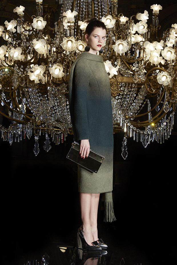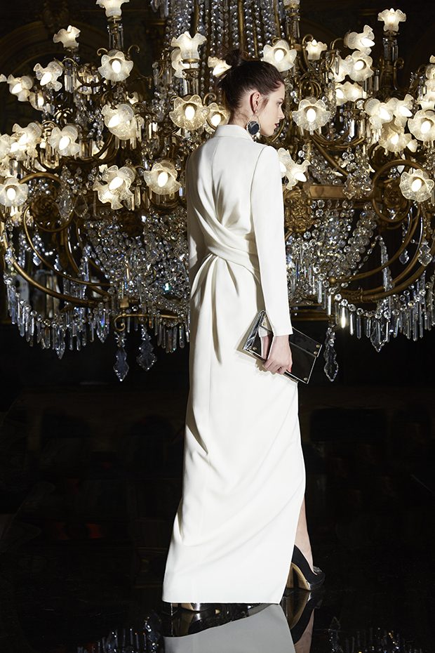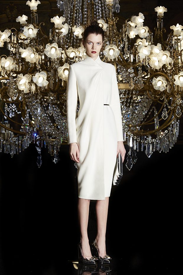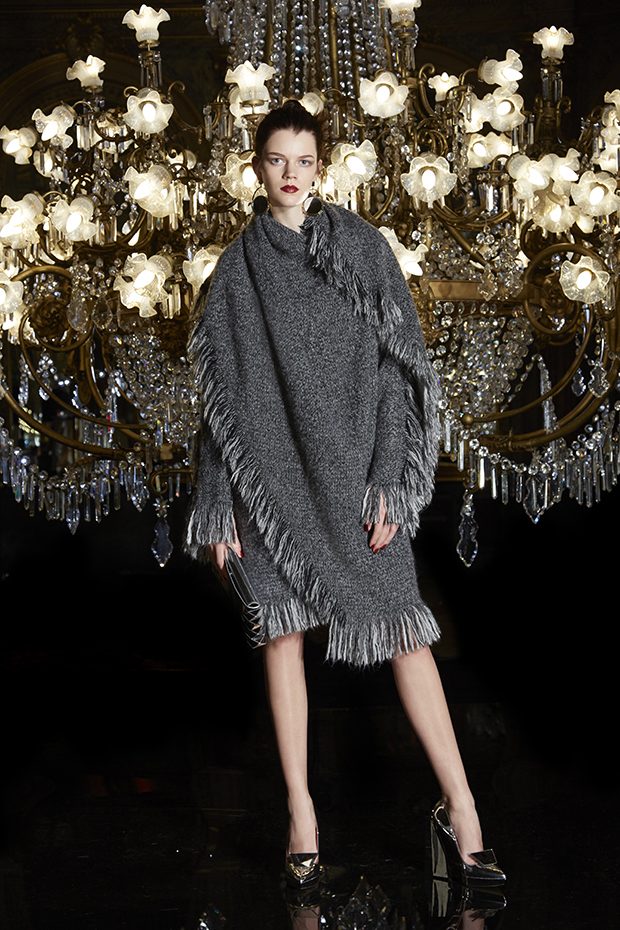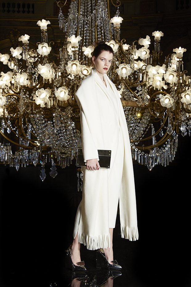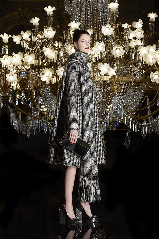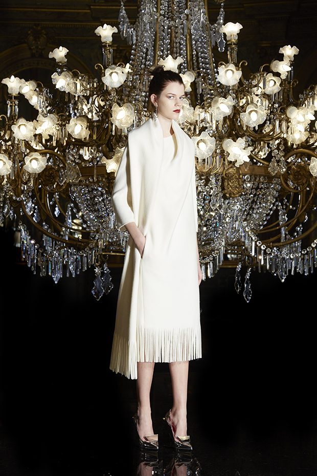 The Paule Ka woman, empowered and cultured, active and elegant, emerges from the modernity woven into the very fabric of this collection, reconnecting Paris with its deeply elegant roots. Structure opens the way, with precisely draped coats cocooning the body as an embrace of lush, tactile fabrics. Immaculate white forms a strong base from which classic tweeds and patterned woollens progress to the quiet luxuriance of chiné double face. After all, it is the nonchalant drape of a shawl that sparked these trompel’oeil propositions. The richness of the custom designed materials bestow a contemporary spin to a faux-classic silhouette: intrinsically Parisian but definitely looking forward. – from Paule Ka