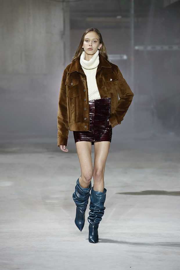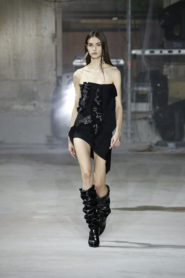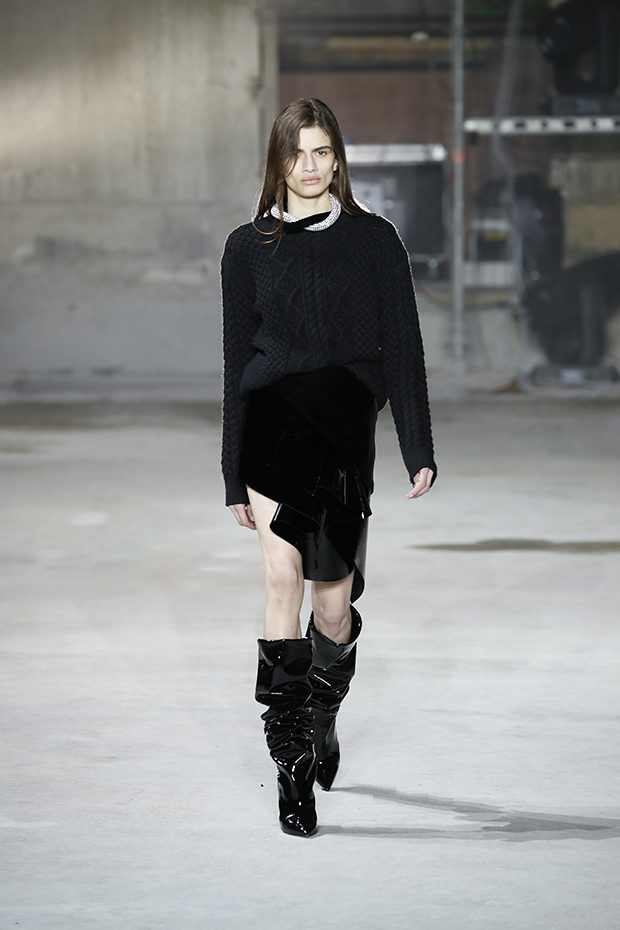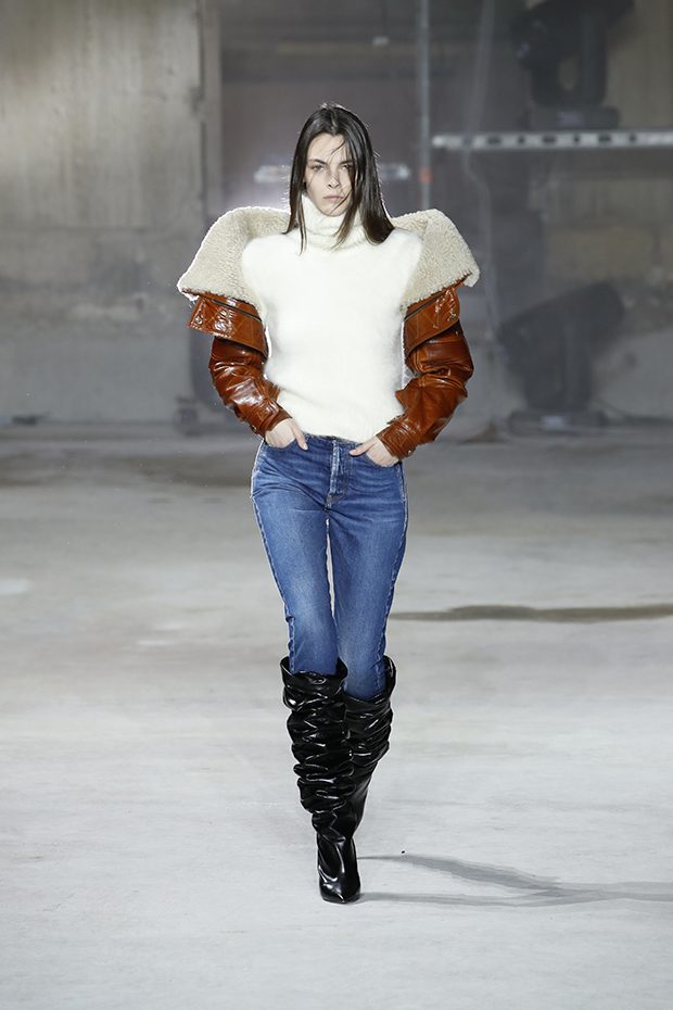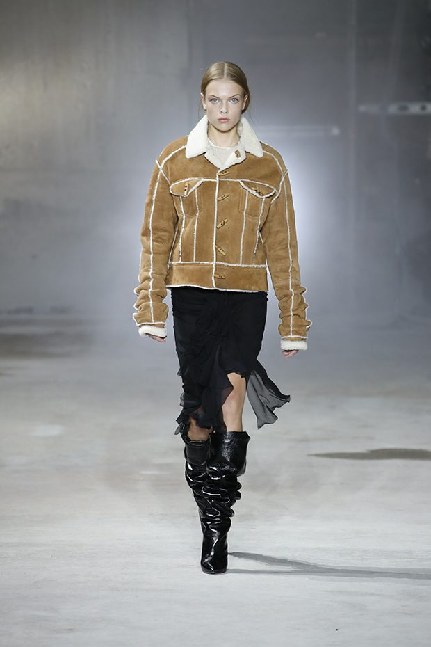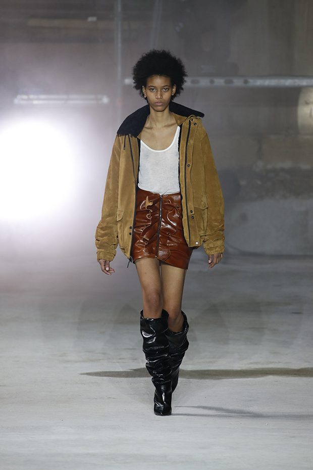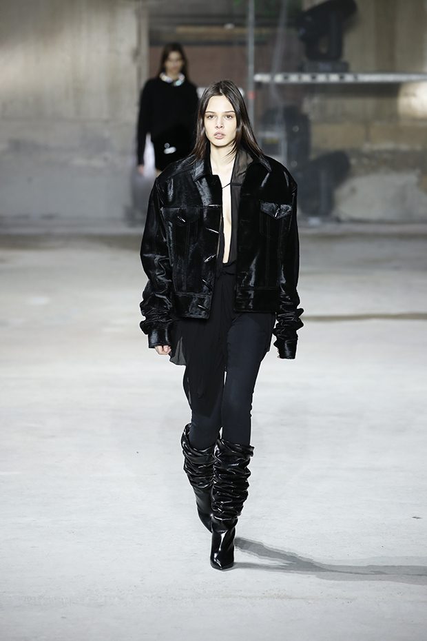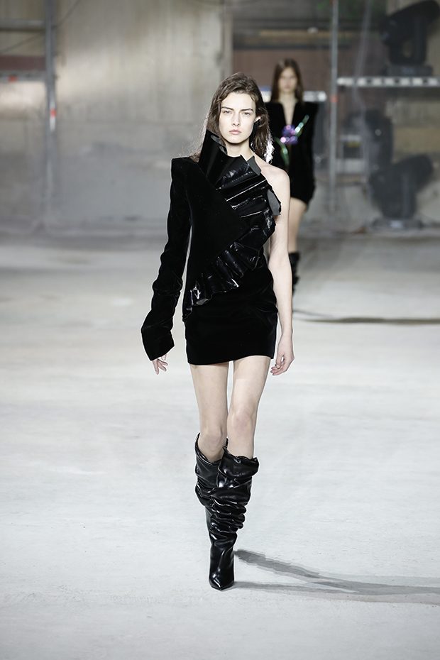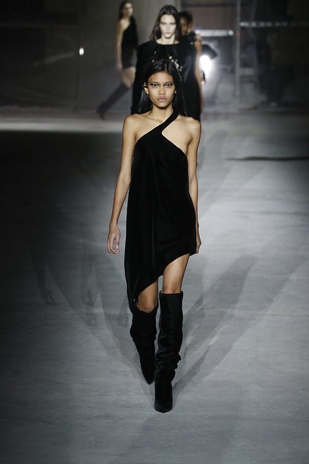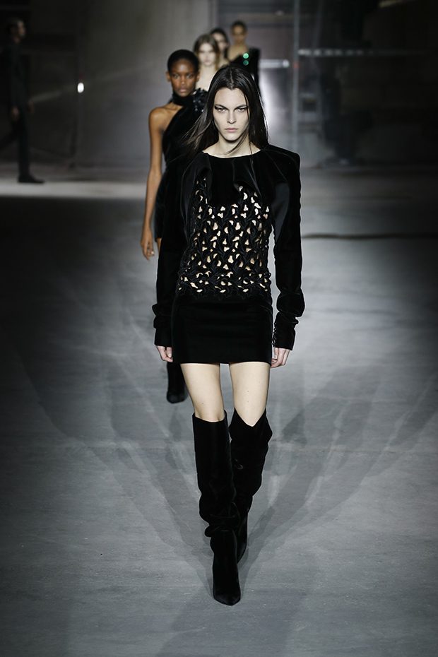 Anthony Vaccarello presented his Autumn Winter 2017/18 collection for Saint Laurent during the ongoing Paris Fashion Week. Exploring the paradoxes and tensions of a contemporary Saint Laurent femininity, the collection features sharp and structured shoulders, flight-jacket dress, laser-cut leather, as well as, shearling details, denim and leather boots. For the evening wear, Vacarello prepared matte black velvet, decorated with raw crystal embroidery.
