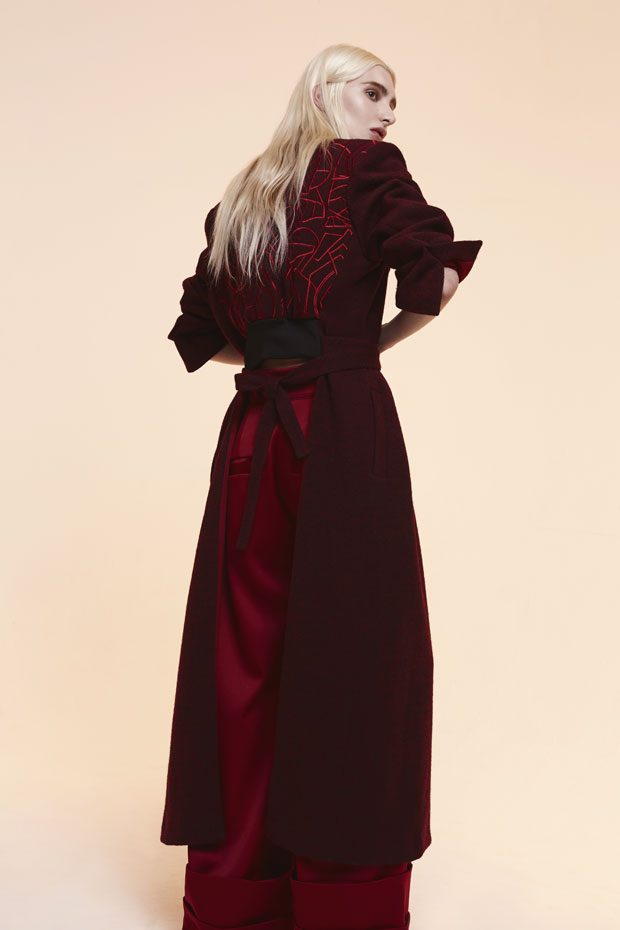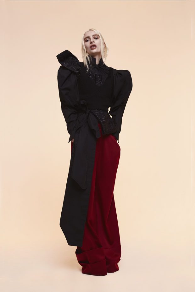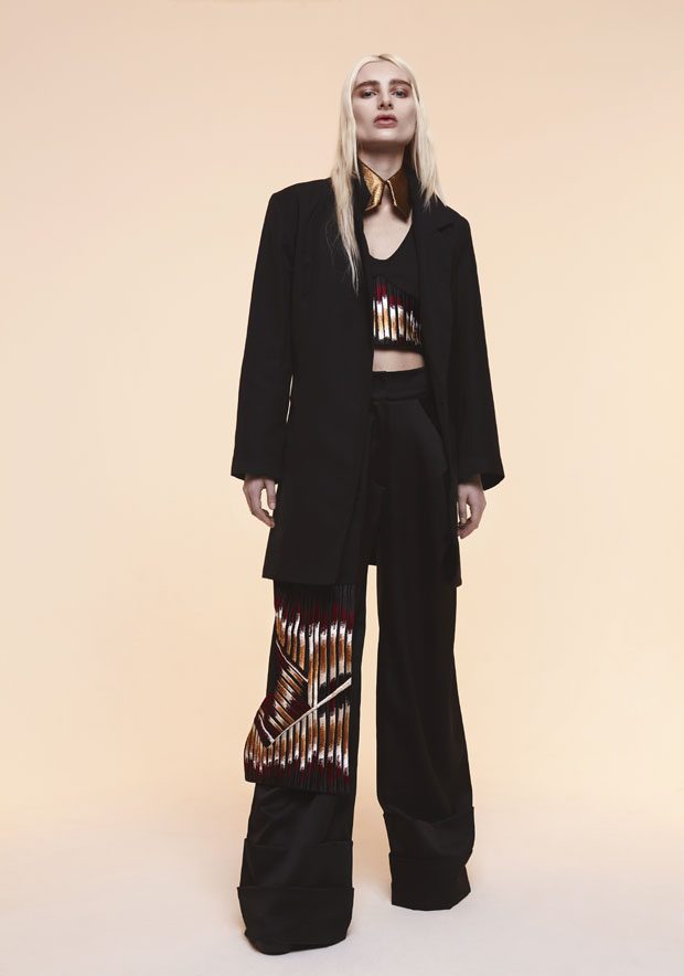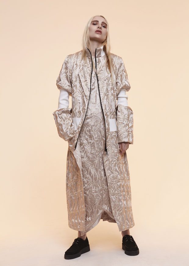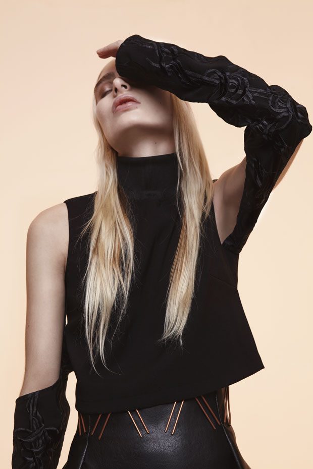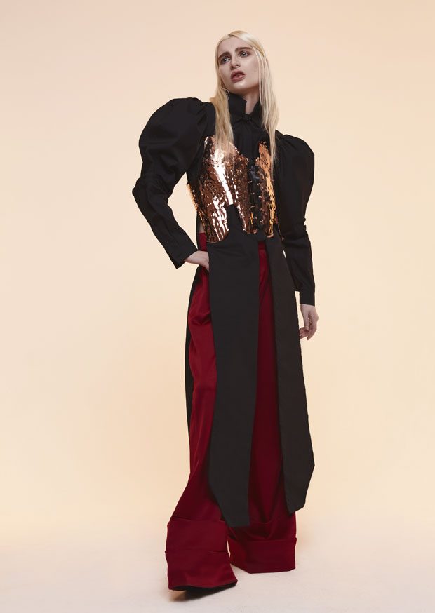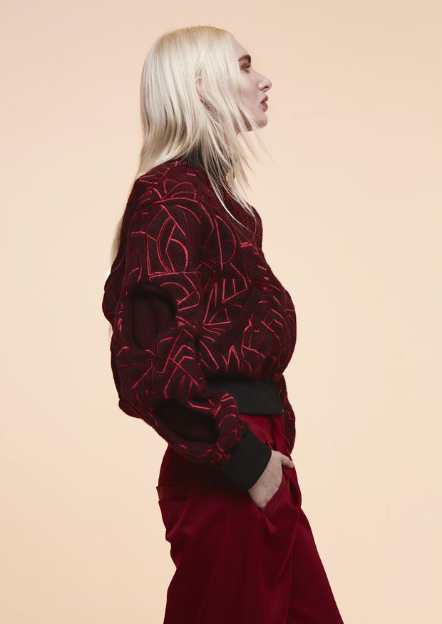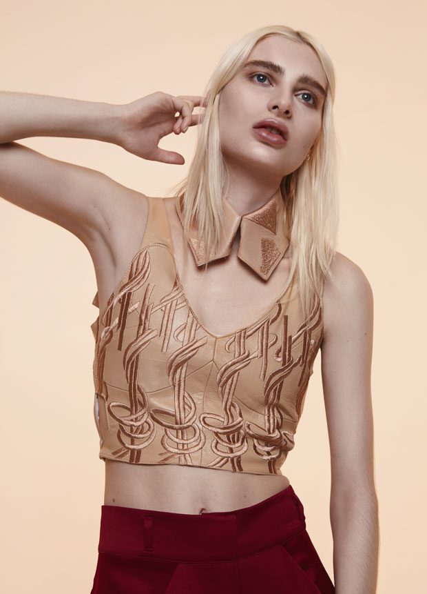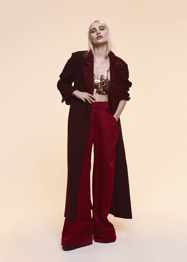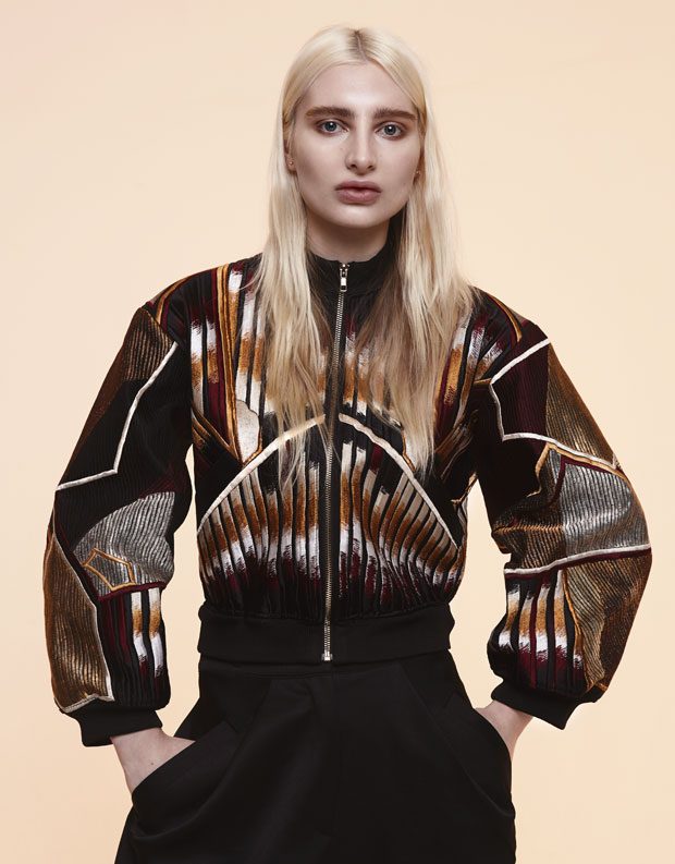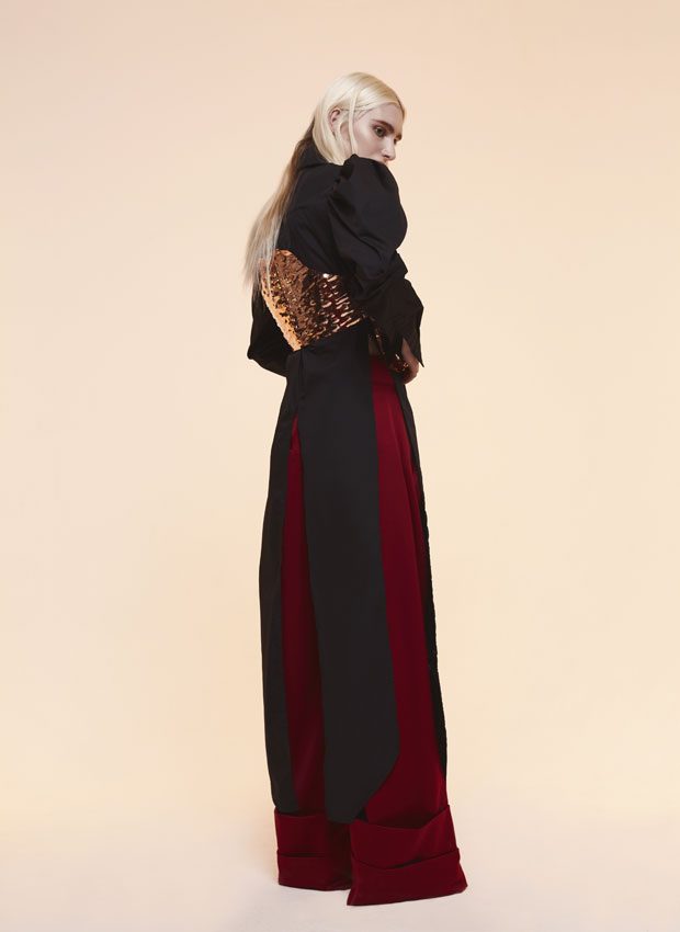 Whilst in the past Sadie has expressed time as a visual whirlwind, a vortex which sometimes overwhelms us, in A/W 2017 she gives us a moment of reflection and centres on the essentials of the brand. Signature shapes are worked in luxurious colours with copper, burgundy, nude and black creating a rich palette softens the sculptural lines. Embellished through her work with knotted and interwoven embroidery this seasons take on her signature bomber has undergone a military evolution, and Sadie returns to mold her signature copper metal into corsets and breast plates which continue to reflect the familiar 3D holes that we recognise from her bomber but are captured in a rigid armour of wearable art. – from SADIE CLAYTON
