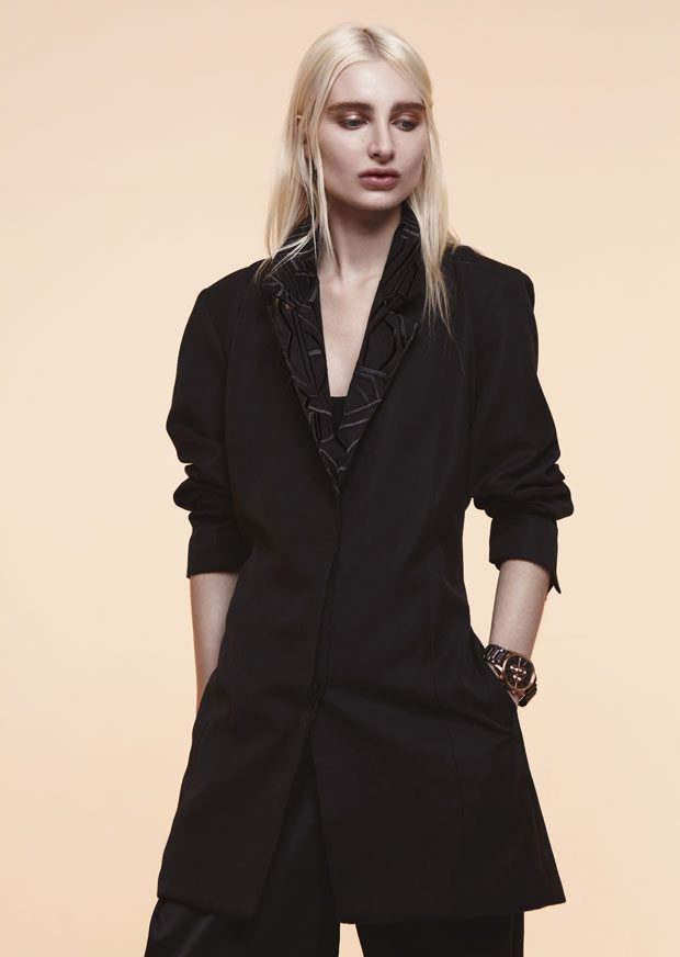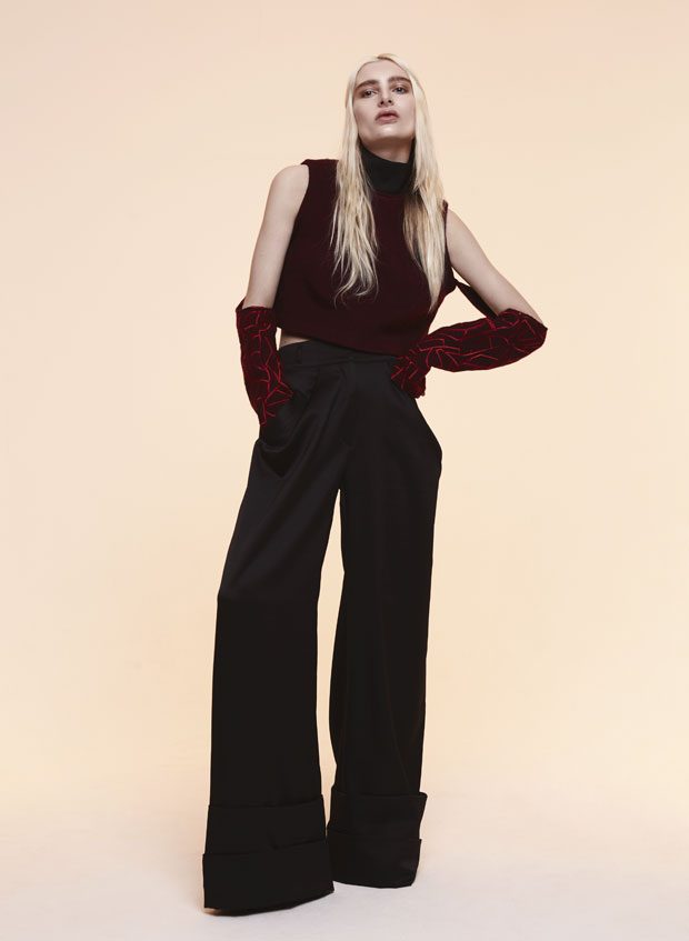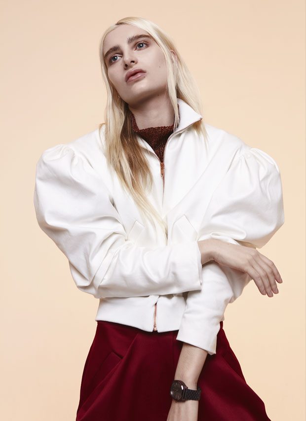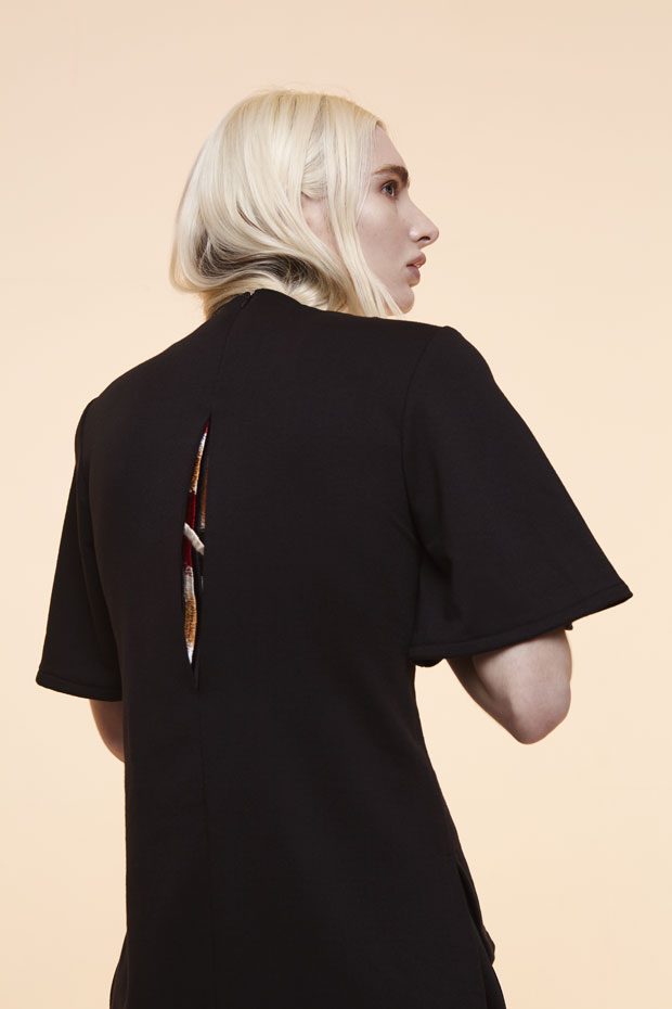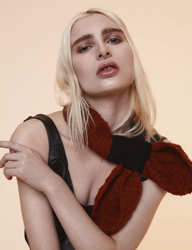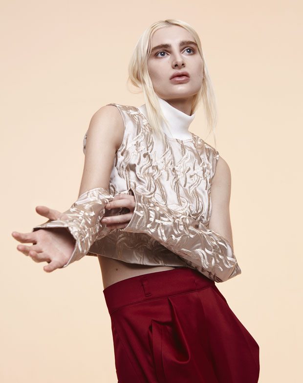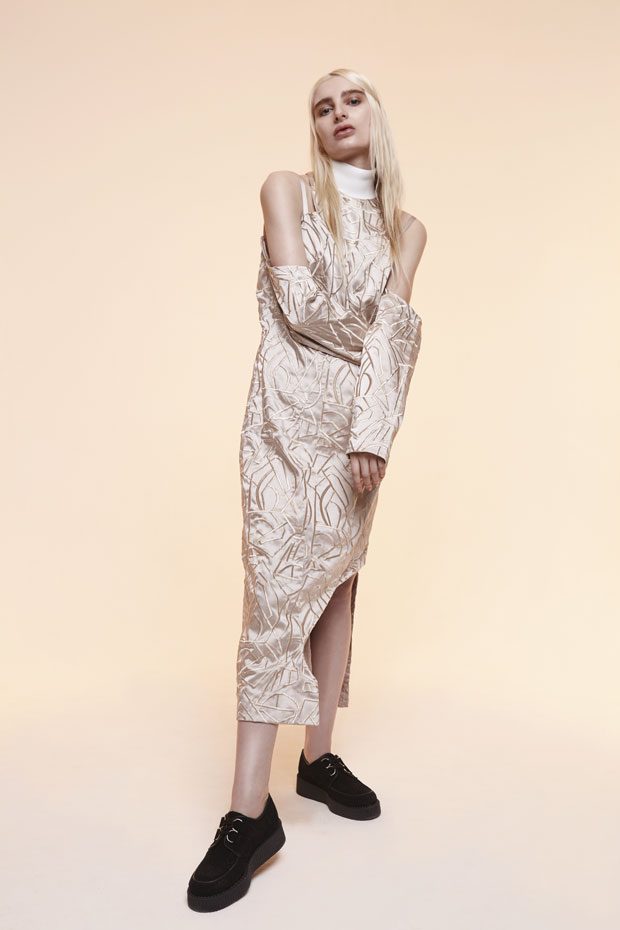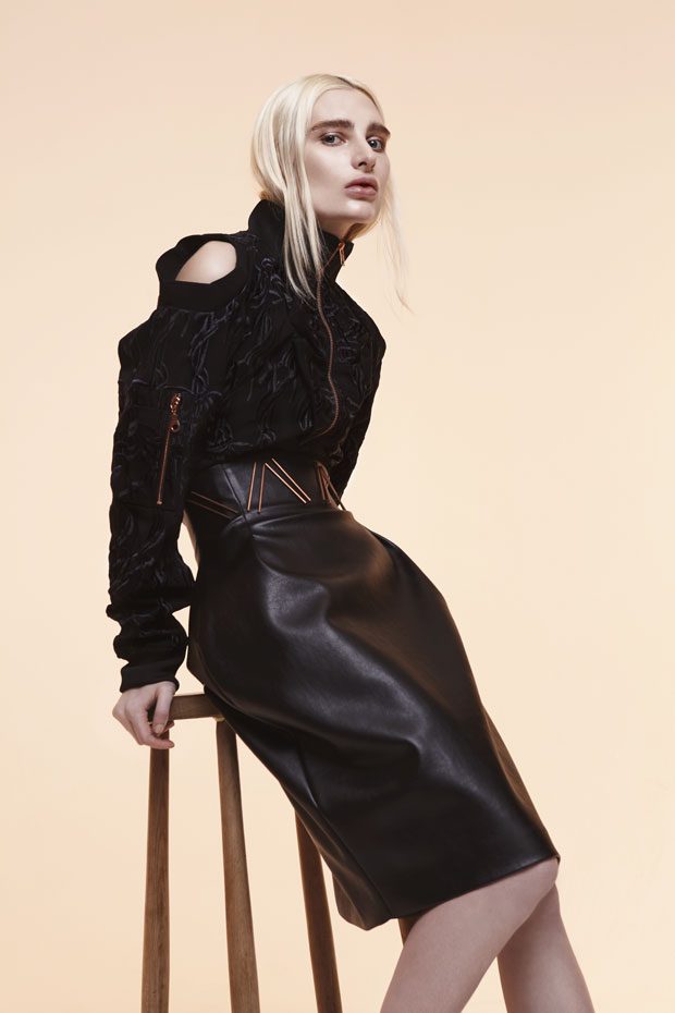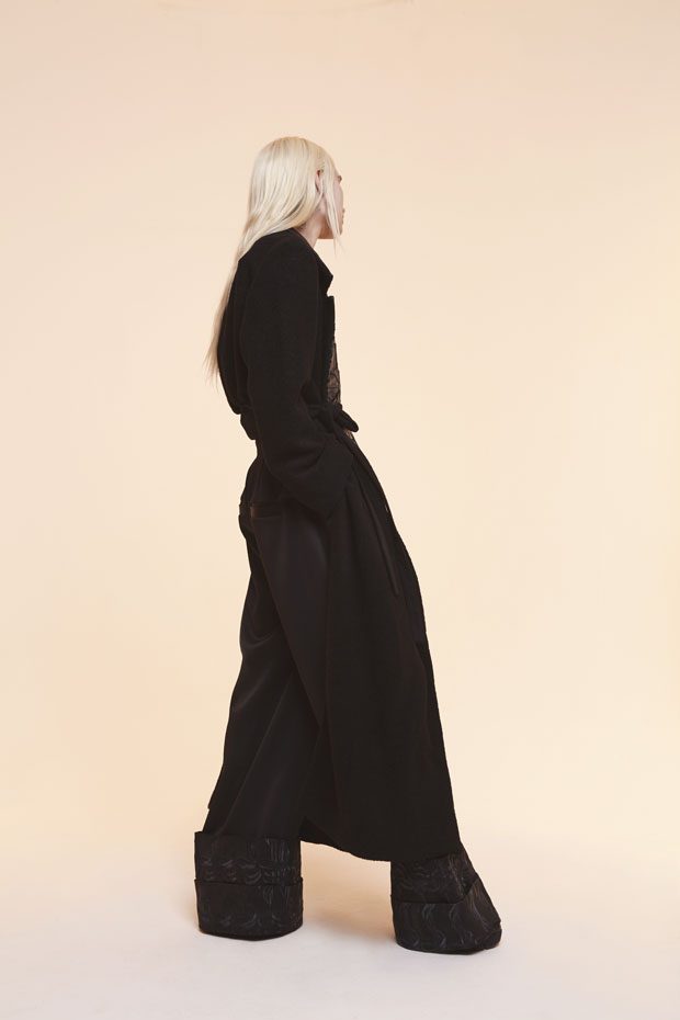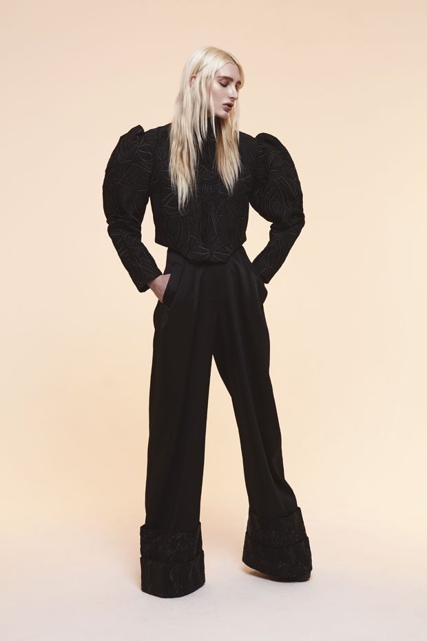 Whilst in the past Sadie has expressed time as a visual whirlwind, a vortex which sometimes overwhelms us, in A/W 2017 she gives us a moment of reflection and centres on the essentials of the brand. Signature shapes are worked in luxurious colours with copper, burgundy, nude and black creating a rich palette softens the sculptural lines. Embellished through her work with knotted and interwoven embroidery this seasons take on her signature bomber has undergone a military evolution, and Sadie returns to mold her signature copper metal into corsets and breast plates which continue to reflect the familiar 3D holes that we recognise from her bomber but are captured in a rigid armour of wearable art. – from SADIE CLAYTON