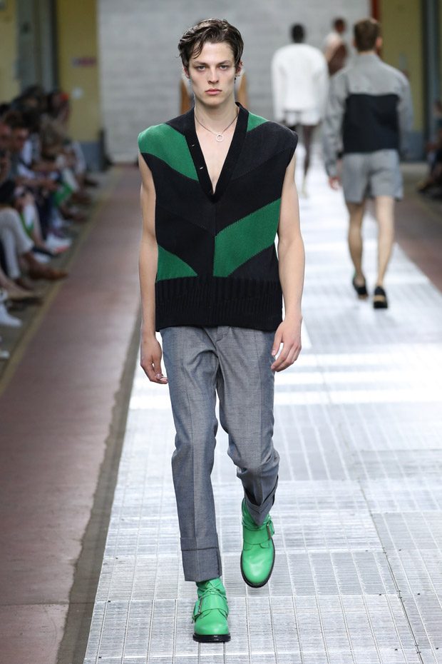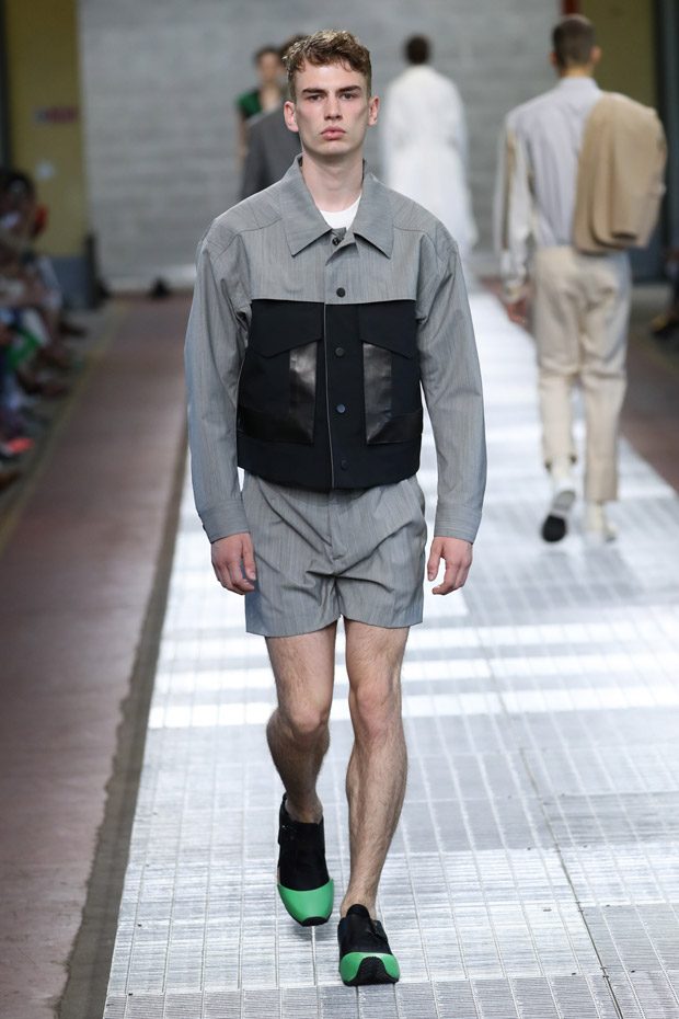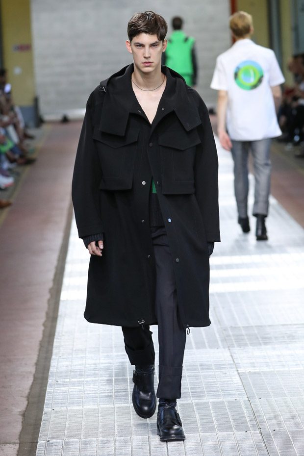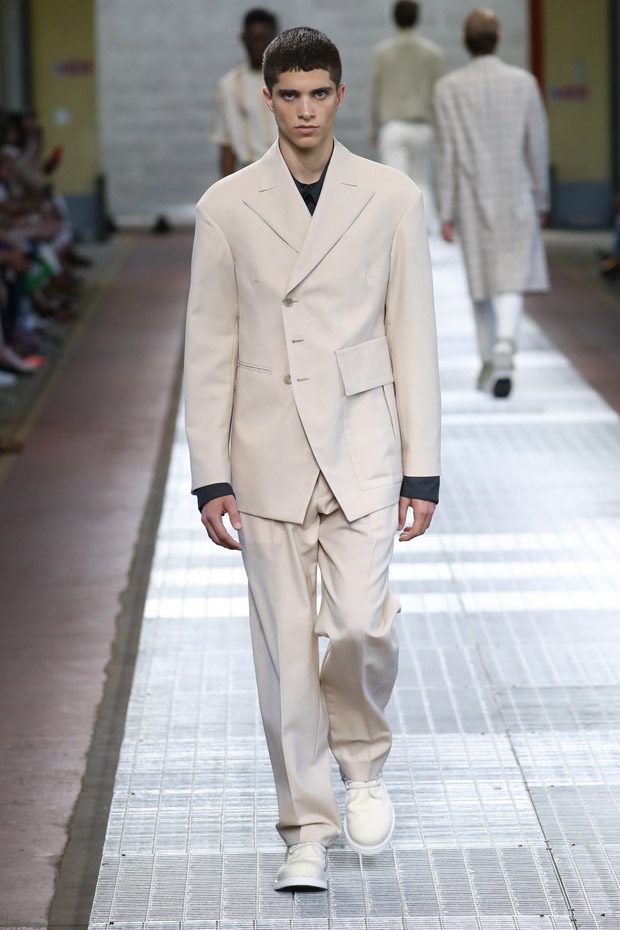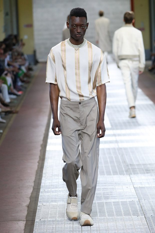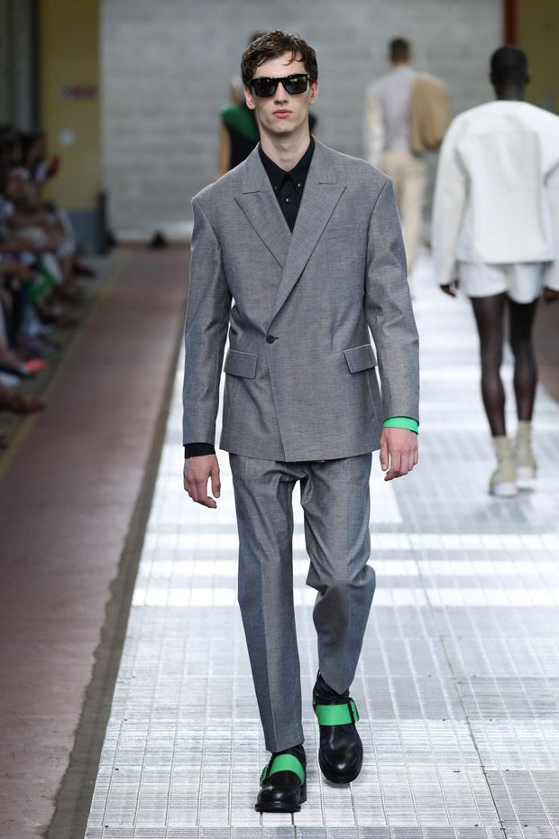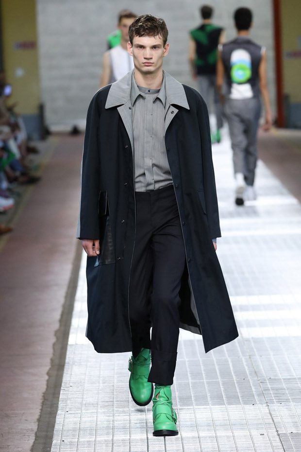 Truthfulness and functionality this season are amplified to such intensity they almost get raw, looking at the imposing forms, honesty to materials and progressive utopias of Brutalist and Radical Architecture. Shapes are assertive and straightforward. Generous parkas, blousons, pragmatic trousers are the archetypal blueprints on which strong contrasts highlight details and constructions, suggesting rhythmic repetitions of modules. The effect is graphic, with a tangible physical vibe. On the same vein, rugby nods recall the noble physicality of an intense sport and the graphic allure of its uniform. Sharp cuts and decisive volumes give an hyper-masculine yet thoughtful twist to classics such as the double-breasted blazer, the crombie, the straight trousers. Boots and functional sandals anchor the silhouette to the ground, suggesting mobility and presence.“