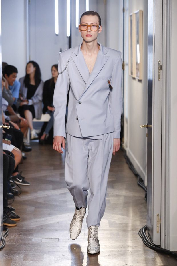 Textures of silver chains and reconfigured 18th century antique brooches—binding this season’s suiting and ready-to-wear—act as functional assemblage, luring you into relapses of Neoclassicism and outbreaks of savagery. A story is told—a final dichotomy—with lonely silhouettes of a boy and chain—beautifully knit in collaboration with Loro Piana—peeking out between looks of spring pastels and shades of black, similar to a de Kooning.“