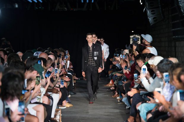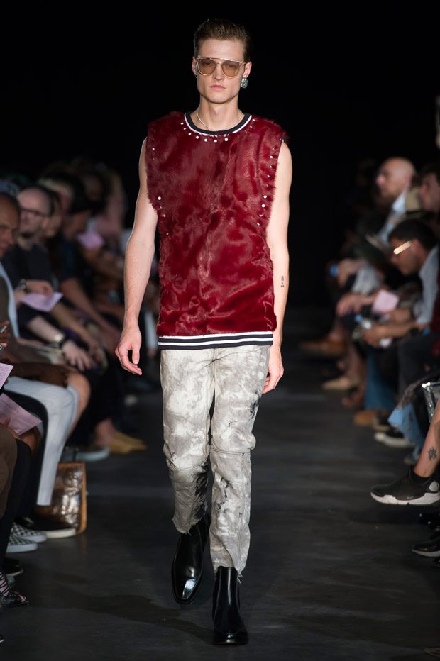 “Magnetic and adventurous, he changes partners every night as he changes clothes: from a check-lined studded suit to a denim jacket flagged with a heartbreaker embroidery, literally decoding his attitude. This season, the designers pictured him on a Los Angeles summer night transposing the sunset aurora pink colors on light weight silky fabrics, imagining a star filled night sky through glittering embroideries on the runway.