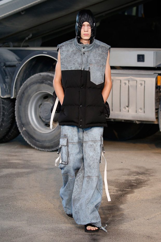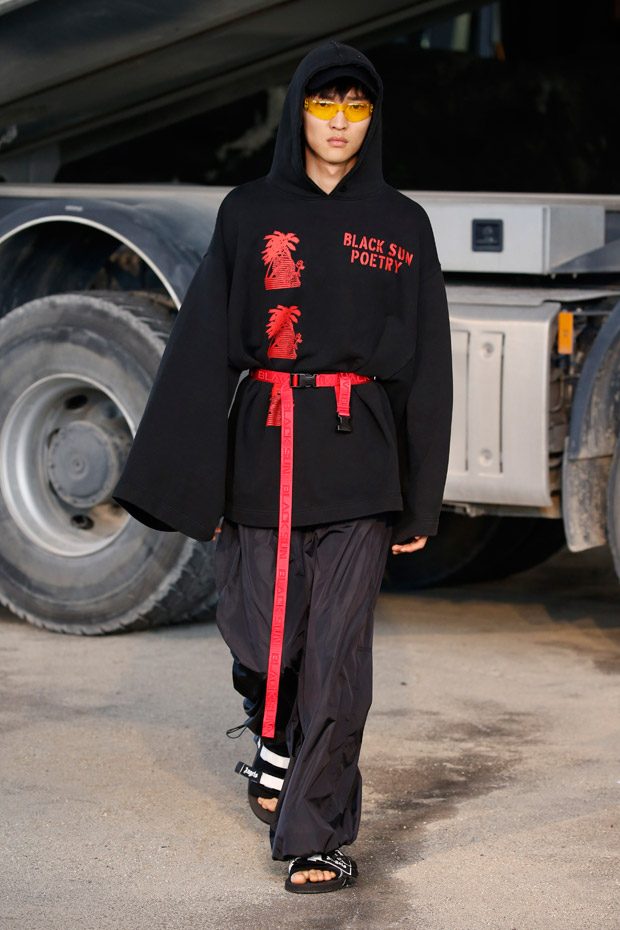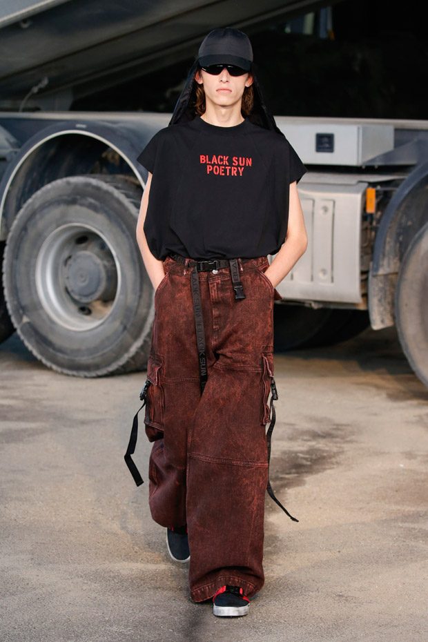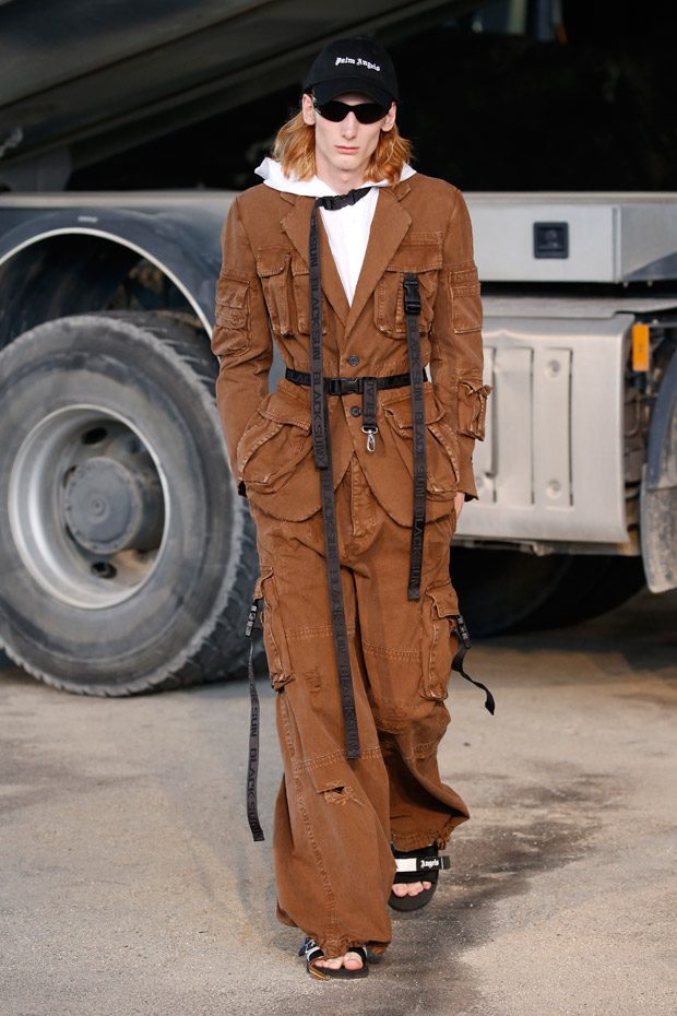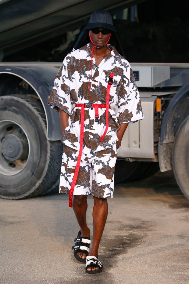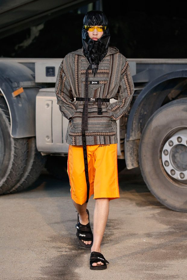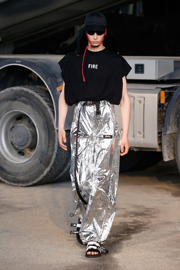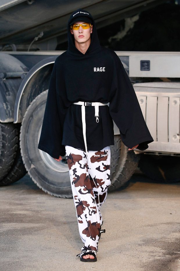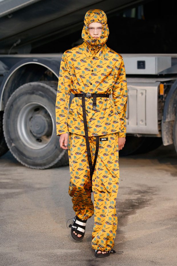 “Assertive proportions. Visual clarity. Bold silhouettes. Pragmatic forms: parkas, duster coats, field jackets, boxy shirts, oversize fatigues, boarding shorts, miniskirts, scuba suits. Functional details get twisted: drawstring, dangling straps. Palm patterns get micro, giving rhythm, or macro, making a statement. Sun-faded effects attack surfaces, in an act of disobedience.