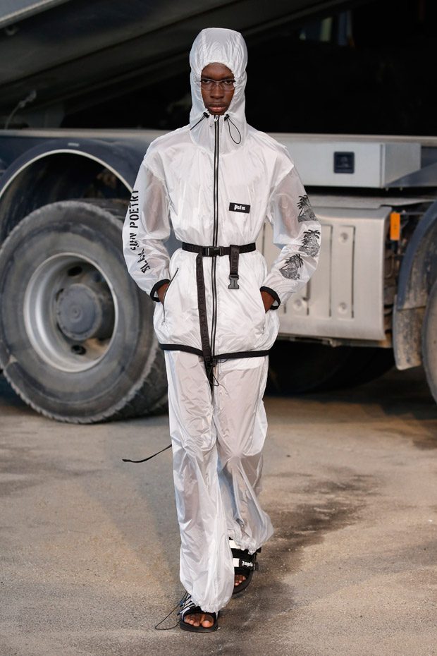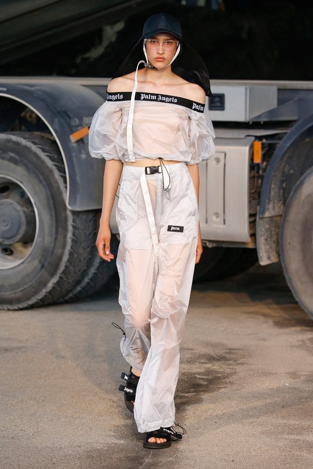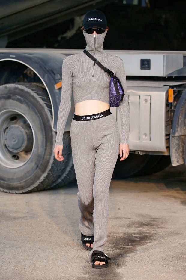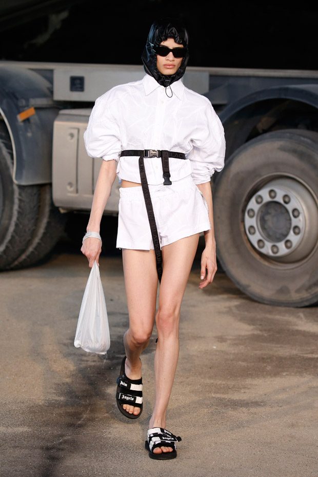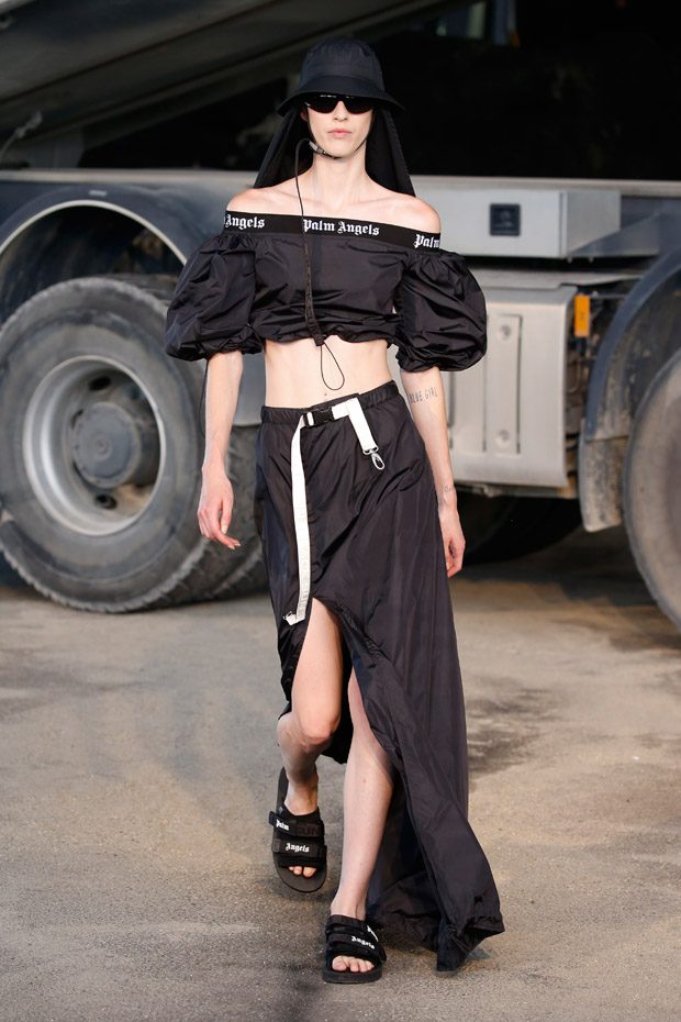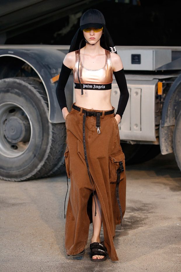 Practical accessories: hoods, bucket hats, sport bibs, backpacks, totes. The same spirit, and a sporty physicality, link men and women, which is officially a debut for Palm Angels. Masculinity, in protest. Femininity, too. Under a black sun.“