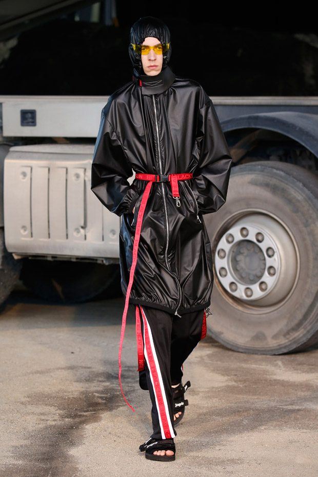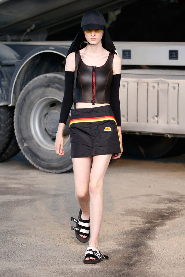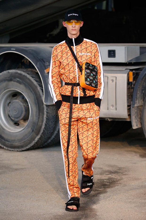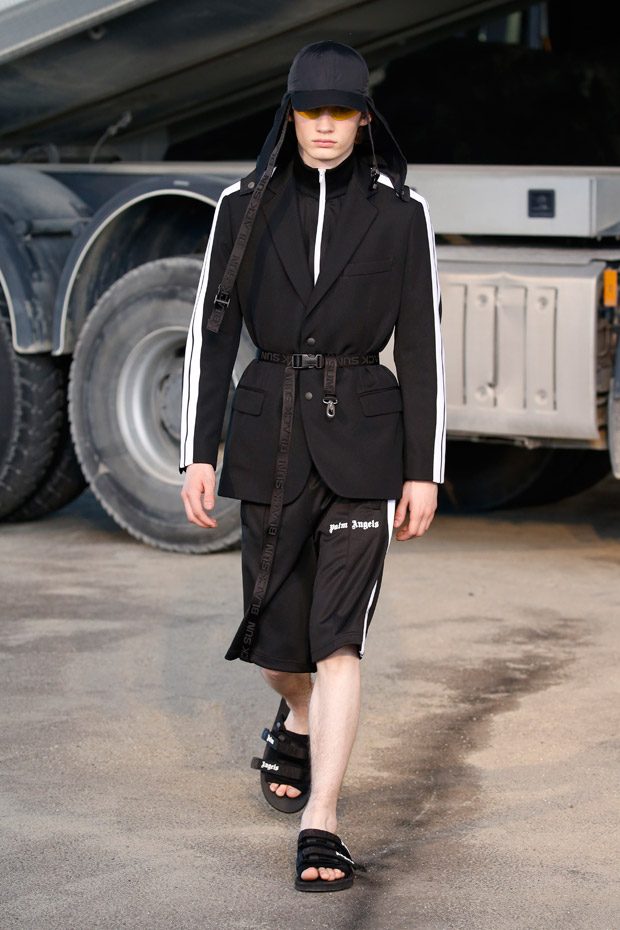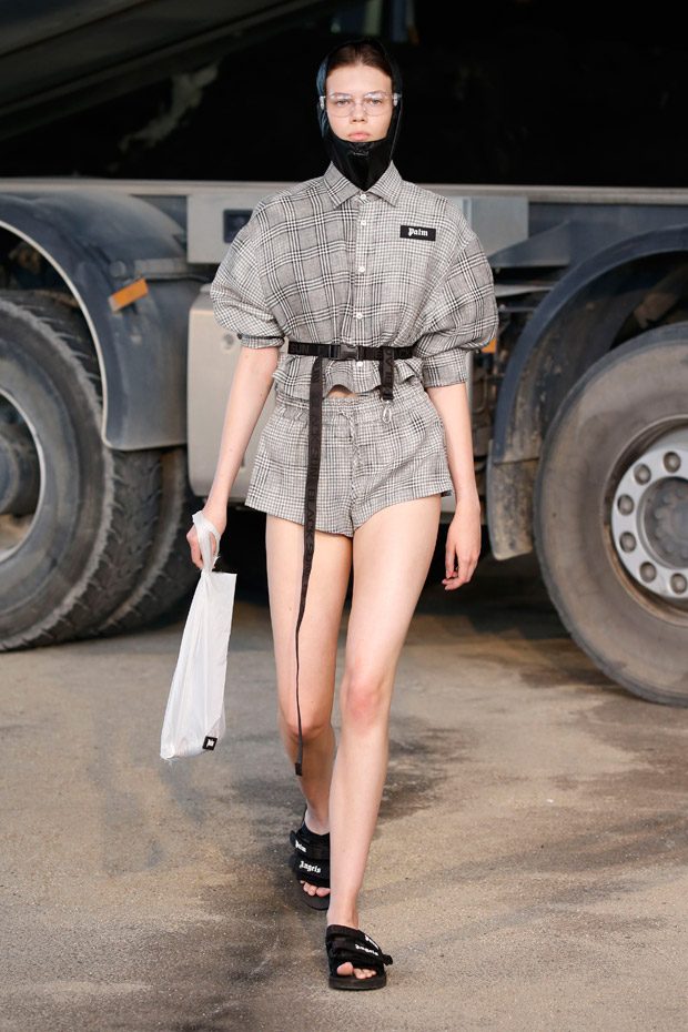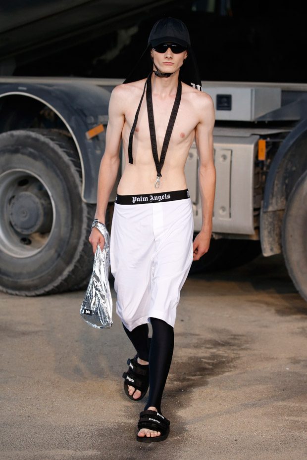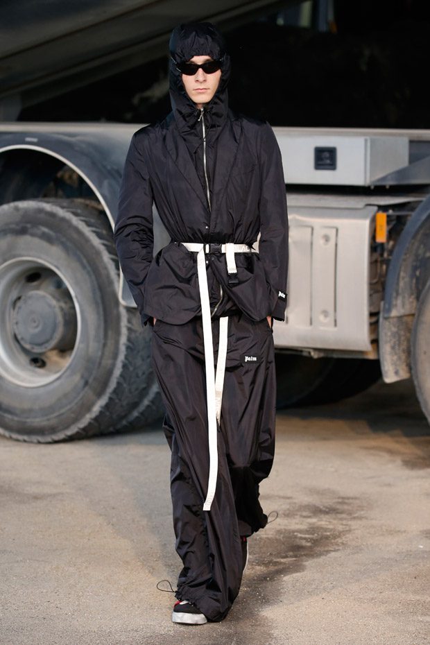 Practical accessories: hoods, bucket hats, sport bibs, backpacks, totes. The same spirit, and a sporty physicality, link men and women, which is officially a debut for Palm Angels. Masculinity, in protest. Femininity, too. Under a black sun.“