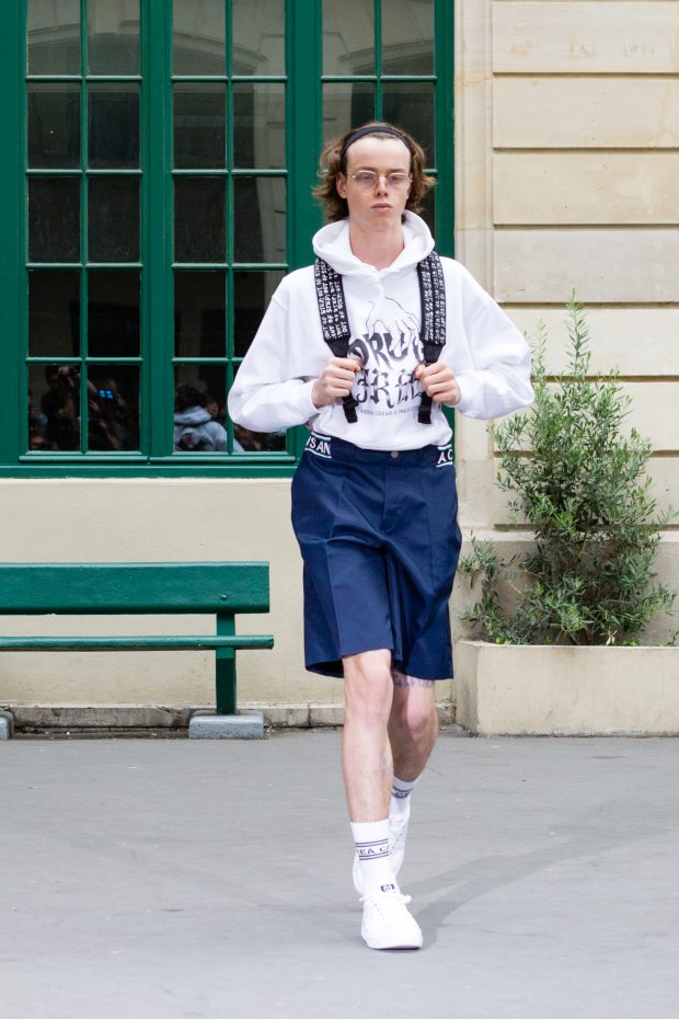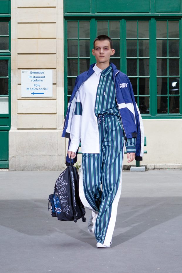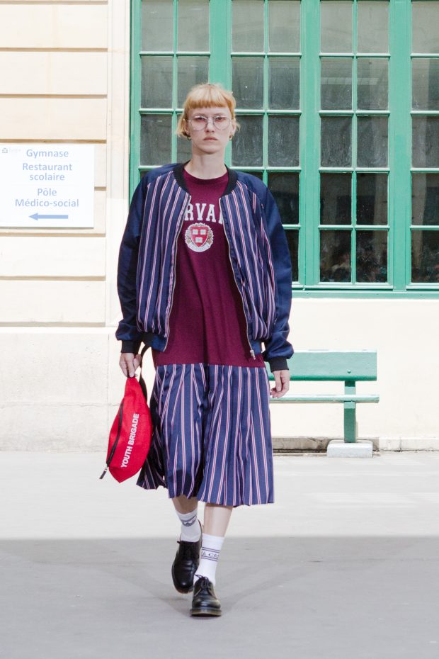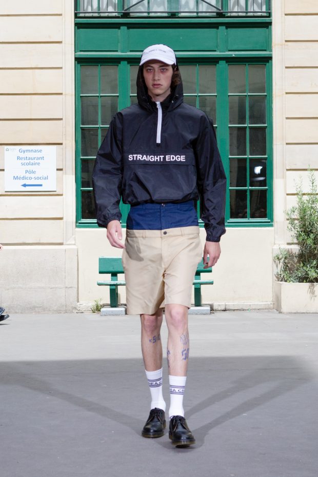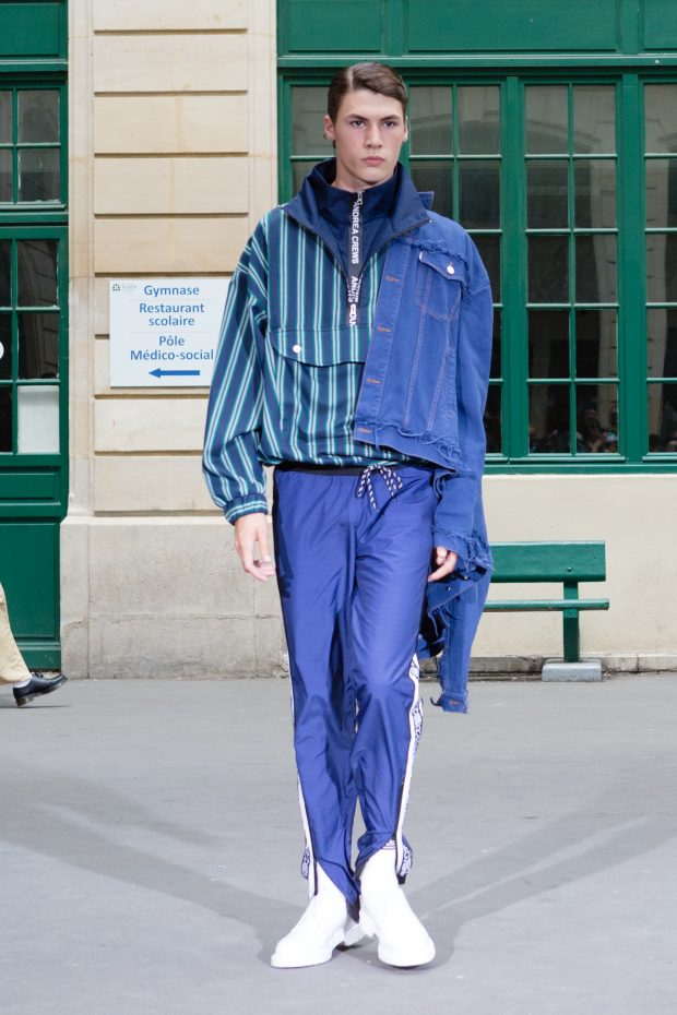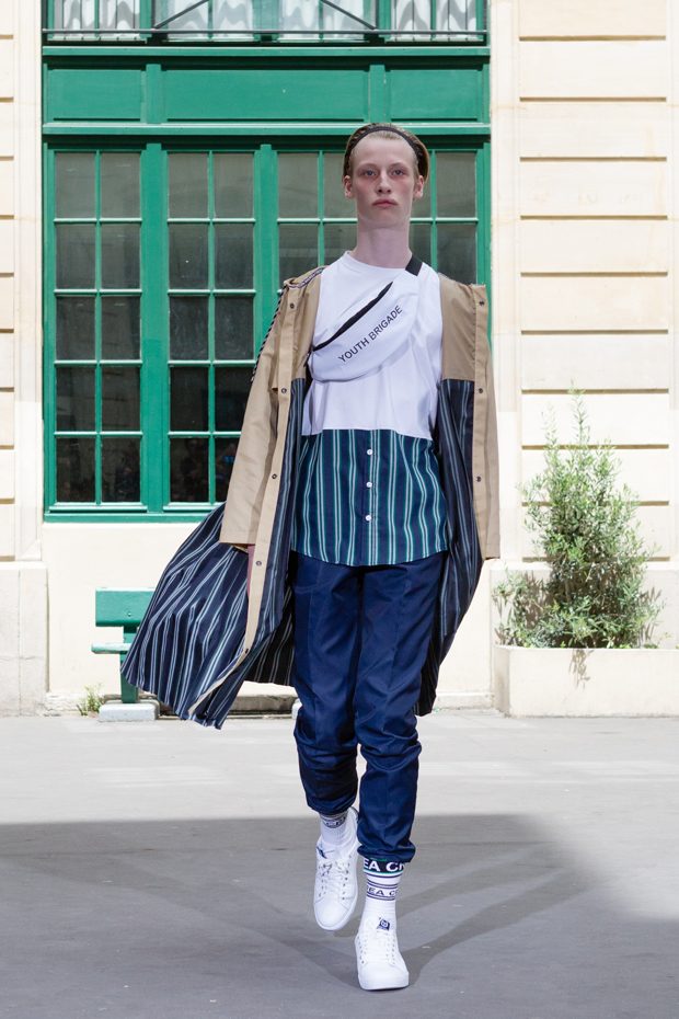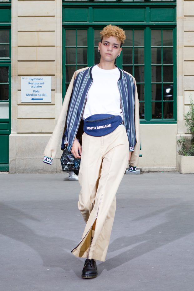 The collections continue to develop and get more precise. Andrea Crews is showing her ‘savoir faire’ and perfection of technique. The clothing is both the body and the voice of her message. It’s also a language that gives a physical form to a plethora of stories. For the SS18 collection the Youth Brigade is a mirror; the portrait of youth that are tired of the established rules and traditions, that undoes and customizes their uniform as a manifesto of their own identity. Schoolwear is reinvented, streetwear is radicalized – it’s the beginning of a new era; The New Man. – from Andrea Crews
