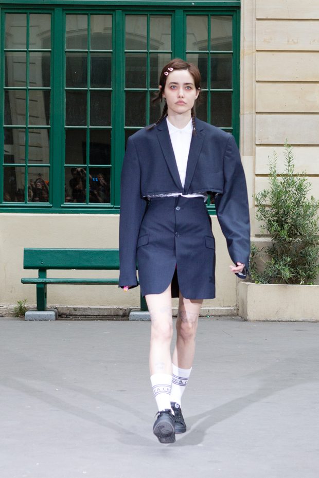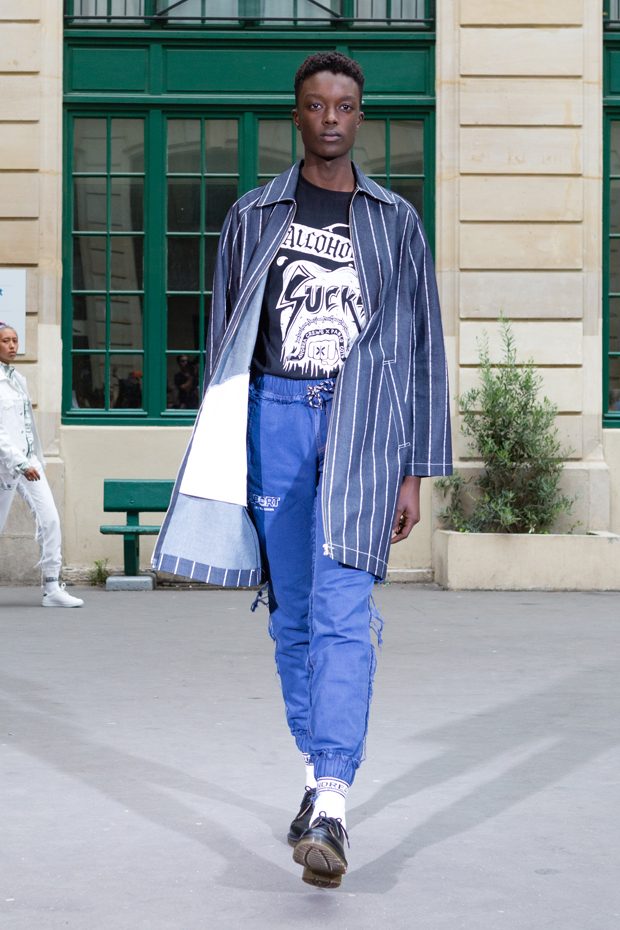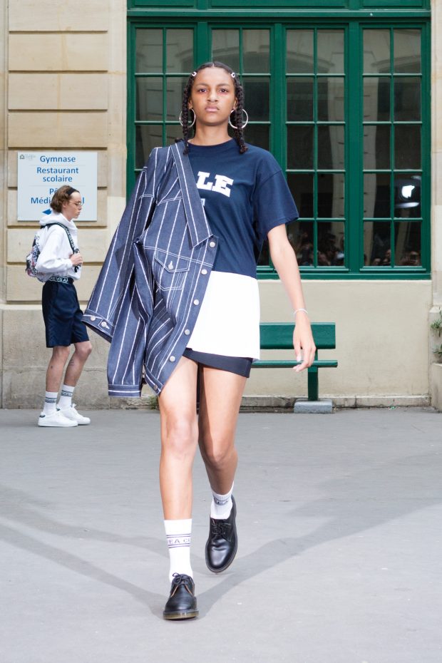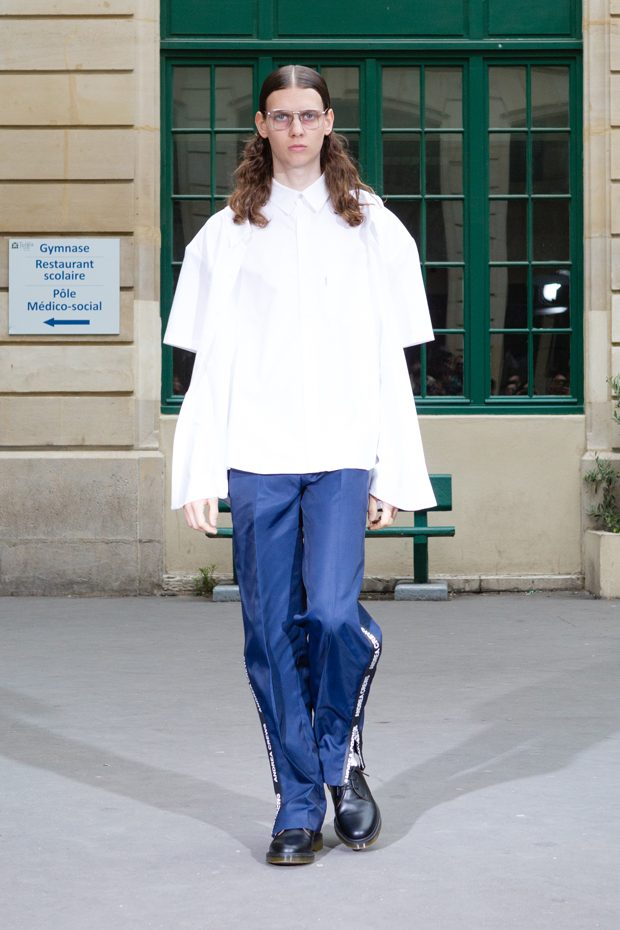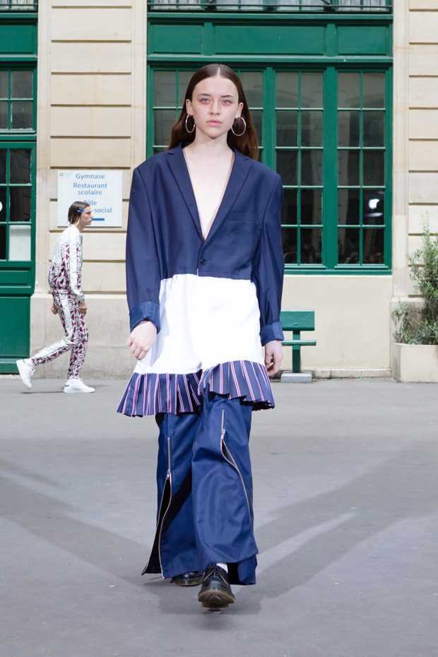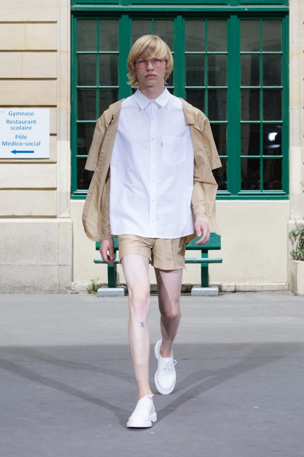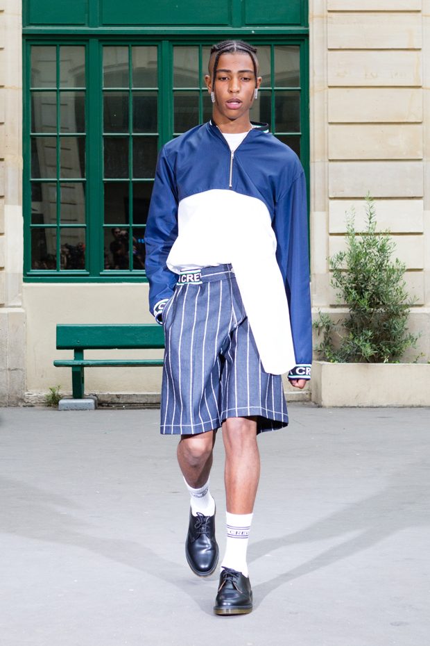 The collections continue to develop and get more precise. Andrea Crews is showing her ‘savoir faire’ and perfection of technique. The clothing is both the body and the voice of her message. It’s also a language that gives a physical form to a plethora of stories. For the SS18 collection the Youth Brigade is a mirror; the portrait of youth that are tired of the established rules and traditions, that undoes and customizes their uniform as a manifesto of their own identity. Schoolwear is reinvented, streetwear is radicalized – it’s the beginning of a new era; The New Man. – from Andrea Crews