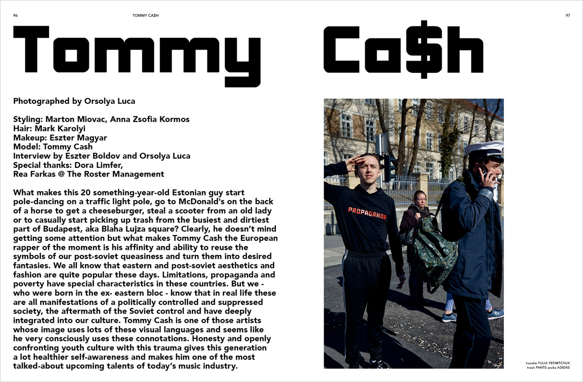“For this issue, we have worked with some of the most prestigious artist’s of the European underground art scene, such as Mark Lebon, Viva Gore, Tommy Ca$h and Neil Drabble but Donald Trump and Angela Merkel also make an appearance. Collage artist Kalen Hollomon (who works with musician Weekend on his album covers) has also created some special works for us. The two covers were photographed by London-based French-Chinese photographer Nhu Xuan Hua and London-based Hungarian photographer Orsolya Luca and they feature top model Gabrielle Rul and Eastern-European rapper of the moment, Tommy Ca$h. ” – from Philosophy Magazine.
