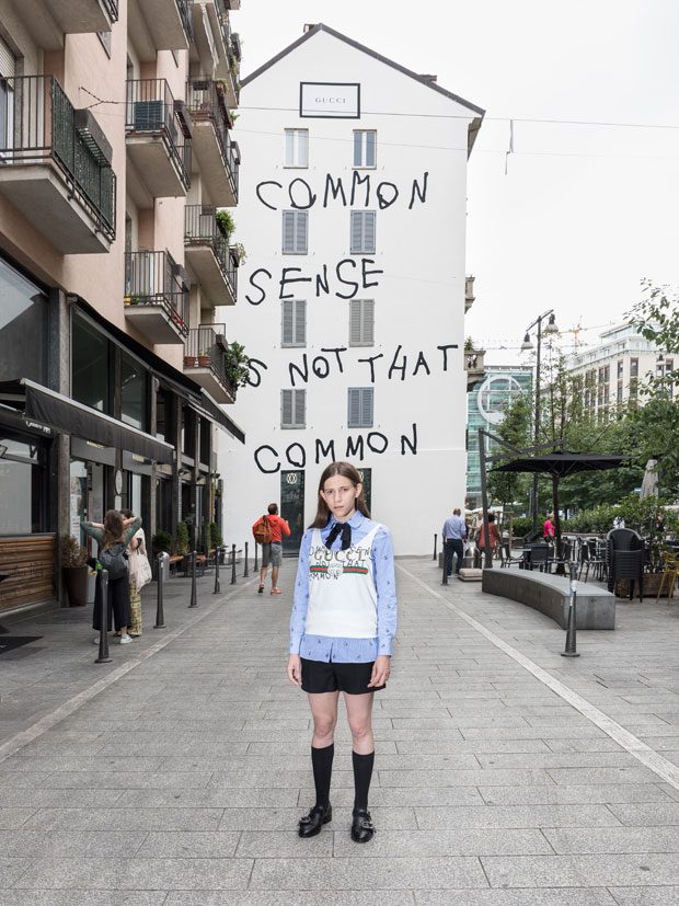 Coco Capitán’s work was incorporated into the catwalk presentation for Gucci’s autumn/winter womenswear collection, where two pieces were shown on the runway featuring her signature handwritten witty aphorisms. Guests to the Gucci show space in Milan were also introduced to one of Capitán’s text-based artworks on a wall as they entered the show space, and had indeed seen her handwriting, literally, on their show invitations. Alessandro Michele also chose to wear a T-shirt featuring a Capitán slogan for his end-of-show bow. The message in this case? ‘I want to go back to beliving a story.’ The collaboration between Alessandro Michele and the artist for the autumn/winter season has resulted in a special range of pieces that showcases her offbeat sense of humour. Tote-backpacks, belt-bags, sweatshirts, T-shirts, hoodies, knits and coats in a range of colours have been used by Capitán as a canvas for her naïve-looking handwritten messages. All items are unisex and many of them feature the Gucci green-red-green Web stripe and gold interlocking GG motif. – shares Gucci
