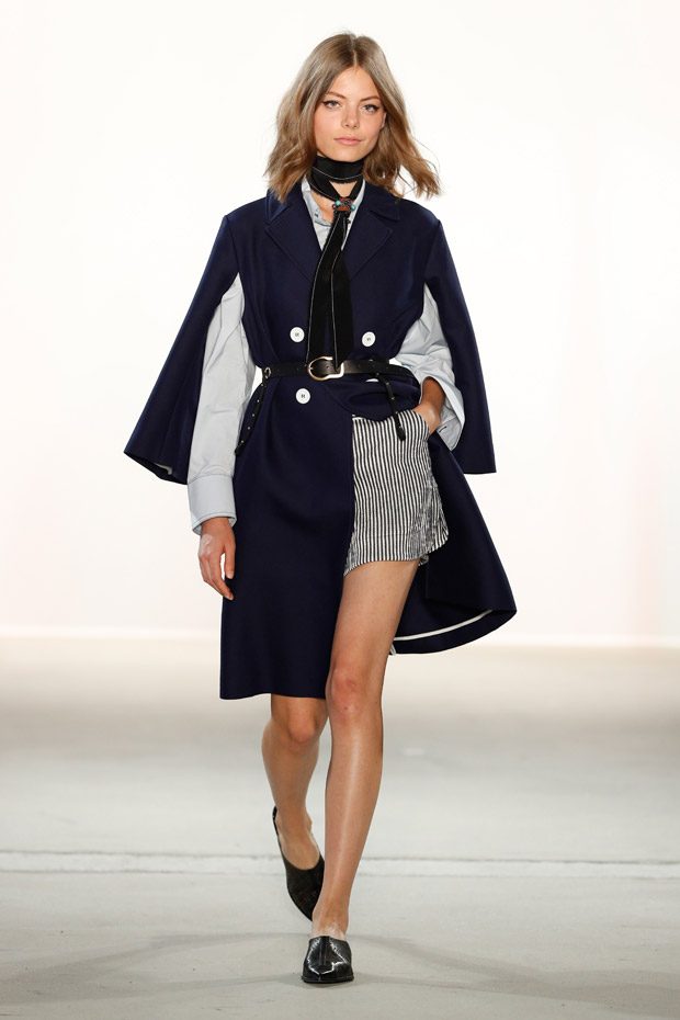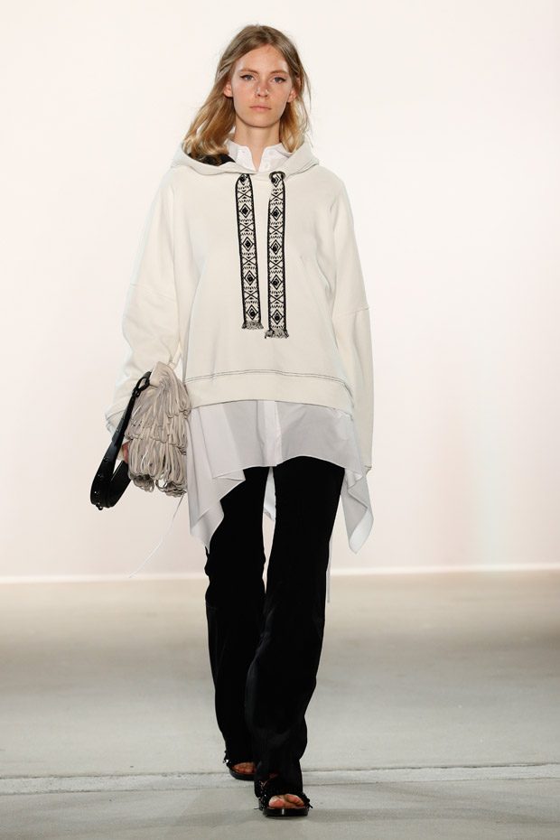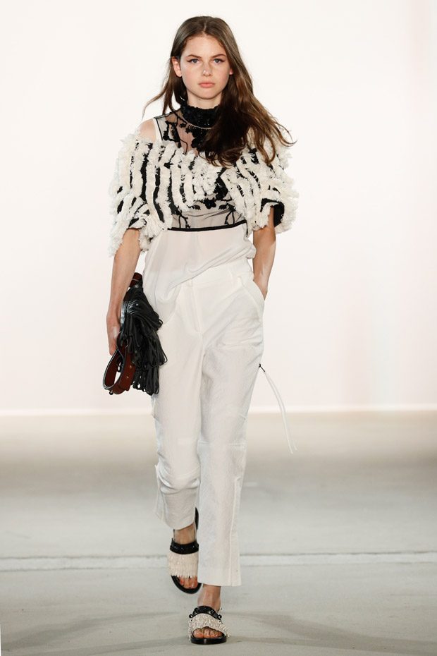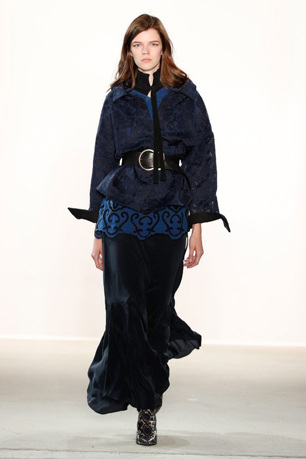 Print- wise, various ideas are shown: flowers, pinstripes, classy stripes- we name it, Dorothee Schumacher has it all. Thus, it is a collection that can be worn for various occassions and at any age. What else stayed in mind? Of course the striking pinstripe suits with Latin American inspired embellishments, but also cropped turtlenecks in tulle, oversized hoodies with gaucho tapes (so cosy and cool!), laser cut leather accessories and an innovative range of blouses reincarnating boyish shirt shapes. Simply smooth!
