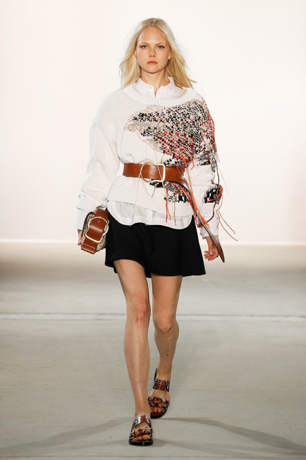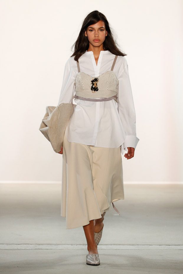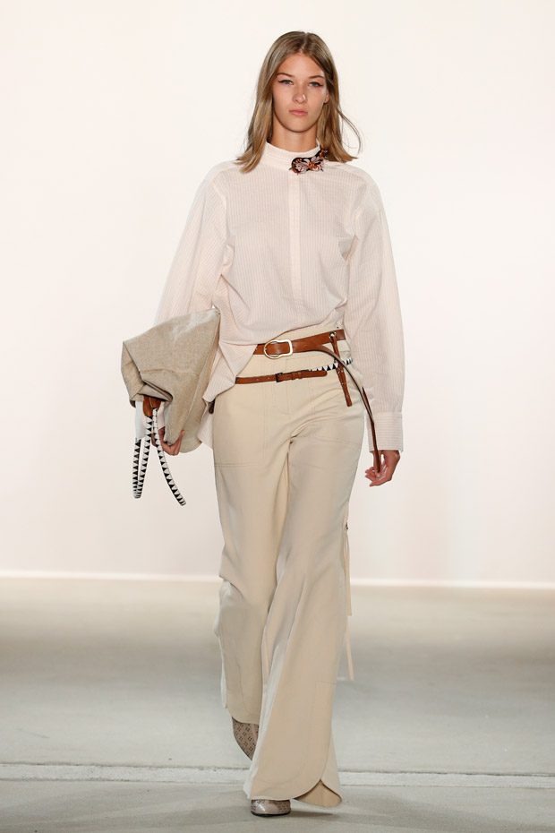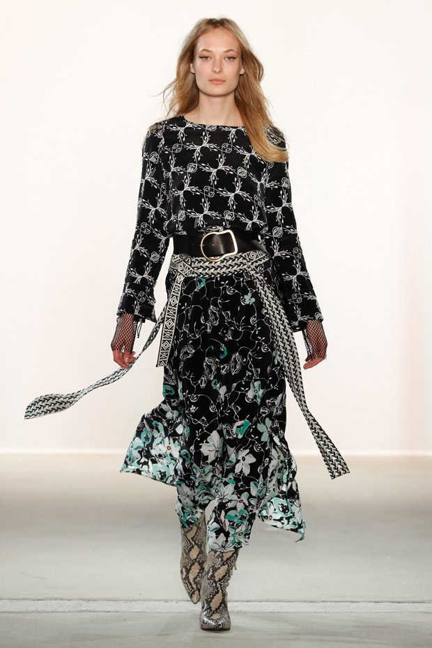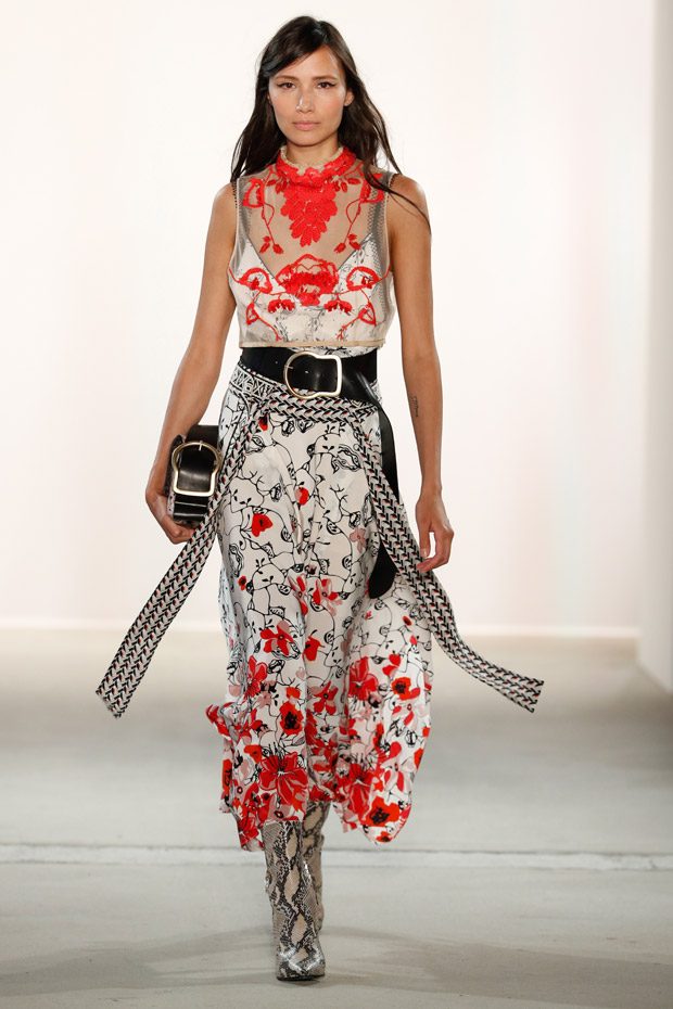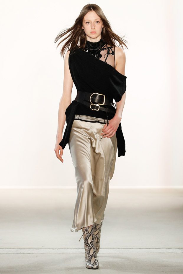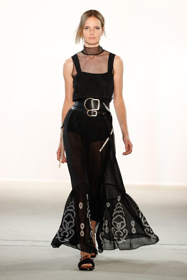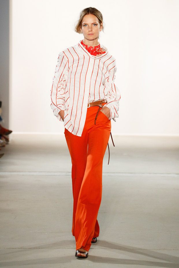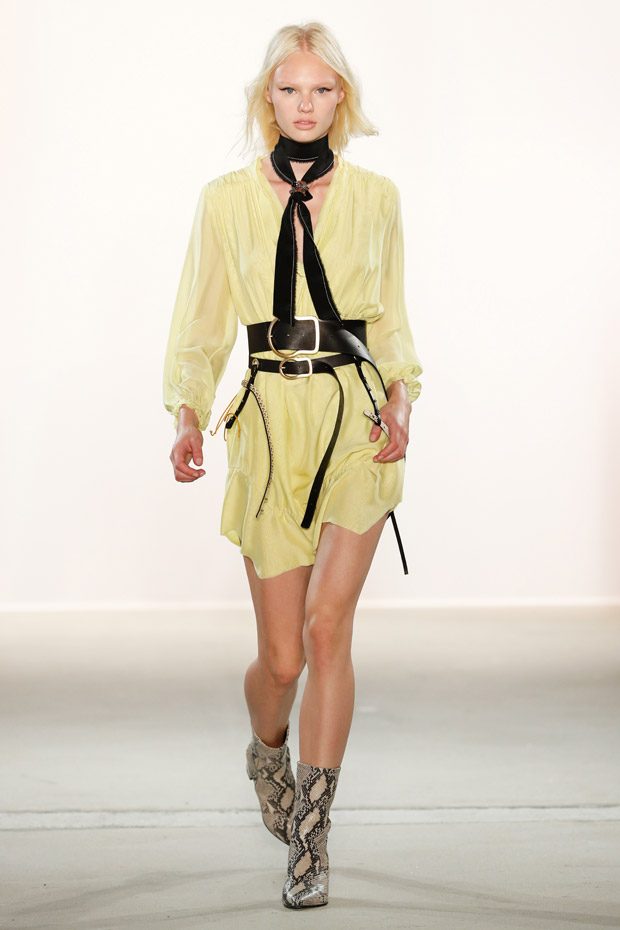Being significant for this compelling collection is its layering look that often teams up with wrapped double belts. To underline the feminine approach of the outfits, sundry of the looks are accentuated on the waist. Length- wise, everything you can imagine, becomes real. Both mini- and maxi pieces are shown. Our highlight piece? We fell in love with a floor- length, floating dress in tangerine that is paired with a black clutch that is equipped with fringes. Sensual. sophisticated. smooth. Needless to mention, we had to add it on our Spring/ Summer 2018 wishlist.