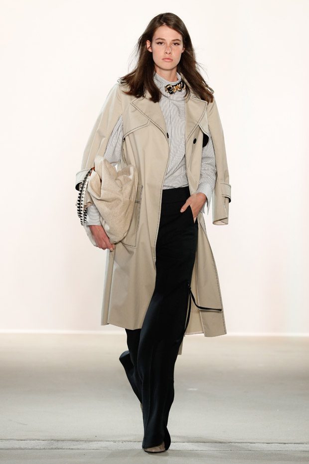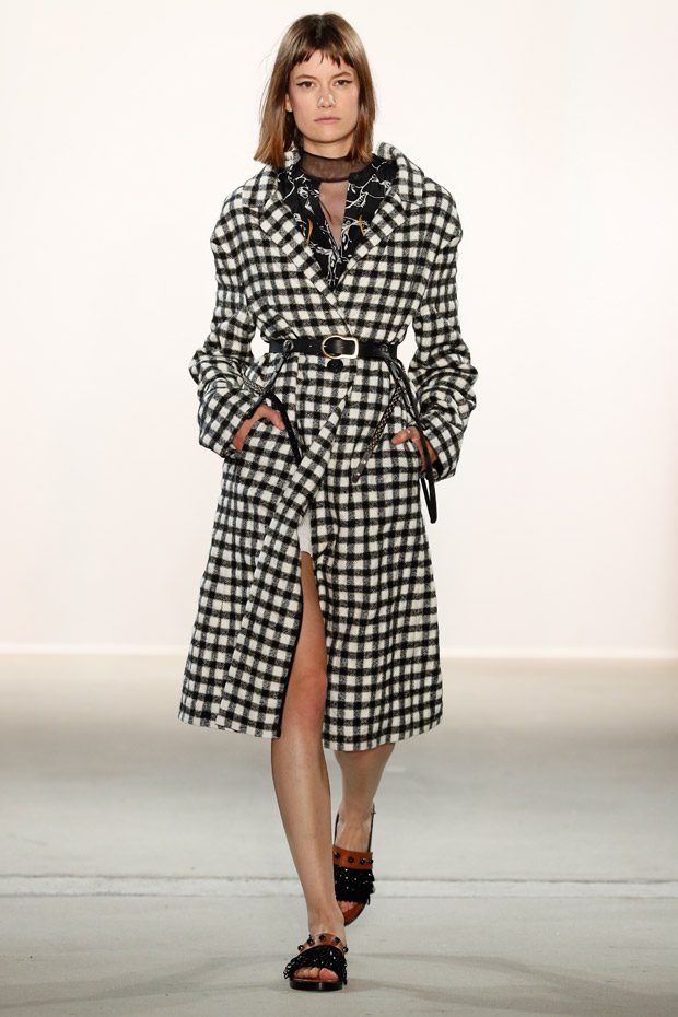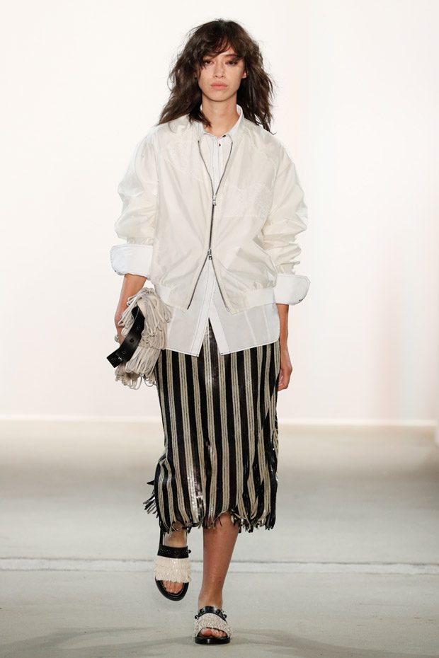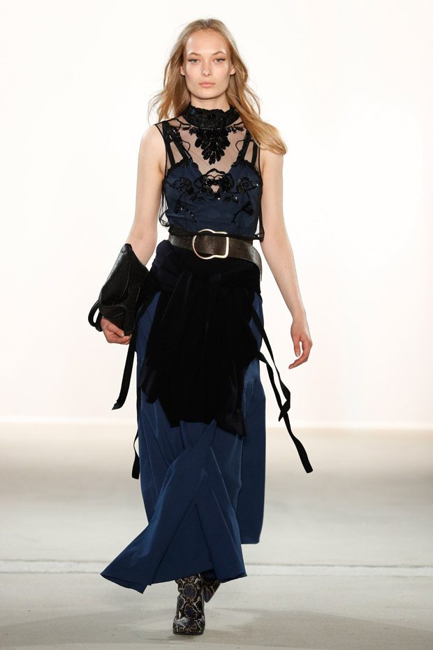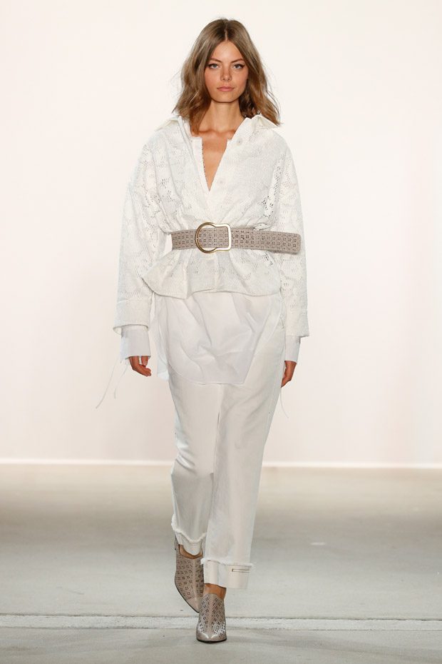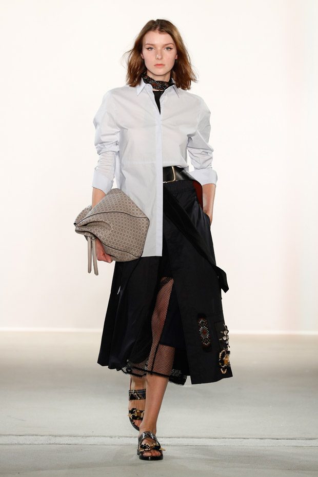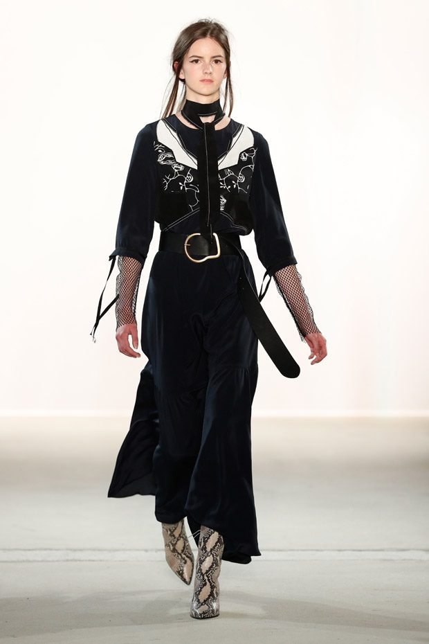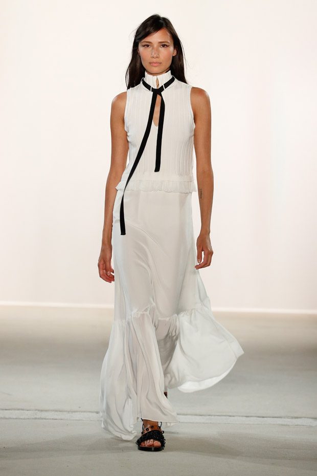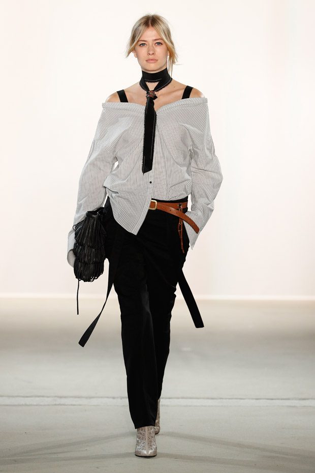 Being significant for this compelling collection is its layering look that often teams up with wrapped double belts. To underline the feminine approach of the outfits, sundry of the looks are accentuated on the waist. Length- wise, everything you can imagine, becomes real. Both mini- and maxi pieces are shown. Our highlight piece? We fell in love with a floor- length, floating dress in tangerine that is paired with a black clutch that is equipped with fringes. Sensual. sophisticated. smooth. Needless to mention, we had to add it on our Spring/ Summer 2018 wishlist.