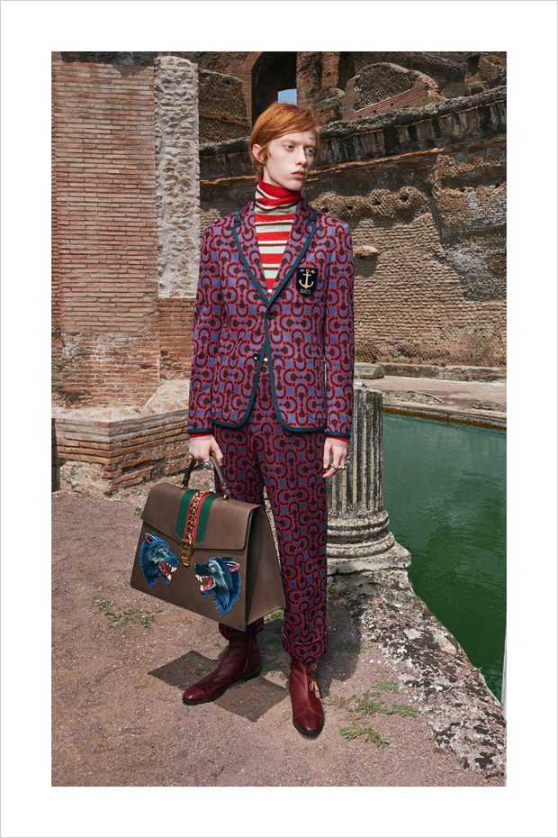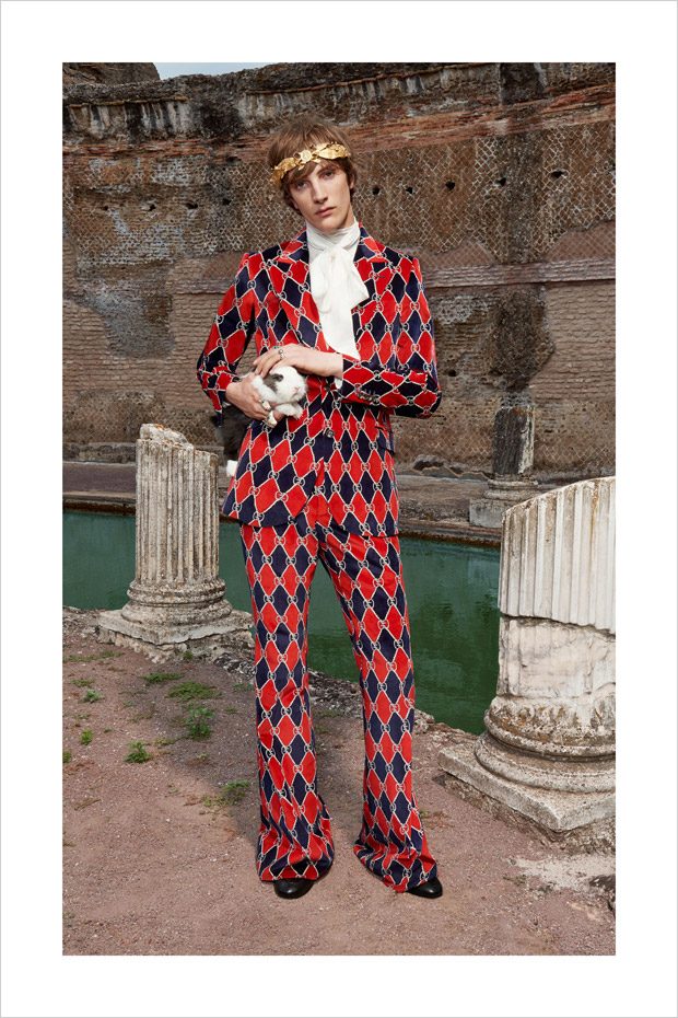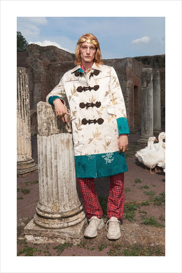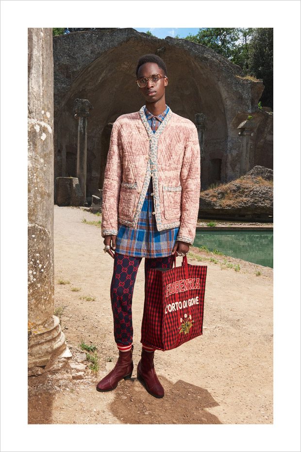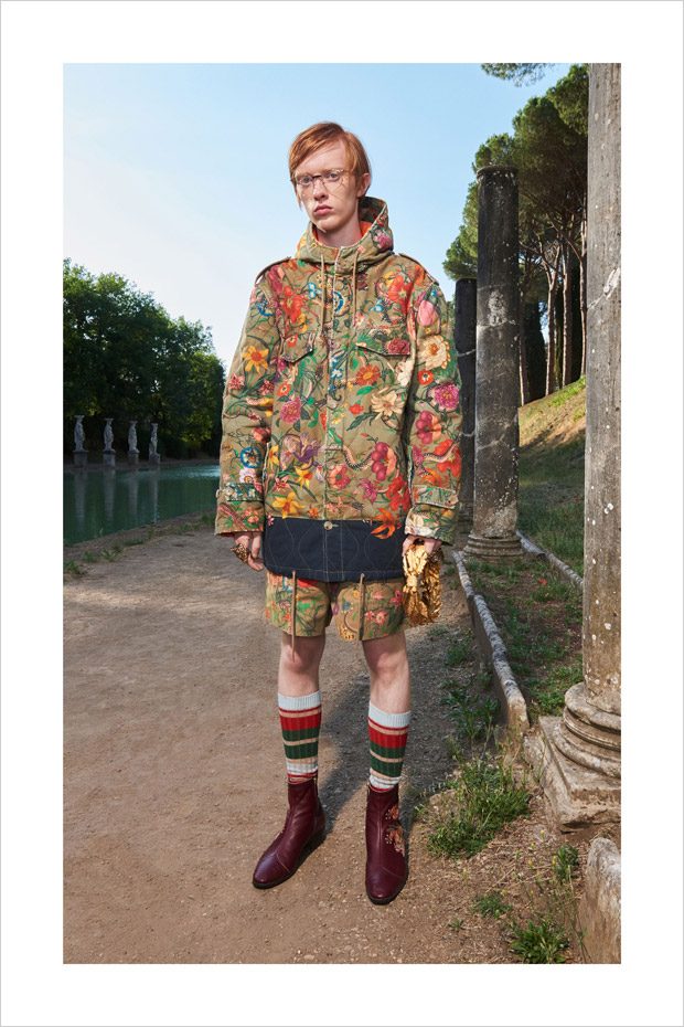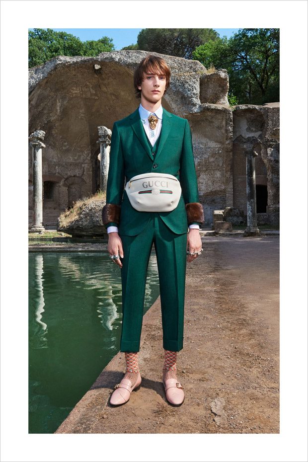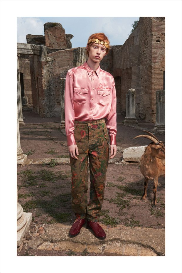 Italian designer Alessandro Michele presented Gucci‘s Resort 2018 menswear collection, with lookbook captured in Villa Adriana in Tivoli, Italy, by fashion photographer Elaine Constantine.