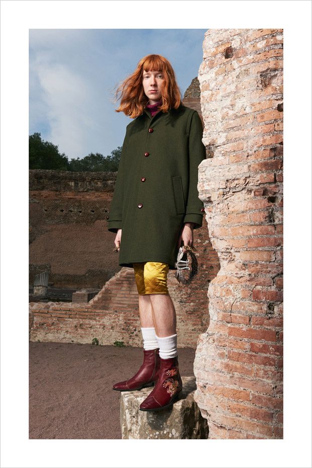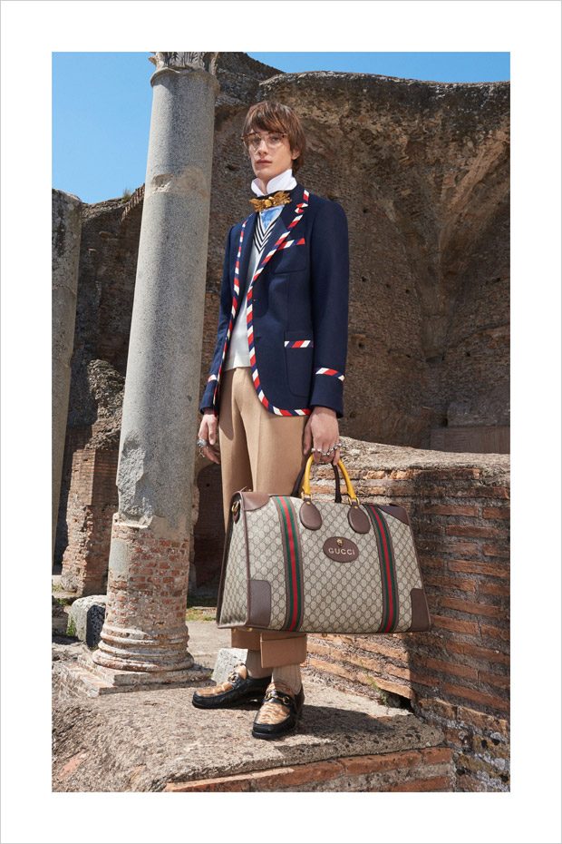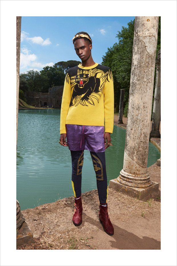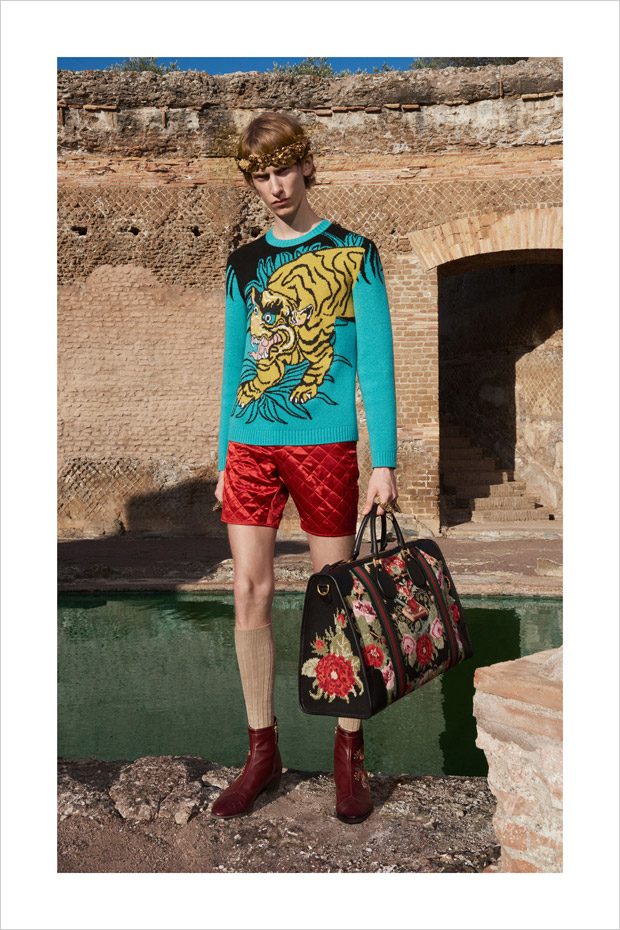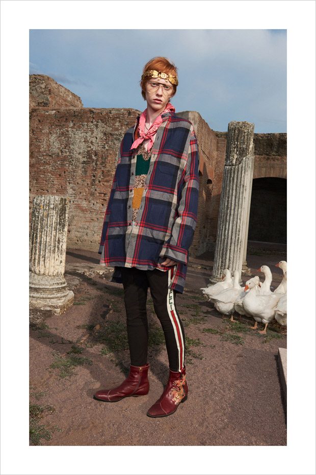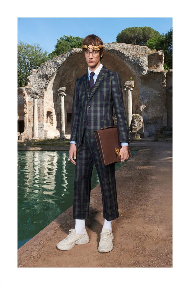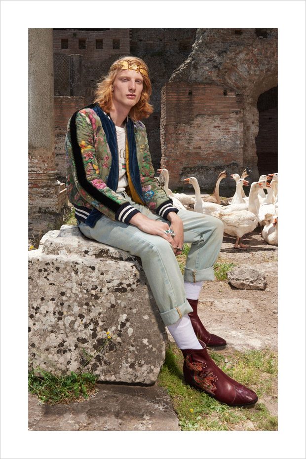 Italian designer Alessandro Michele presented Gucci‘s Resort 2018 menswear collection, with lookbook captured in Villa Adriana in Tivoli, Italy, by fashion photographer Elaine Constantine.