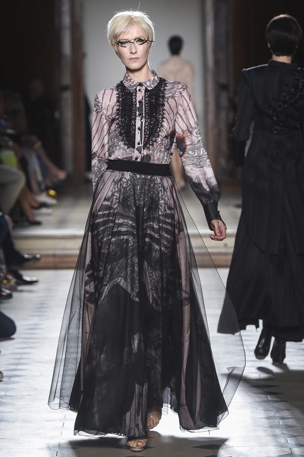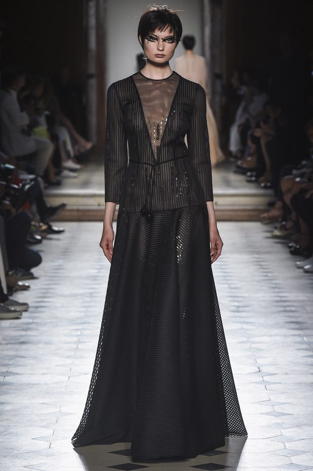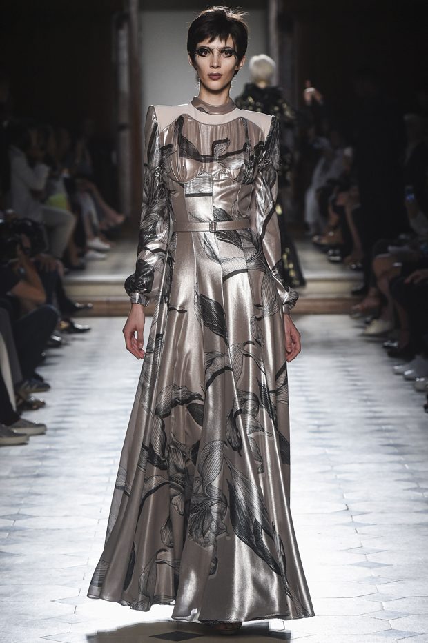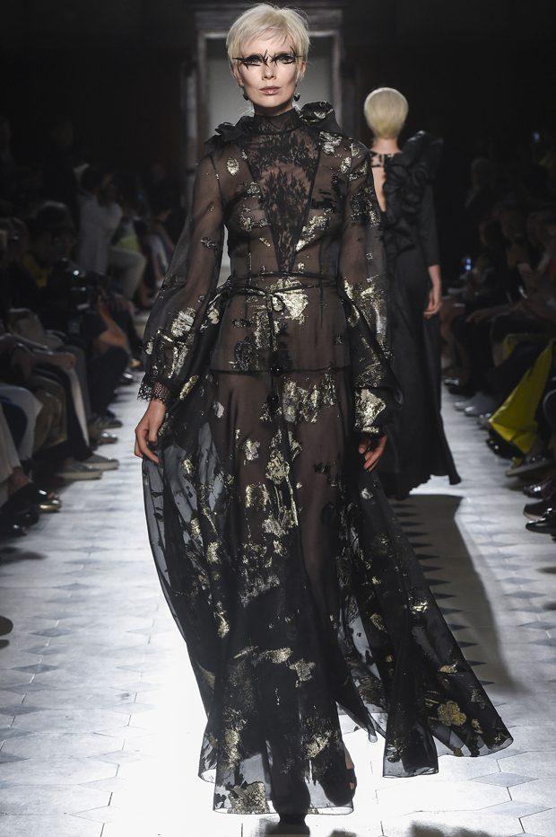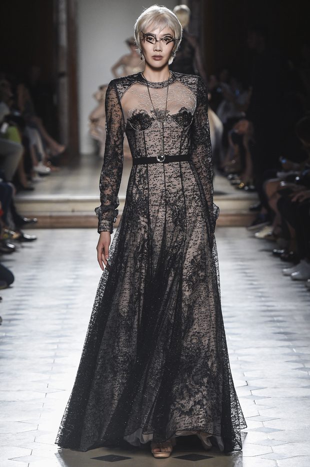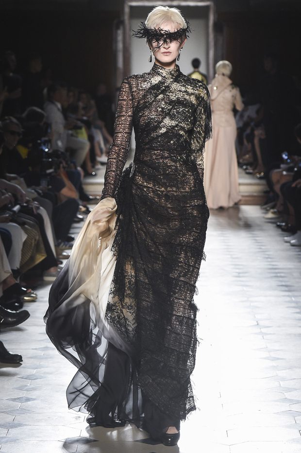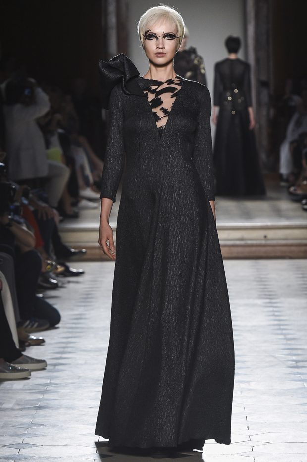 Julien Fournié pays tribute to the ladies with a destiny who have become his customers. Far from any fashion trend and a thousand leagues away from vulgar red carpet outfits, these empowered ladies represent genuine fashion icons. The couturier is proposing to these muses his expert cut looks which help lift up the spine to define the elegance of timeless Haute Couture in a contemporary expression with some delicate Gothic accents. – from Julien Fournié