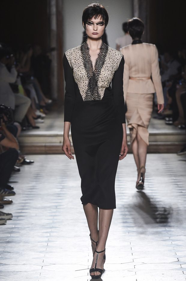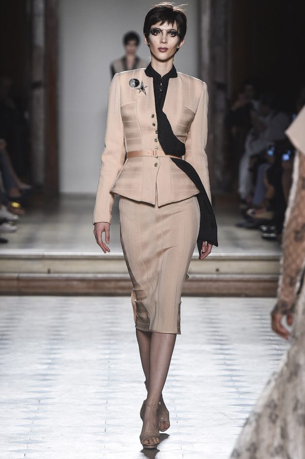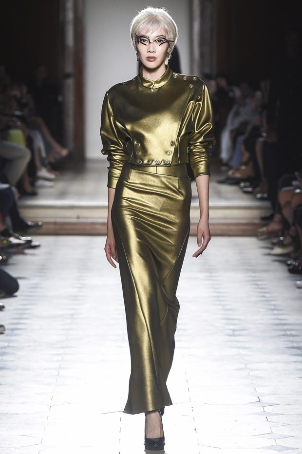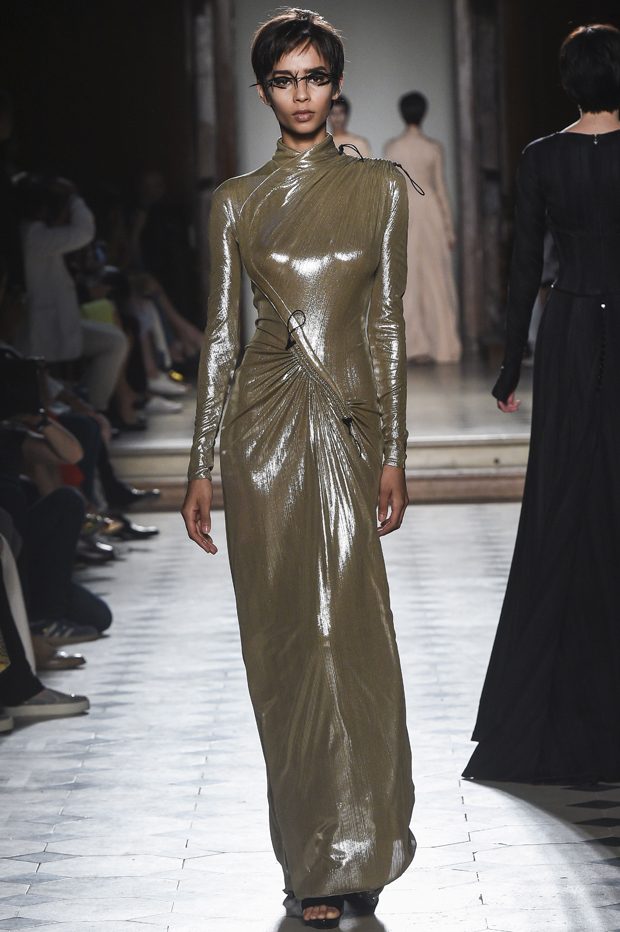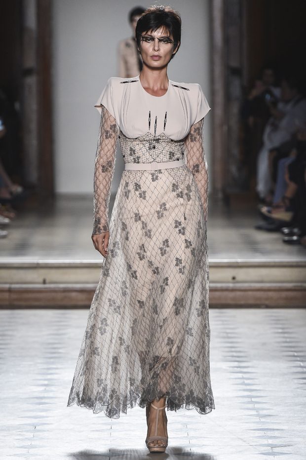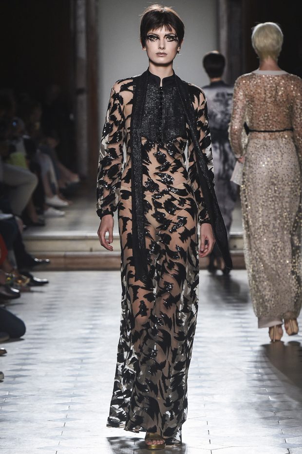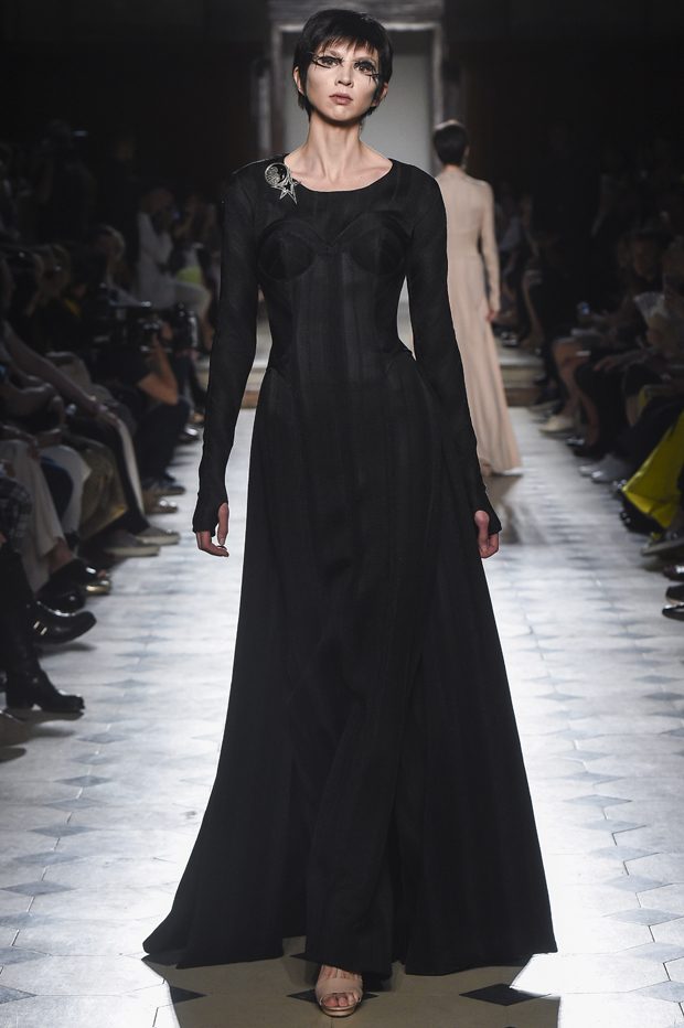 Julien Fournié pays tribute to the ladies with a destiny who have become his customers. Far from any fashion trend and a thousand leagues away from vulgar red carpet outfits, these empowered ladies represent genuine fashion icons. The couturier is proposing to these muses his expert cut looks which help lift up the spine to define the elegance of timeless Haute Couture in a contemporary expression with some delicate Gothic accents. – from Julien Fournié