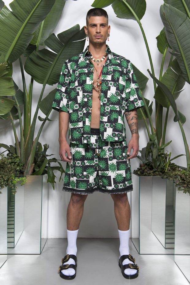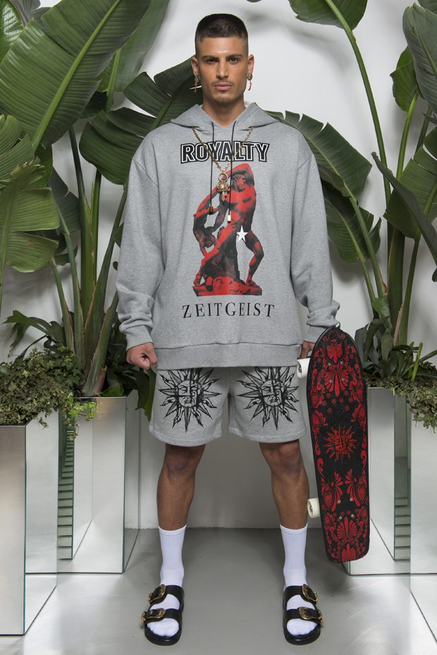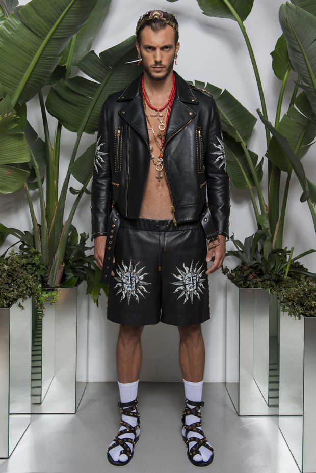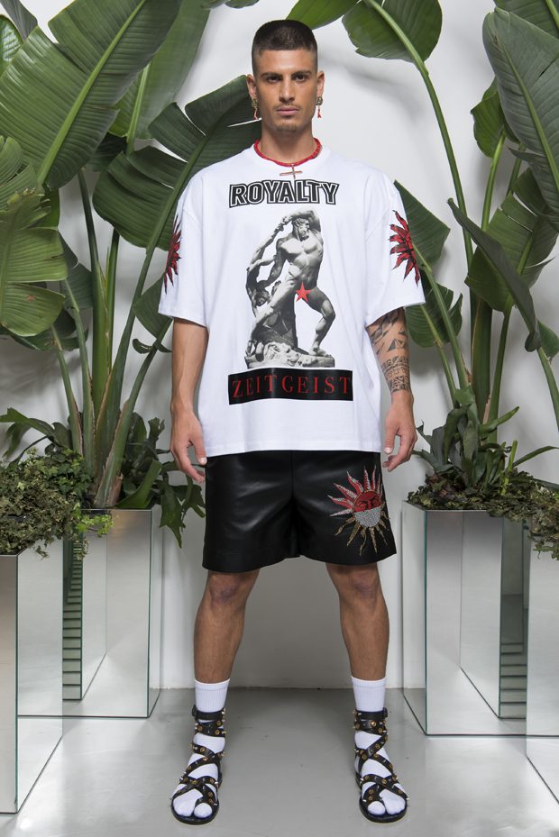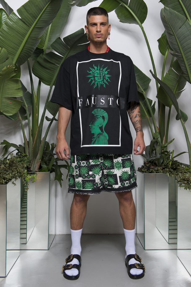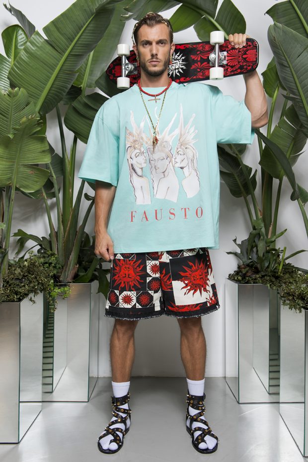 Discover Fausto Puglisi’s Spring Summer 2018 collection presented during the Milano Fashion Week. Combining the ancient Rome and Greece influences with the hip-hop and streetwear, the collection features leather bombers, motorbike jackets and nylon windbreakers, as well as baggy shorts and relaxed silhouettes, decorated with the designer’s Baroque graphics.
