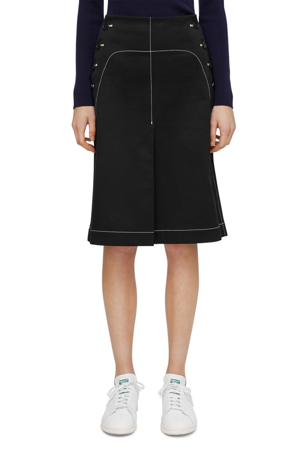 A mid-length skirt crafted from robust cotton twill with contrasting stitching, detailed with a sailor-inspired double buttoning.