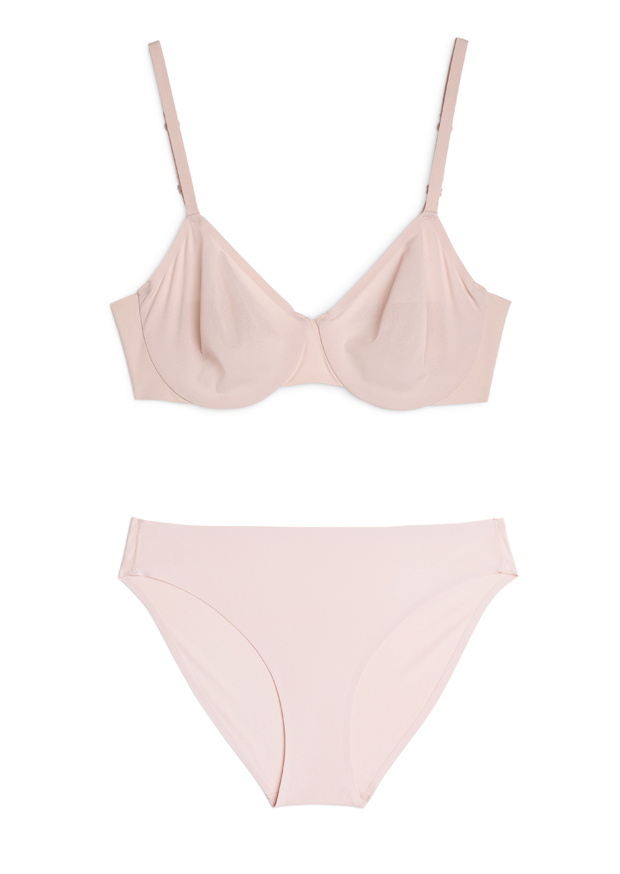 A wire bra and briefs in a soft, semi-sheer micro fabric made of recycled polyamide.