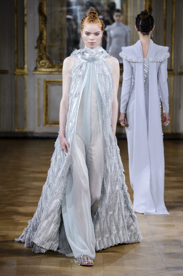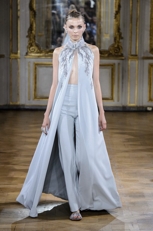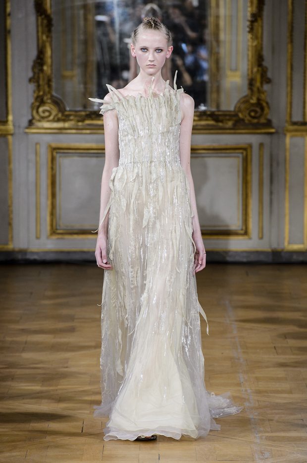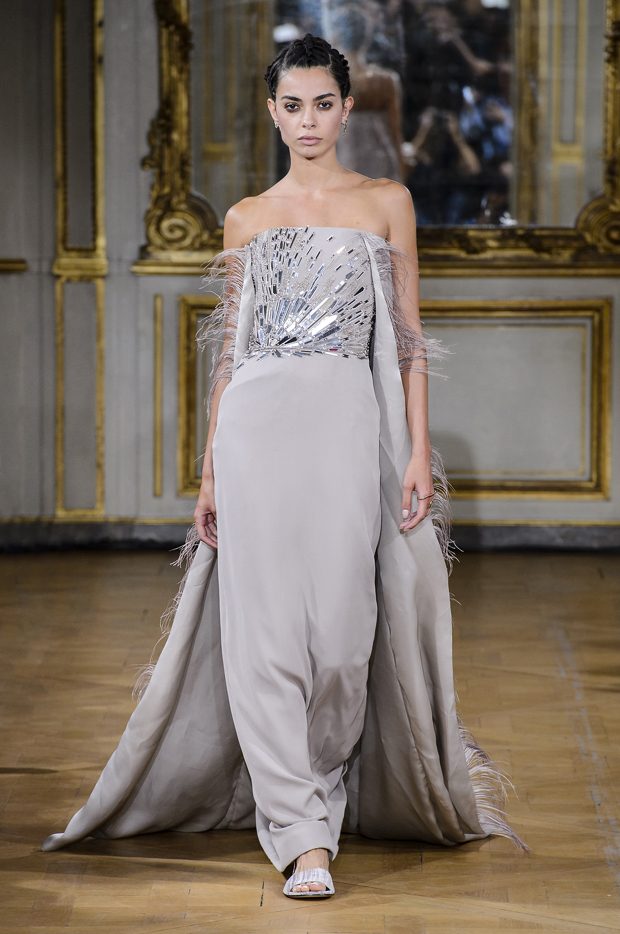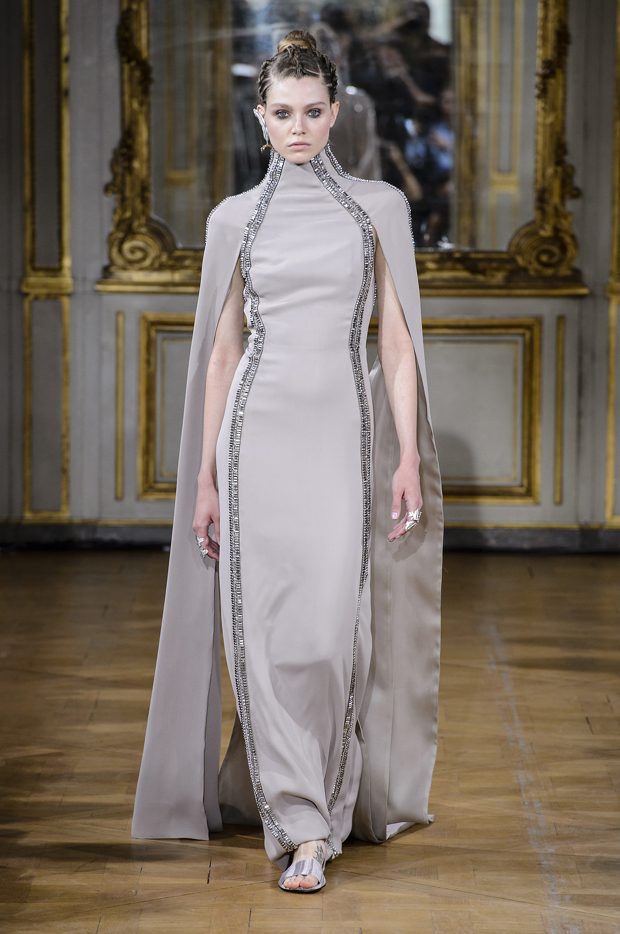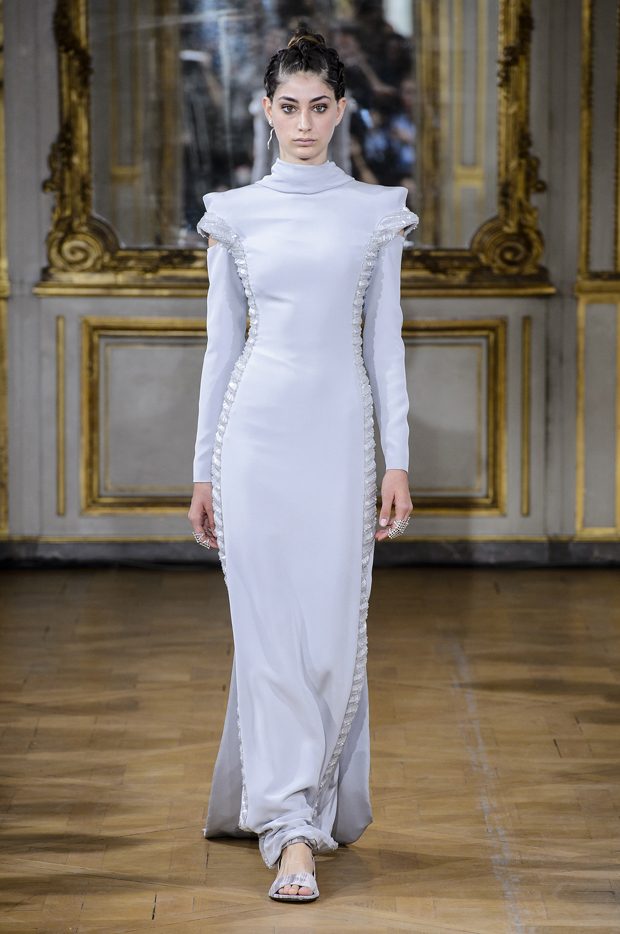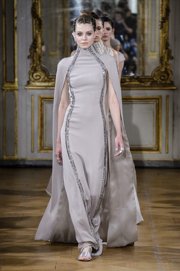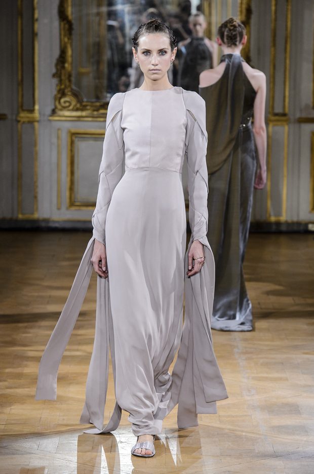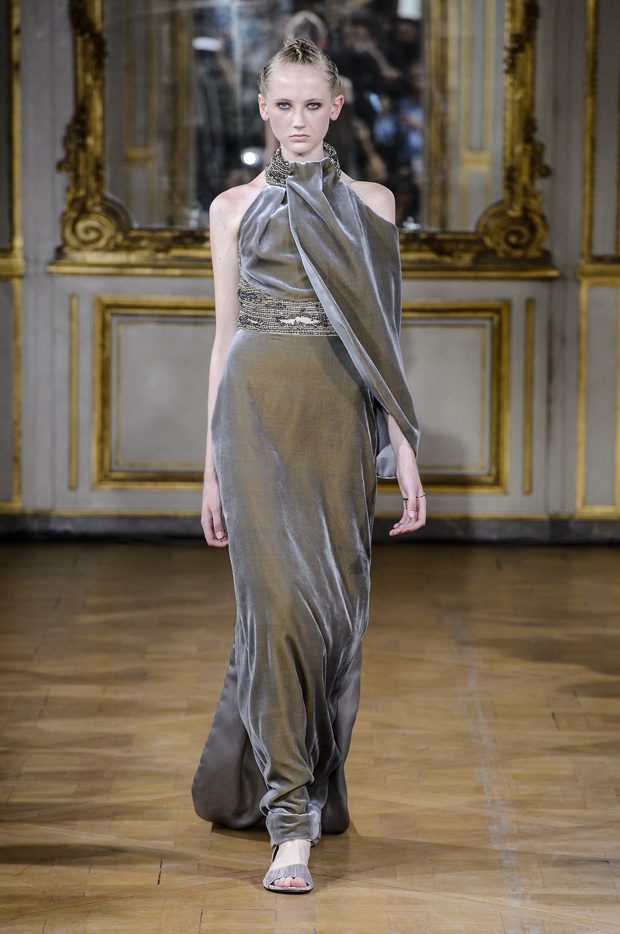 For autumn-winter; hoods, redingotes and coat dresses in wool combined with tailored pants that follow the silhouette, enhancing it. Embroidery, inlays and cuts, even asymmetrical, embellish each dress. The designer plays with materials and fabrics: from the presence of the leather on the basque bodices where fur edges stand out, while embroidered leather sequins melt on crêpe cady creating a contrast in materials. Stitch effect embroidery in metal, dresses in crêpe cady carve the body with experimental modelings, always a passion of the designer. Creations of embroidered glass effect seem reproductions of shattered mirrors. Tulle and thread embroidery generates a diamond shape mirror effect as if it was breaking against the body. Fringes held by leather bodices and organza inlays recall the diamond cut. Precious wool and flannel, careful research of cashmere and inlaid fabrics, embellished with crystals and laser-treated ostrich feather make way for voluminous sculptures. The color palette evokes Nordic and glacial colours: from light grey that evolves from ice, powder blue to hematite, passing to yellow ocher, dove grey, pale pink and shades with the use of georgette lamé. Dresses combined with leather gloves, low velvet sandals and jewels created specifically for the collection by designer Bernard Delettrez. – from Antonio Grimaldi