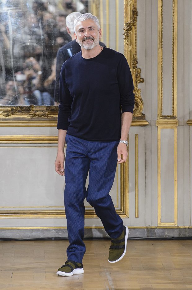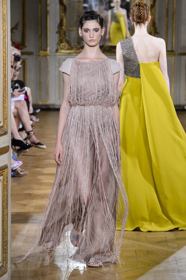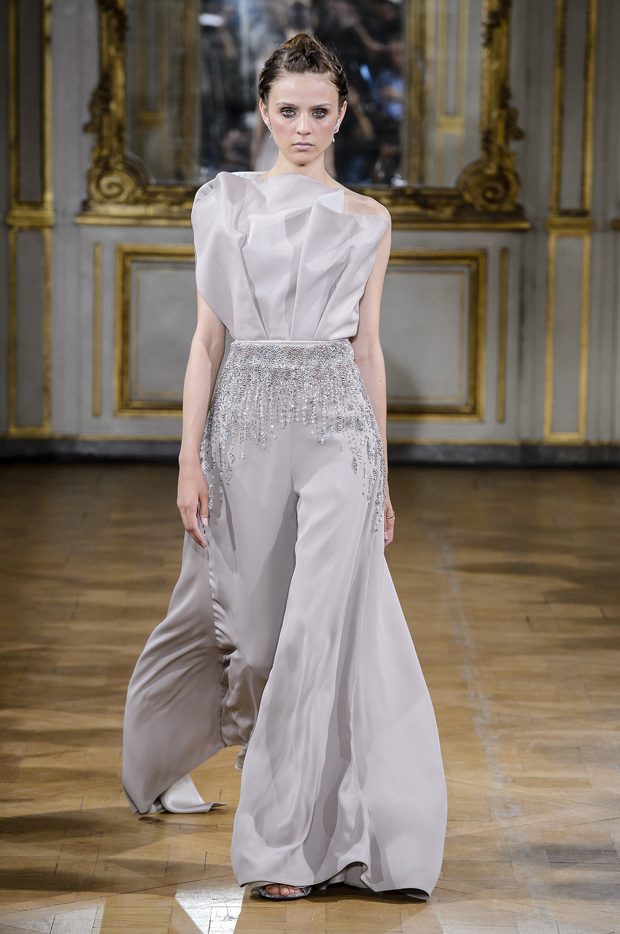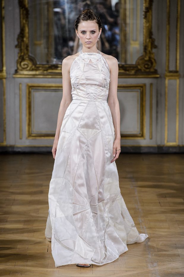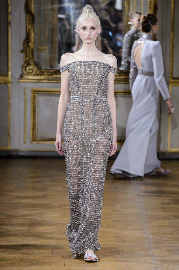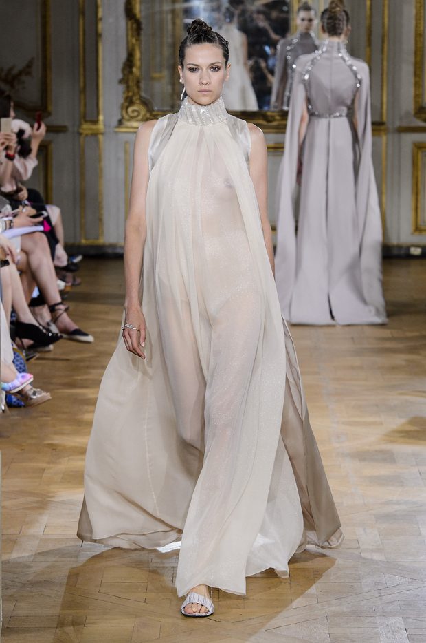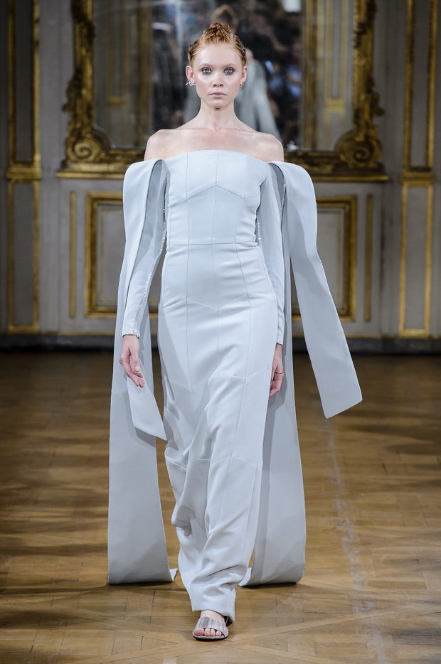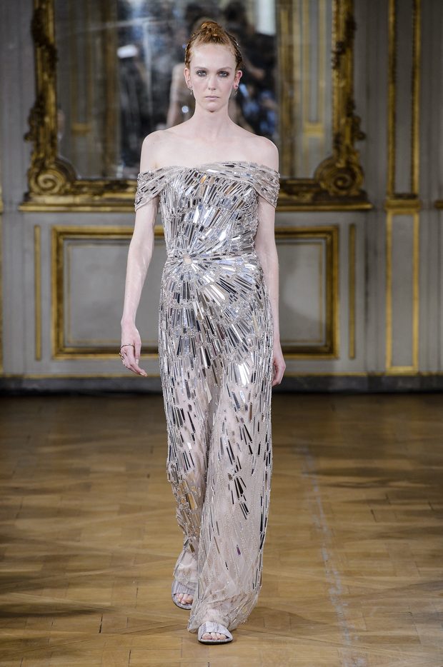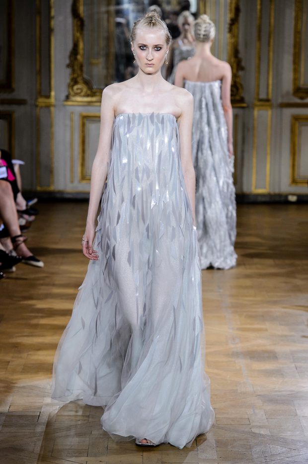 For autumn-winter; hoods, redingotes and coat dresses in wool combined with tailored pants that follow the silhouette, enhancing it. Embroidery, inlays and cuts, even asymmetrical, embellish each dress. The designer plays with materials and fabrics: from the presence of the leather on the basque bodices where fur edges stand out, while embroidered leather sequins melt on crêpe cady creating a contrast in materials. Stitch effect embroidery in metal, dresses in crêpe cady carve the body with experimental modelings, always a passion of the designer. Creations of embroidered glass effect seem reproductions of shattered mirrors. Tulle and thread embroidery generates a diamond shape mirror effect as if it was breaking against the body. Fringes held by leather bodices and organza inlays recall the diamond cut. Precious wool and flannel, careful research of cashmere and inlaid fabrics, embellished with crystals and laser-treated ostrich feather make way for voluminous sculptures. The color palette evokes Nordic and glacial colours: from light grey that evolves from ice, powder blue to hematite, passing to yellow ocher, dove grey, pale pink and shades with the use of georgette lamé. Dresses combined with leather gloves, low velvet sandals and jewels created specifically for the collection by designer Bernard Delettrez. – from Antonio Grimaldi