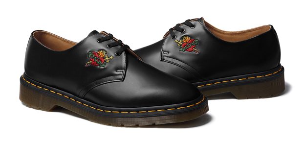 Supreme has worked on another new collaborative project with British footwear brand Dr. Martens on a custom version of the 3-Eye Shoe. Available in three colorways of black, green and red, the shoe features a vintage smooth leather upper with embroidered sacred heart graphic and AirWair® cushion sole.