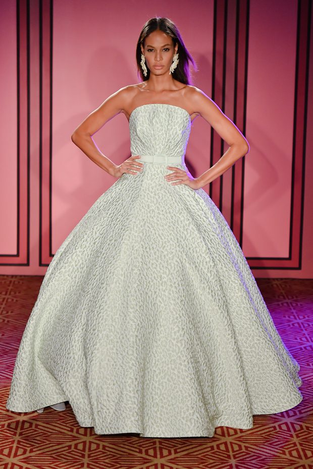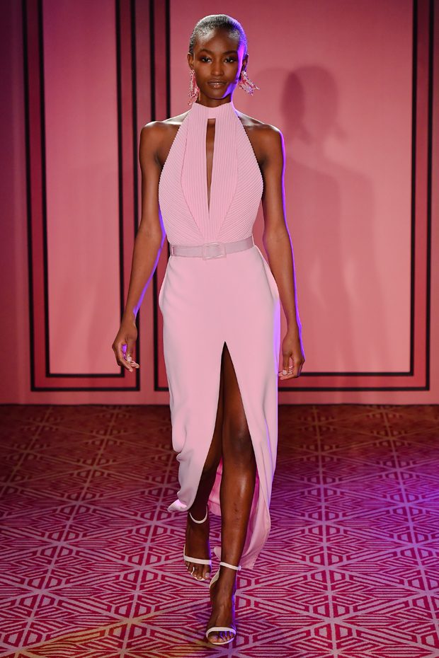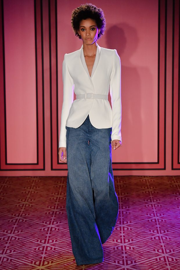 With a shift to daywear, Maxwell turns to stretch and double faced crepe, chiffon, leopard jacquard, cotton twill shirting, silk satin and silk knit, acid wash alligator skin as well as mohair and gazaar. Maxwell introduces his interpretation of upscale denim as well as jersey. Maxwell utilizes techniques, such as pin-tucking conveying a delicate and feminine tone. The collection tells a story from a southern perspective – custom leopard lace is covered in hand sewn pearls, grosgrain ribbon as well as monogramming and embroidery with artwork from Texan artist Jules Buck Jones, all hail symbols of classic Americana. A first, Maxwell introduces new product categories with a selection of accessories this season. Earrings by Lunch at the Ritz by Zander Elliott, belts, and a specially designed handbag – worn by six of his muses as they strut down the runway. More than ever, the Brandon Maxwell woman is determined, confident, free, and unconventional. Above all, she is happy and free. – from Brandon Maxwell