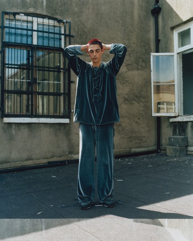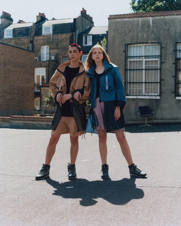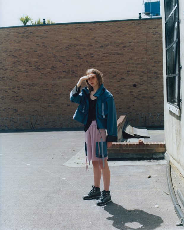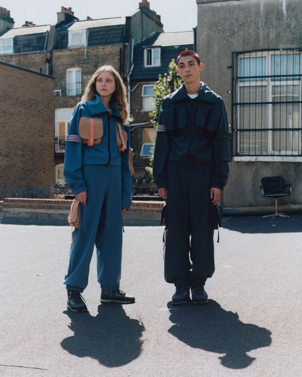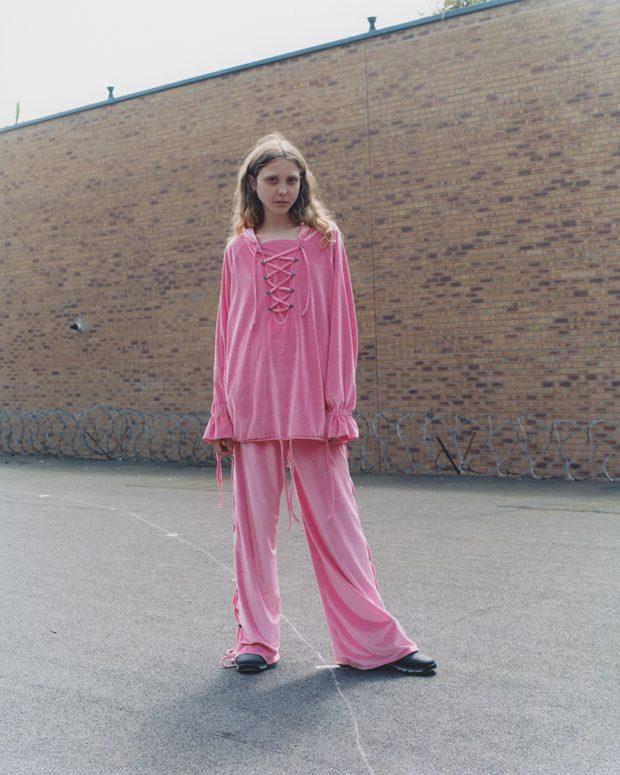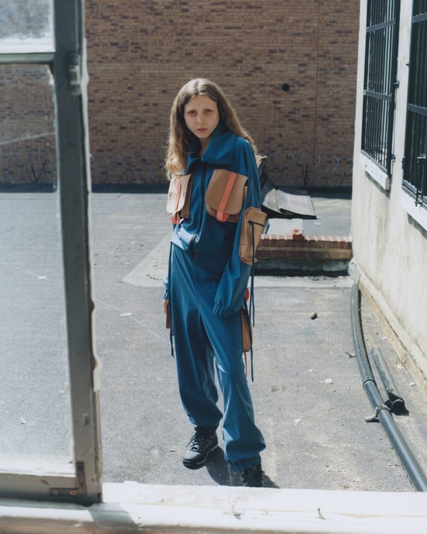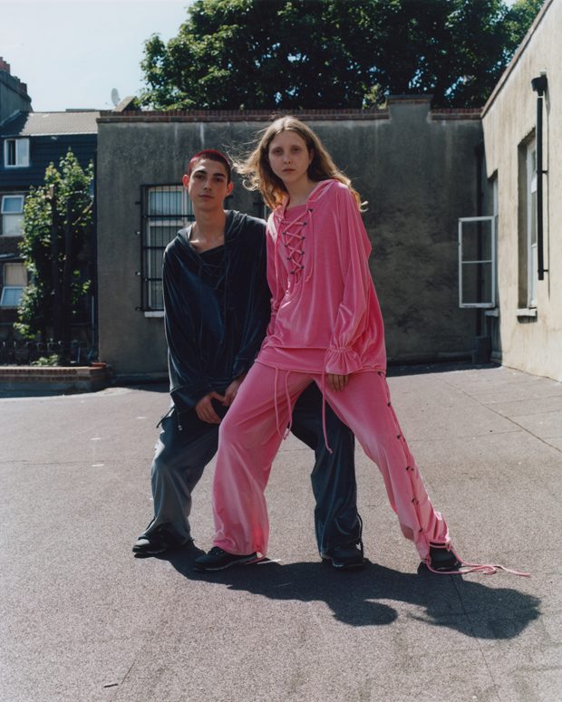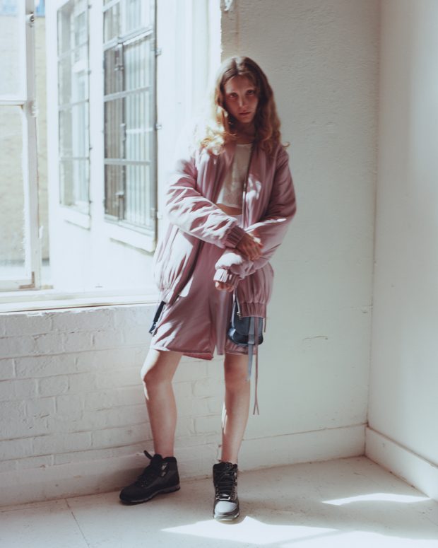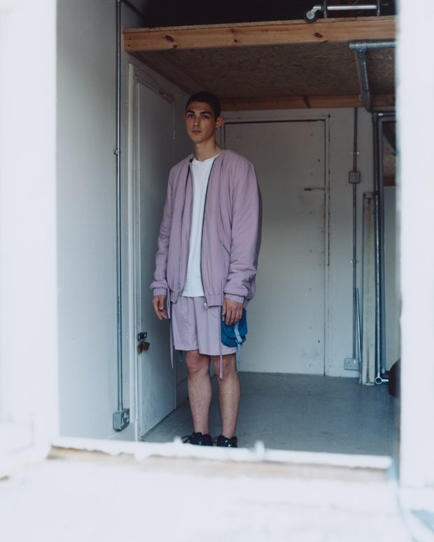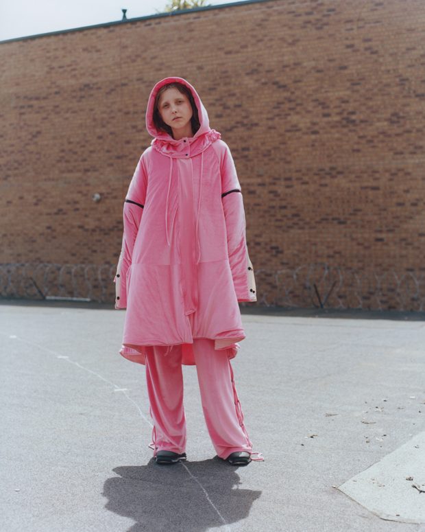 Charli Cohen present the spring summer 2018 ready- to-wear collection in London. The collection, a Men’s + Unisex, consists of a dark color palette while some pieces are more bold, in different shades of pink, red and beige. The garments have a baggy silhouette with drawstrings hanging off them.