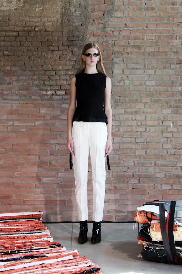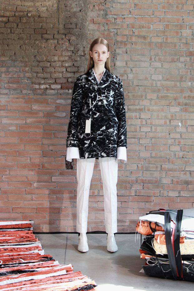 A landscape of sculptural silhouettes created from blocks of color in a refined palette of pink, black, and white, are interrupted by the occasional burst of orange. A concrete exterior exposes chasms of fragility, echoed in juxtapositions of fabrics and raw finishes. Prints are applied across a variety of wovens, reinterpreted and distorted in mixes of techniques. Images and surfaces are scanned and blurred, and translated into textiles. Screen-printed by hand, or woven, physical threads are painstakingly teased out to reveal a surface tension of controlled irregularity. Body draped in cloth, tangled with skin exposed, the psyche is held together, ready from the inside out.