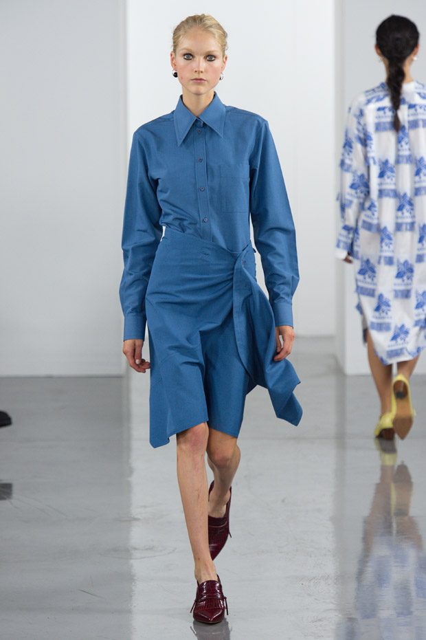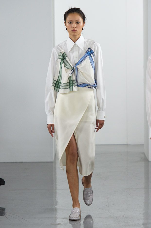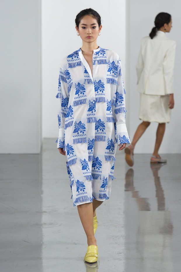 Masculinity and femininity are twin poles. Italian men’s suiting fabrics, uniforms and tailoring shapes are used to contrast with hyper-feminine elements – organdy embroidered with naive flowers, soft pleats and girlish pinafores. The contrasts complement. Men’s handkerchief form a decorative motif, oddly feminine when used as prints or fabric applications; robe-style coats have a modern fluidity and ease.