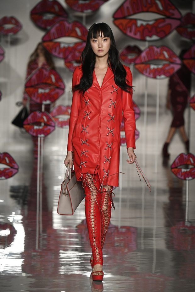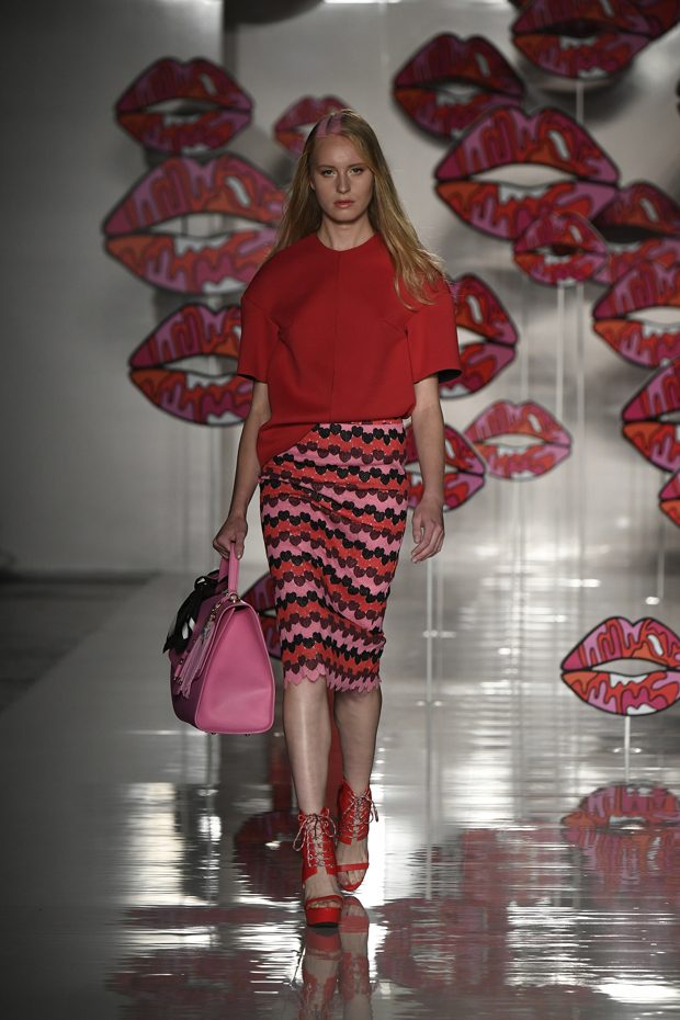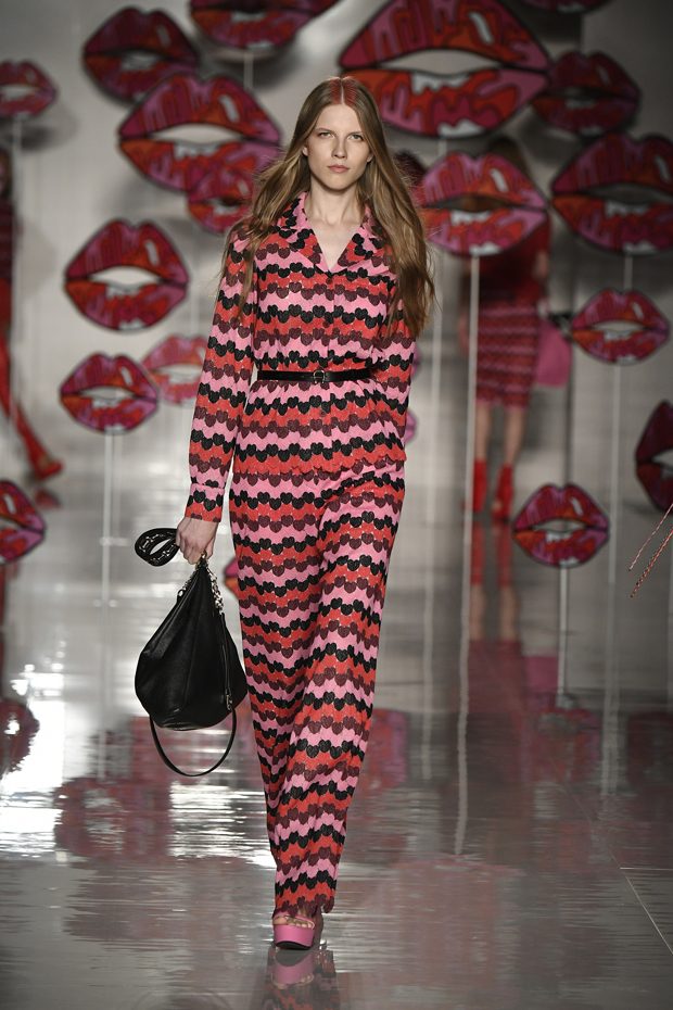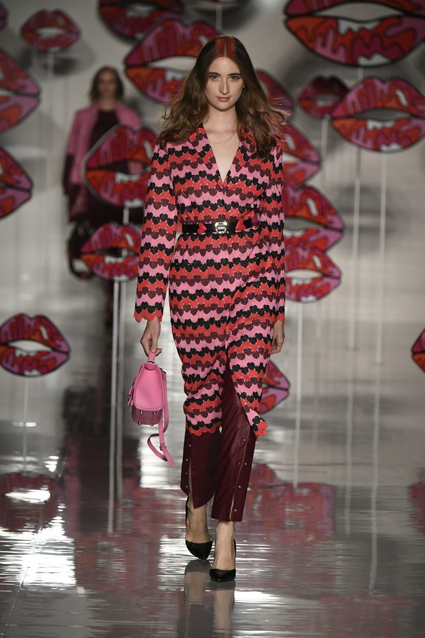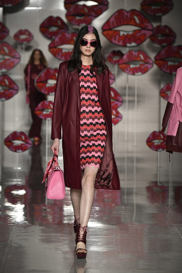 Worth of mentioning is the very special detail- awareness of this charming collection: look at those cheerful lipstick prints, the asymmetric tendencies, the subtle play with transparencies, those pretty bows that adorn the ankles of the models. The creations stay sporty, casual, sophisticated and sexy with just the right amount of each. Leather plays an important role in this collection, it can be found in a plenty of dresses, trousers, coats and skirts. One of our favourite looks is a jumpsuit that is provided with zig zag print in raspberry red, scarlet and rose. What an eyecatcher! It is exactly this print that appears on the next outfit anew, in form of a top that teams up with a bright orange etui skirt. Daring overknee boots in bright orange round off this striking look. Zig Zag prints play a central role in this collection- look at that knee- length dress in zig zag print that teams up with a burgundy red trench coat. Simply smooth!