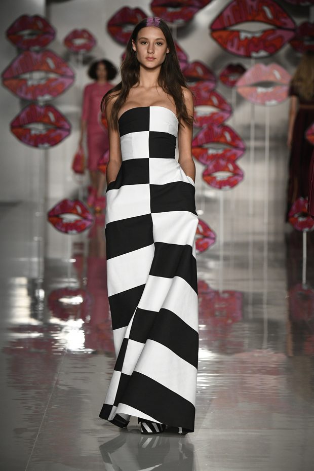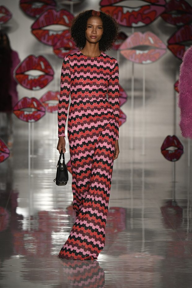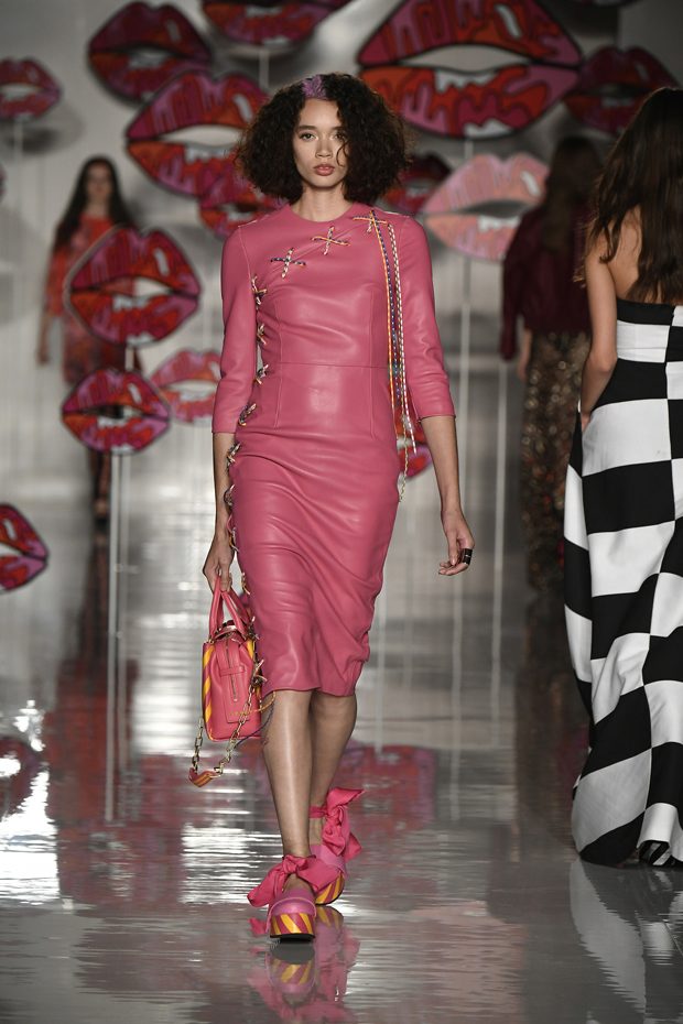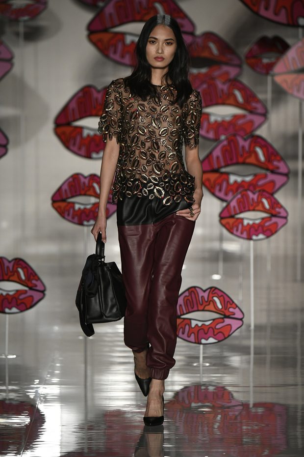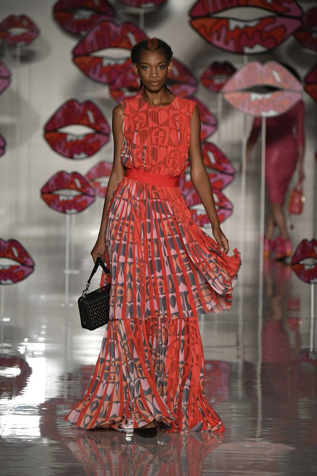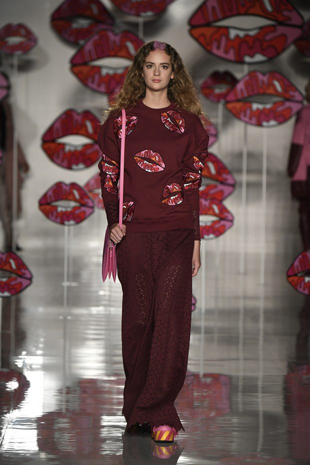 Worth of mentioning is the very special detail- awareness of this charming collection: look at those cheerful lipstick prints, the asymmetric tendencies, the subtle play with transparencies, those pretty bows that adorn the ankles of the models. The creations stay sporty, casual, sophisticated and sexy with just the right amount of each. Leather plays an important role in this collection, it can be found in a plenty of dresses, trousers, coats and skirts. One of our favourite looks is a jumpsuit that is provided with zig zag print in raspberry red, scarlet and rose. What an eyecatcher! It is exactly this print that appears on the next outfit anew, in form of a top that teams up with a bright orange etui skirt. Daring overknee boots in bright orange round off this striking look. Zig Zag prints play a central role in this collection- look at that knee- length dress in zig zag print that teams up with a burgundy red trench coat. Simply smooth!