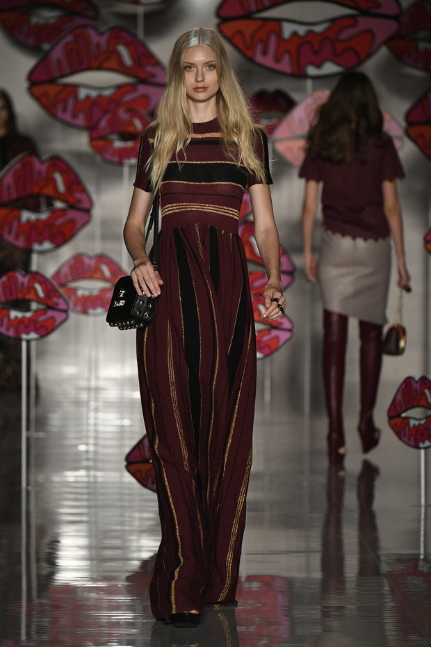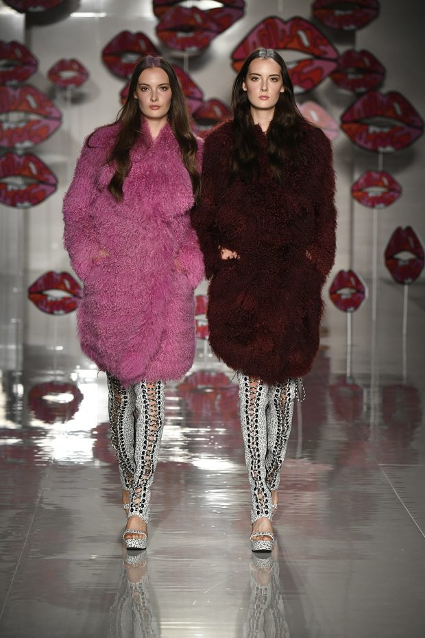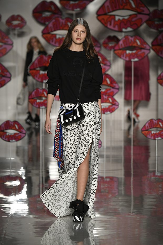 The preferred colour choice are striking hues that stay in mind. Thus, numerous shades of red are used, for instance cherry, maroon, scarlet and candy. That fresh red colour cocktail is vividly mixed and matched- the ’90s influences clearly shine through. Hereby a new candy pop culture, paired with extravagance, contemporary inspirations and zeitgeist appears. You may call it “Bubble Gum Fetish”, where elements taken from erotic influence are lifted to ultra classics. A few outfits are kept tonal, whereas the rest is a vivid celebration of various shades. Expect the unexpected! Additionally, a few more restrained, timeless tones are revealed, such as pewter, night black and offwhite. Rich gold, true blue, ultra green and sunny yellow create strong accents that stay in mind.