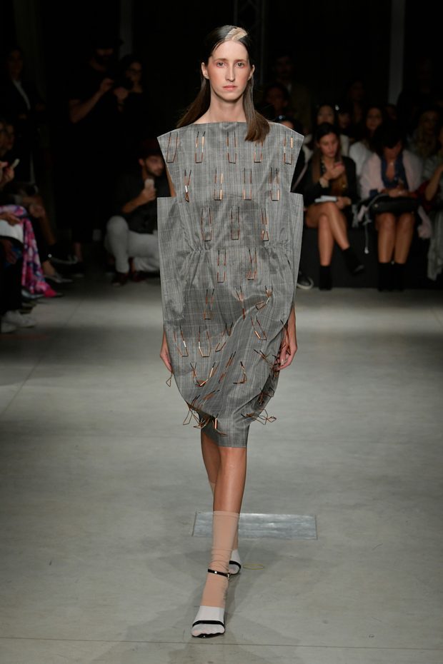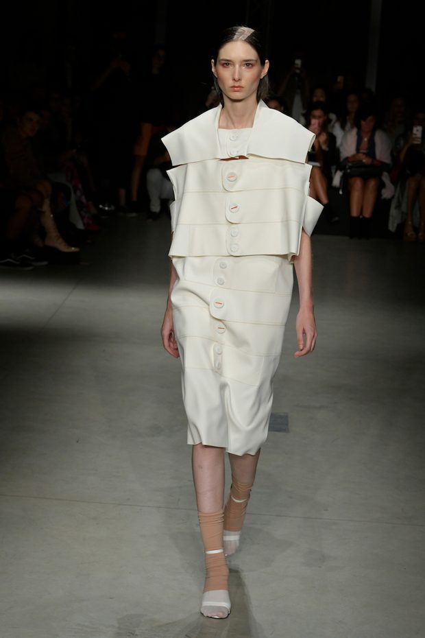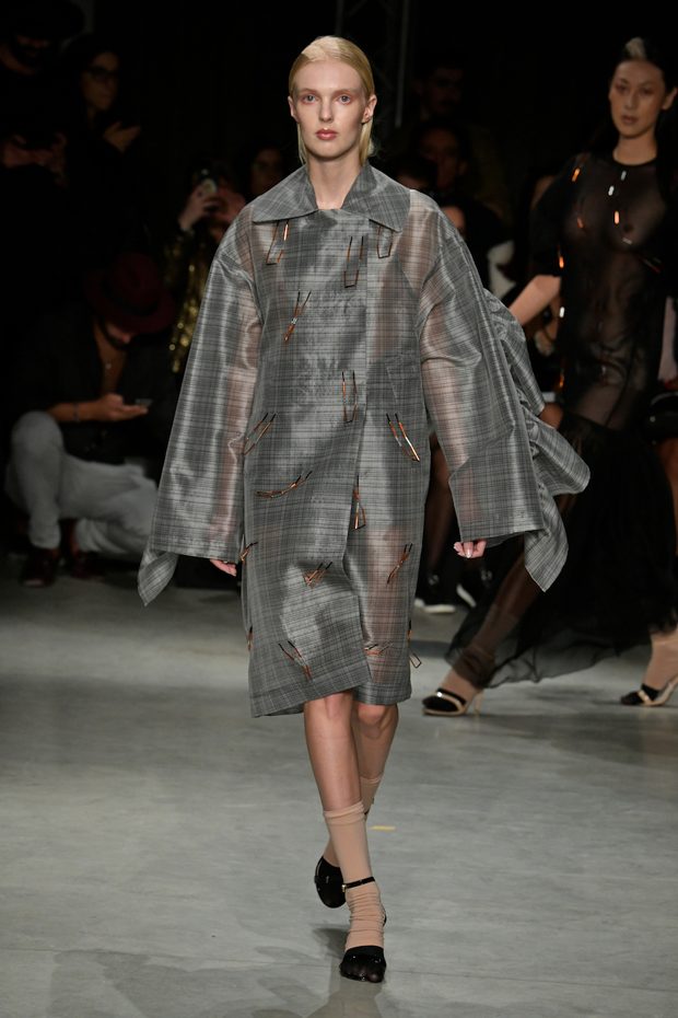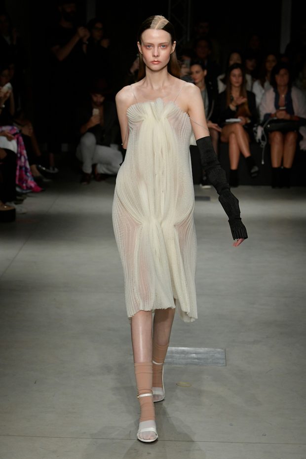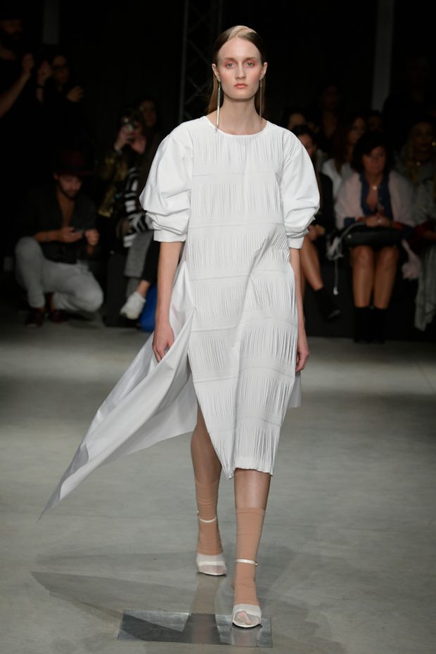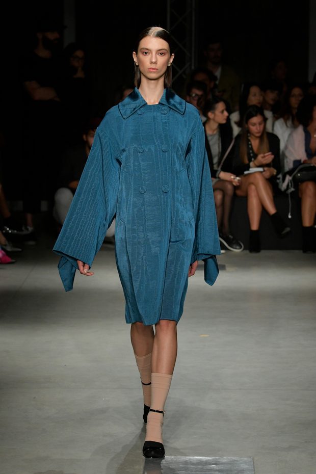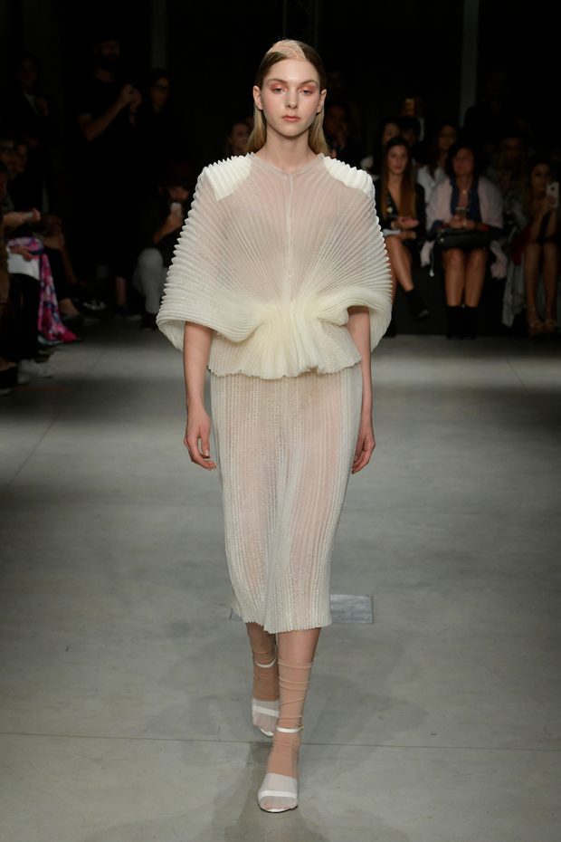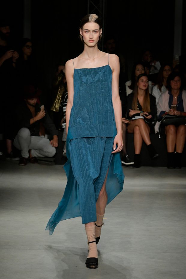 “Just like in a Felice Casorati’s portrait, here’s her pale, fragile skin emerging from the dark background, with a big comb among her hair, catched in the suspension of an instant. A research meeting in horizontal and vertical, square or rounded lines, and the recovery of precious tonalities in a slow travel between the sun and the lagoon. Enveloping and rounded pleated items dialogue with dynamic mohair wools and liquid chiffons decorated by Murano glass combs.”