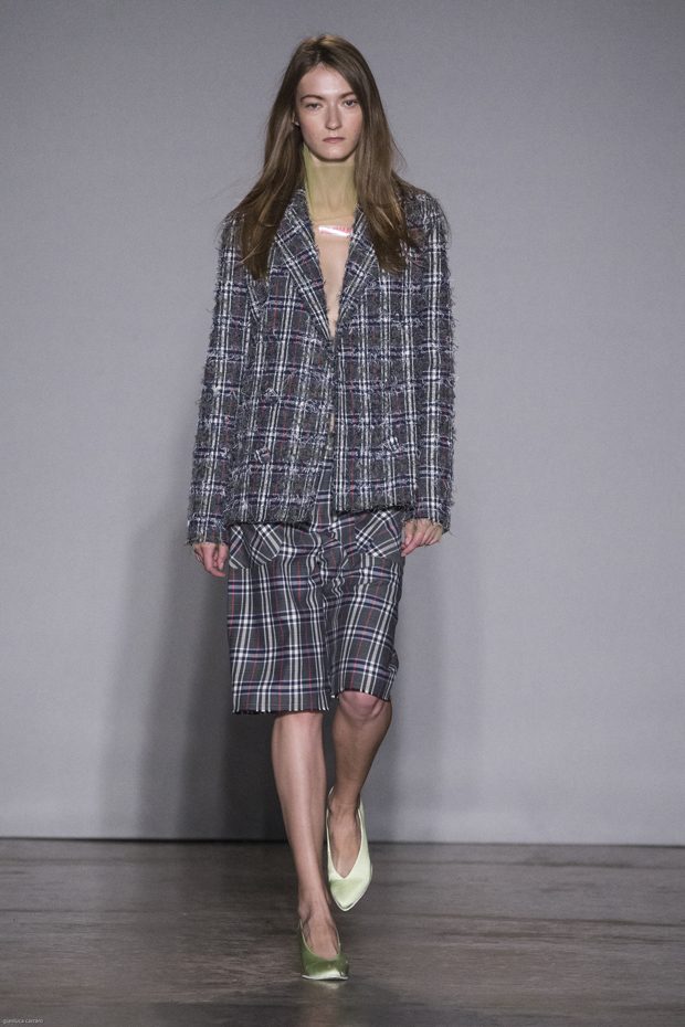 Cristiano Burani presented the spring summer 2018 collection at Milan Fashion week. Inspired by the search for new expressions of femininity and coolness, Electro Hawaii, as the collection is so aptly called, consists of neon colors for bold floral prints and overlapping layers of pleated net. The garments are constructed of cashmere and leather knitwear, leather threads with geometric detail and fringes in multiple colors. Cow boy boots with rubber sole and creeper shoes with plastic coated and colored inserts, techno satin polyurethane heel pumps.