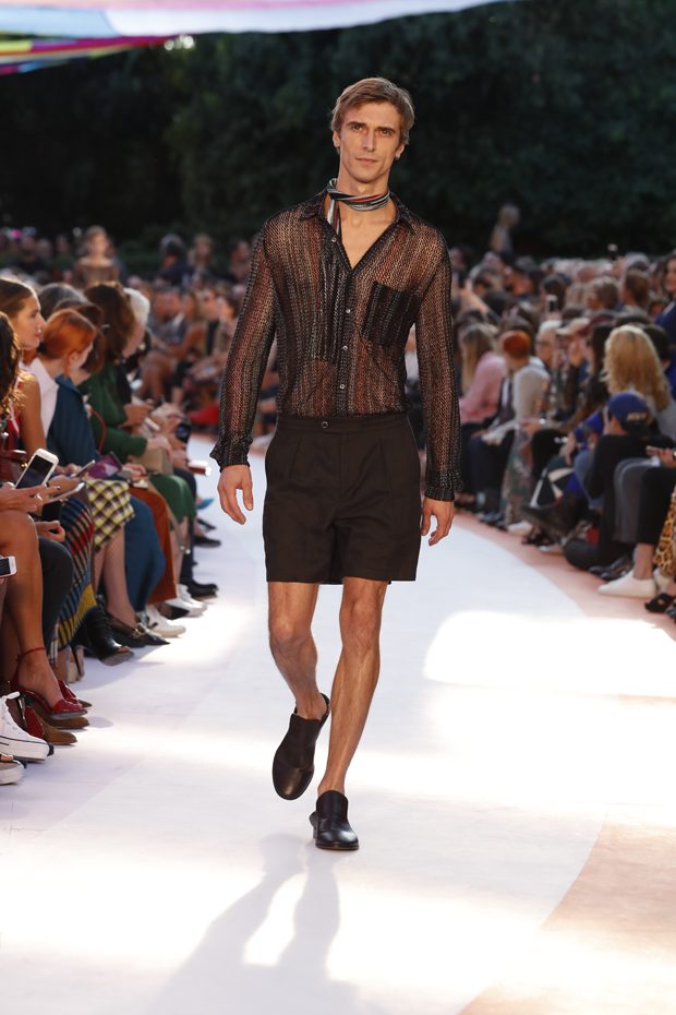 “Alluring, sensual transparencies and deep necklines contrast with masculine style pullovers in opaque melange or multicolor patterns. Loom-worked or intarsia pieces alternate with translucent slick-effect tees, blousons, and tank tops in viscose “macro-fiammata” lurex. Worn with pants or linen shorts and paired with slipper shoes in fabric or hand painted leather. For women, high-waisted briefs under long see-through dresses. Lurex leggings. Slingback shoes in python, or beaded slides. Big earrings with button-drop pendants in enamel and metal. Wide-brimmed straw hats that sensuously skim the shoulders add accents of unmistakable glamour.”