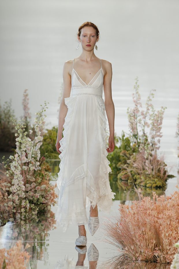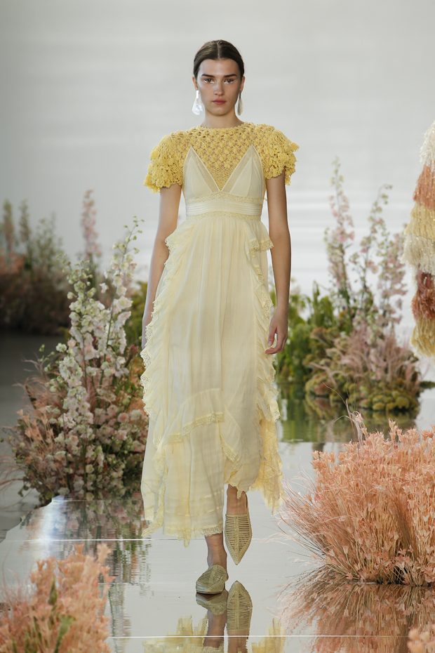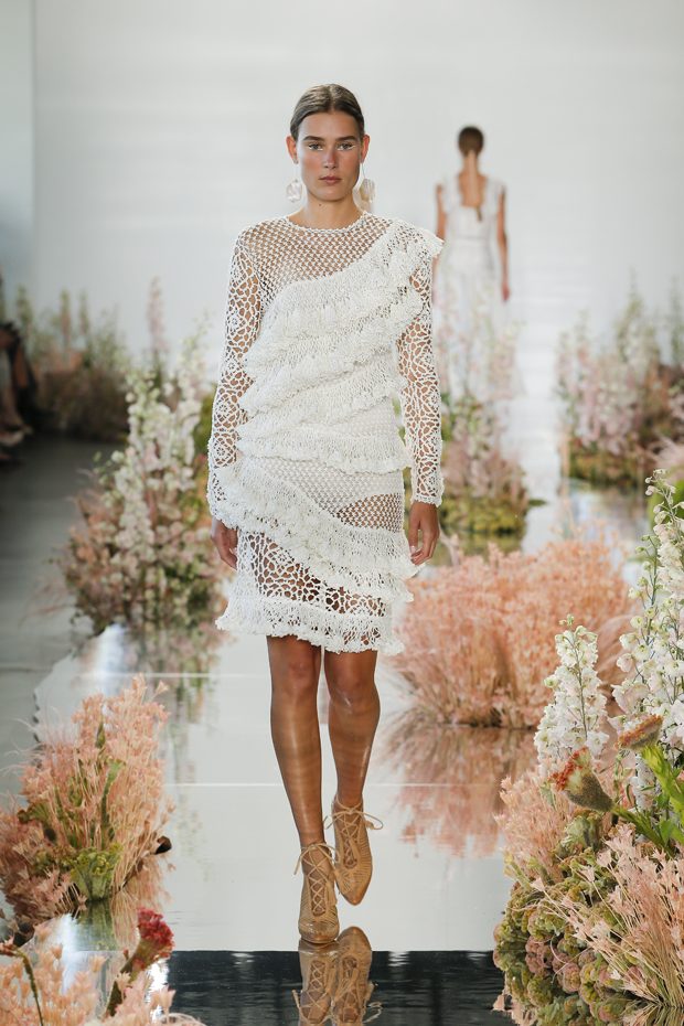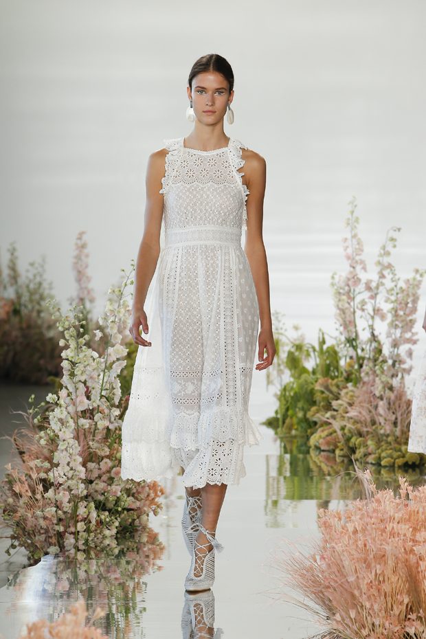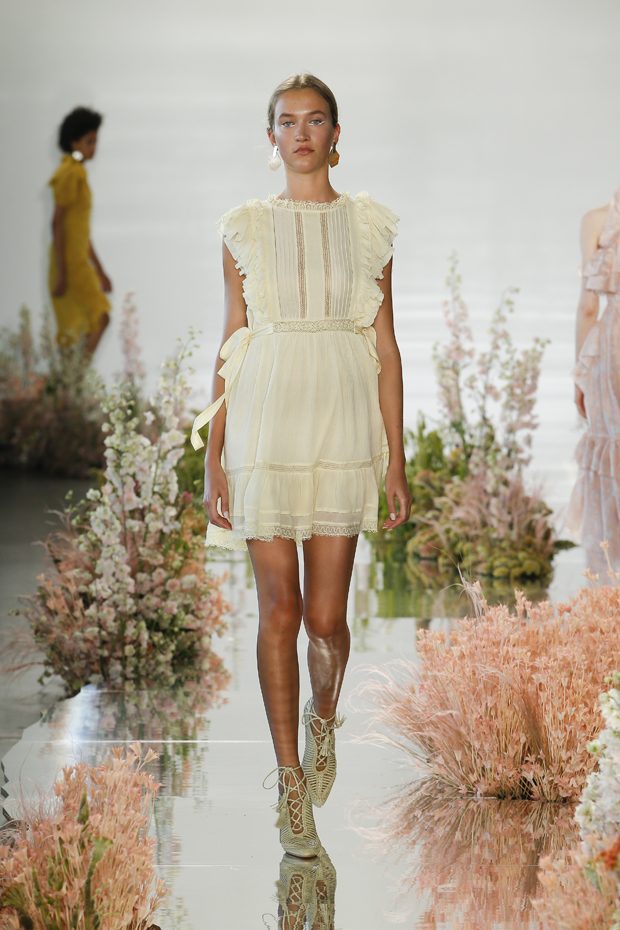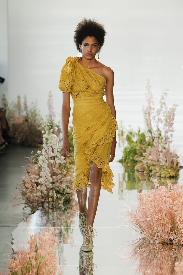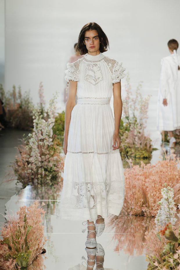 The investigation of openness continues with fabric manipulation and splicing: cotton eyelet is patch worked and shot through with lace; blown up netting is embroidered and paneled with weighty cottons; tissue thin jacquard is scattered with an abstracted floral; delicate hand crochet is worked into contrasting areas of density and finished with elaborate ruffles. Whisper-light silk tulle is ruched into gathered bodices and extended into floating skirts. The lyrical lightness is set against structure as seen in layered denims that crisscross and conform to the body, while creating new shapes in a graphic palate of optical white, jet black, and pine green. Suede is draped like silk into asymmetrical dresses, laced back tops, and louche trousers. A serene foundation of whites and pale yellows is blown up with a shock of bright – chartreuse, bubblegum pink, bright purple, and acid green serve to disrupt the status quo. – from Ulla Johnson