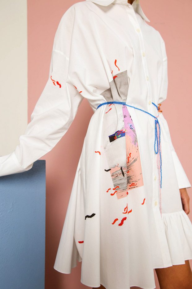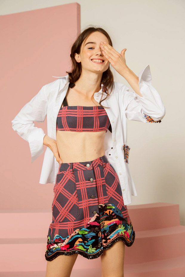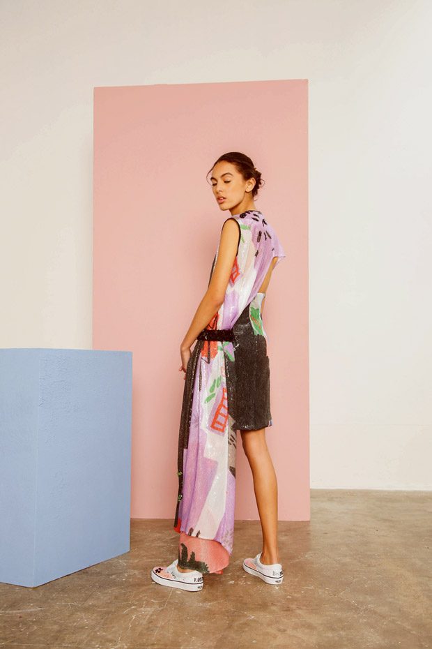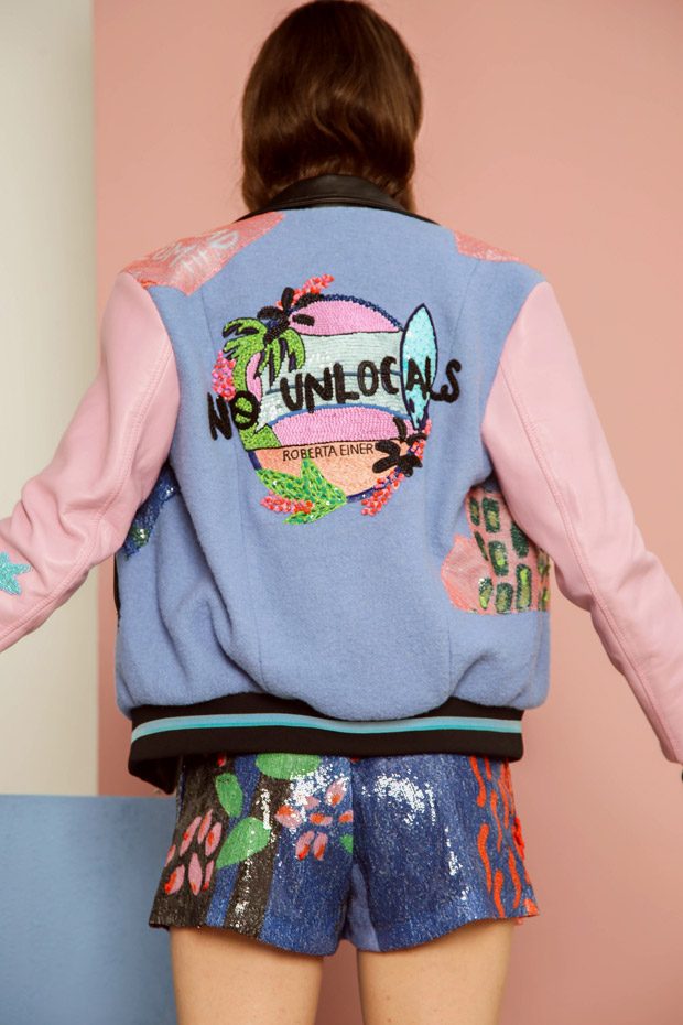 Collection takes her signatures, such as the bomber and a shimmering bright pal-ette, and translates it into all things beach-bound: palm and sea-life motifs; poolside patches and sten-cilled slogans; wide-leg palazzo trousers and flowing off-cut dresses with waves crashing around them and even a zip construction that follows the same wavy wild contour. Little sassy skirts are draped to glamorous yet soft effect, jackets take on a jumpsuit sensibility with swags on the hip or on the arm; while crop tops are in crochet or mesh bugle beads. Brushstroke designs make for a nod to the raw na-ture of Pettibon’s and Basquiat’s work, notes of graffiti too, while a series of oversized T-shirts take this LA style into easy-to-wear territory.“