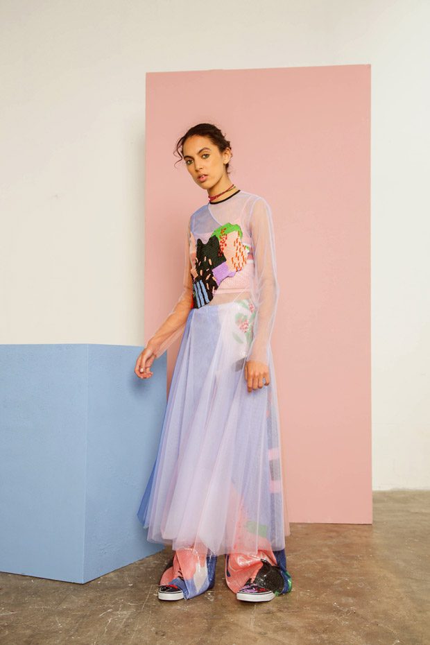 Estonian designer Roberta Einer presented her Spring Summer 2018 womenswear collection, inspired by California’a seventies and eighties skate sketches, surf slogans, and graphics, during the recently finished London Fashion Week.