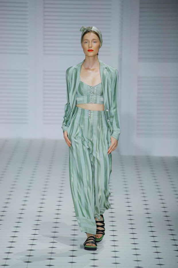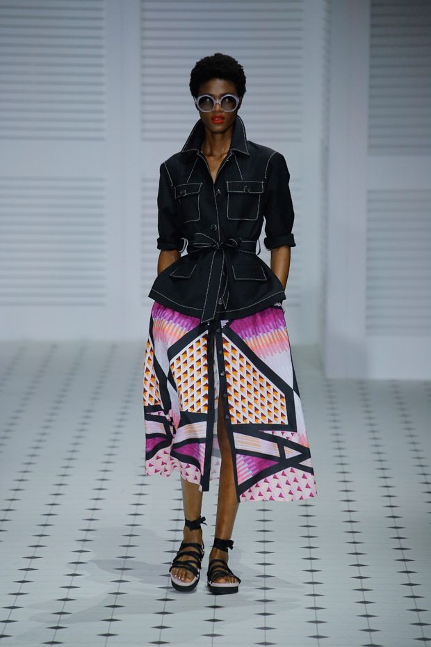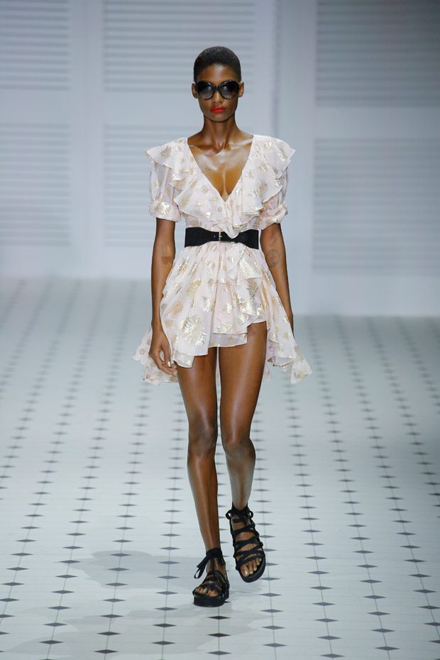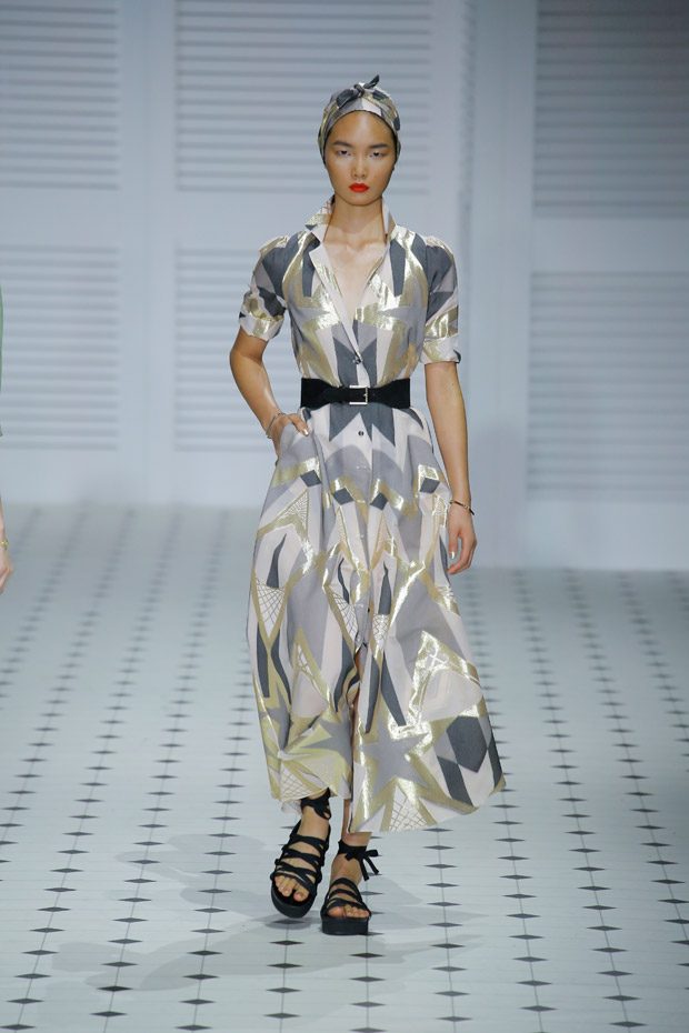 Cinched in, feminine waists paired with relaxed, rolled sleeves feature throughout the collection, creating an overtly feminine silhouette reminiscent of 1950’s sirens. Languid wide legged culottes, buttoned bodice jumpsuits and cotton tailored jackets paired with calf grazing dresses and skirts adorned with diaphanous frills.“
